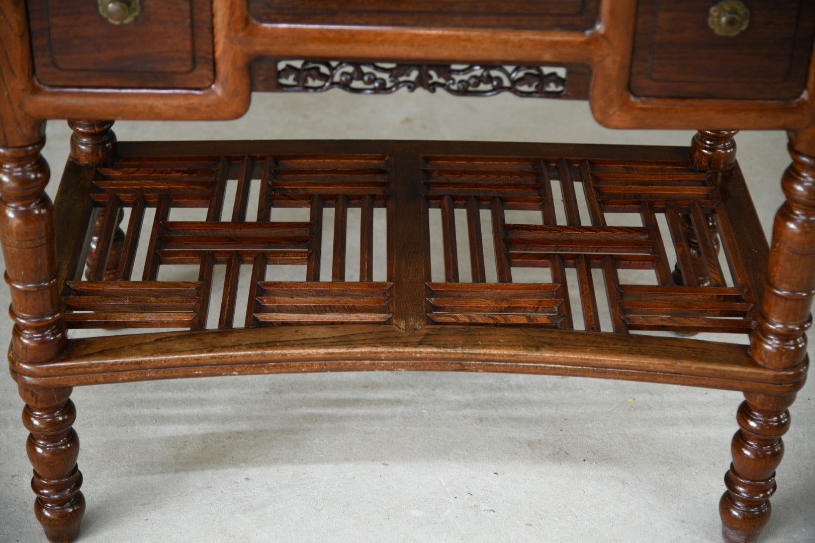Anglo Asian Washstand Swing Mirror Back. Late 19th Century freestanding washstand constructed from Asian elm & rosewood, with pierced foliate carving, the raised back with an oval framed mirror on turned supports with turned finials above a three quarter balustrade gallery with finials, the lower part with a rectangular top and a brass bowl inset, the frieze with a central panel flanked by a pair of drawers, on turned legs joined by a trellis pattern under tier.