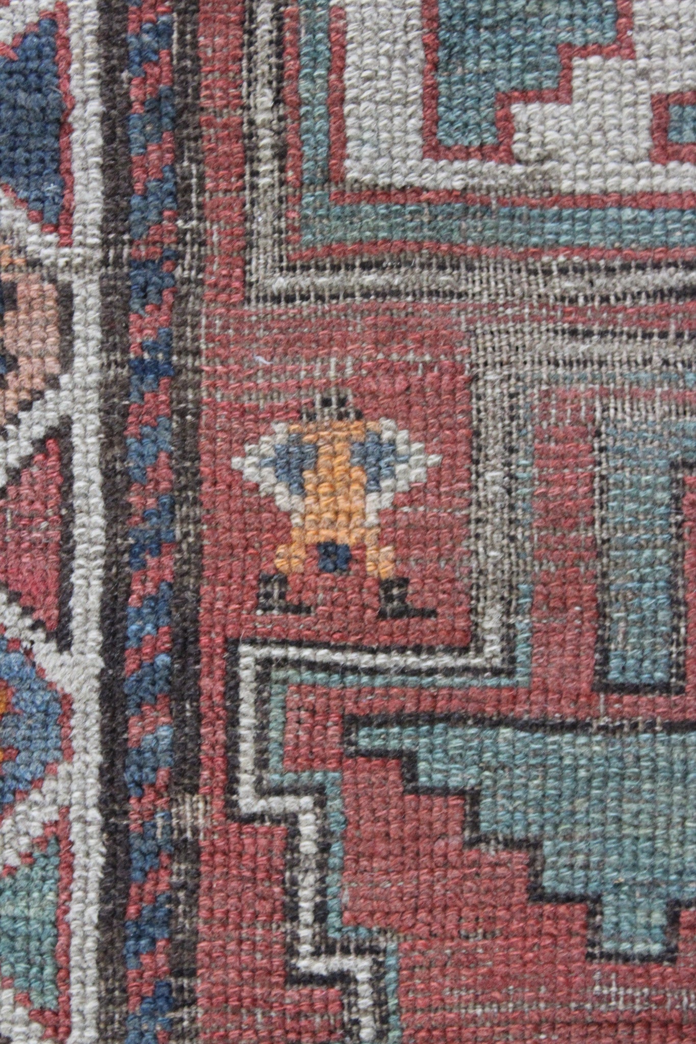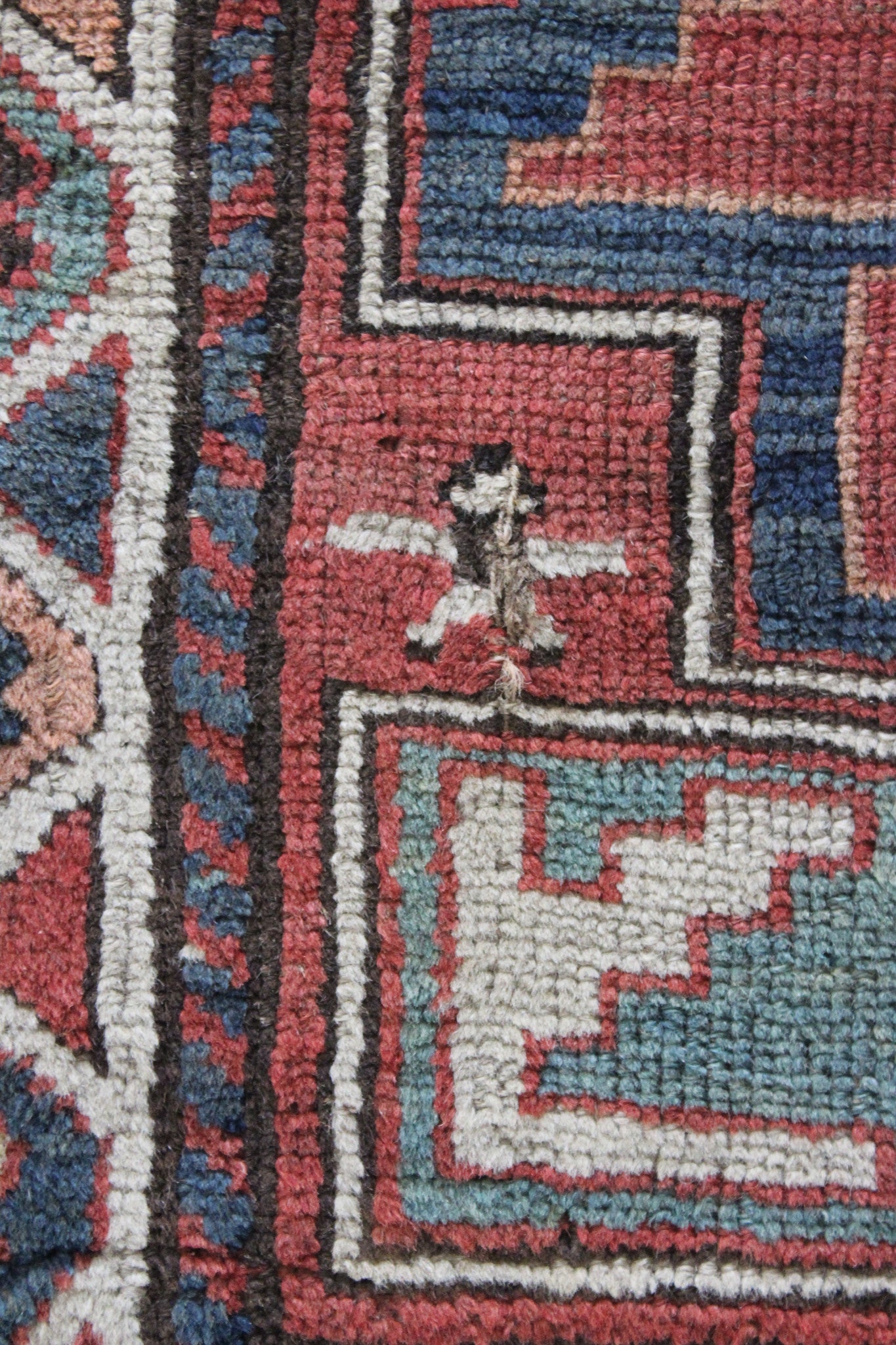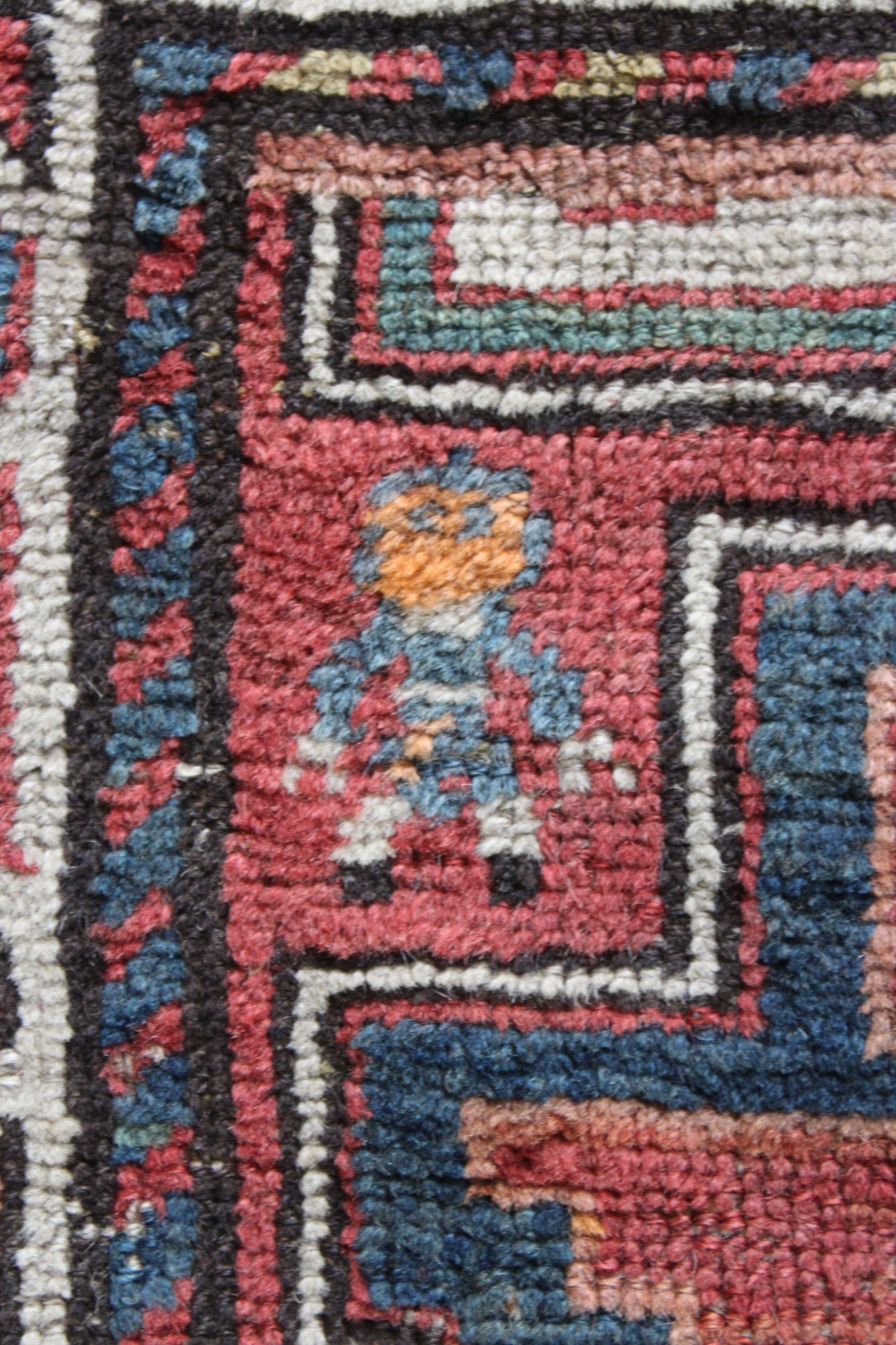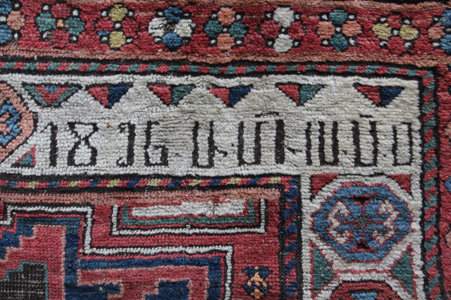 The reverse knotting detail indicates this to be of the origin as stated. The Caucasian mountainous region is made up of a number of districts, home to town and village workshops making rugs of distinctive character. Consistent with all districts, their rugs display designs drawn in a geometric style showing stylised pattern details representing both flora and fauna forms drawn in totemic form based on a Caucasian tradition dating back to the early 16th Century. This rug displays such traditional representations. Often pattern details traditional to one region or district are copied, or shared with other district weavers. This rug shows a column of central medallions, the shape and style of which are traditional and characteristic to the Shirvan District of the East Caucasus. Shirvan rugs are technically made on cotton foundations and are much finer knotted. This rug is of different construction and looser knotted consistent with Garabagh rugs. The Garabagh district is occupied by many ethnic groups including Armenians. Armenian rugs with inscriptions often display ‘Roman' numerals, which suggest a date. However, the date is spurious, which is often the case as the weavers are often illiterate. The colours used suggests that the date is not accurate. Whilst the colours are mostly vegetable dyed the orange colour is an aniline dye which began to be introduced around 1870, and was used extensively from then through to the early years of the 20th Century. The colours here certainly indicate a pre 1900 date, and suggest that the date should read 1896 perhaps.