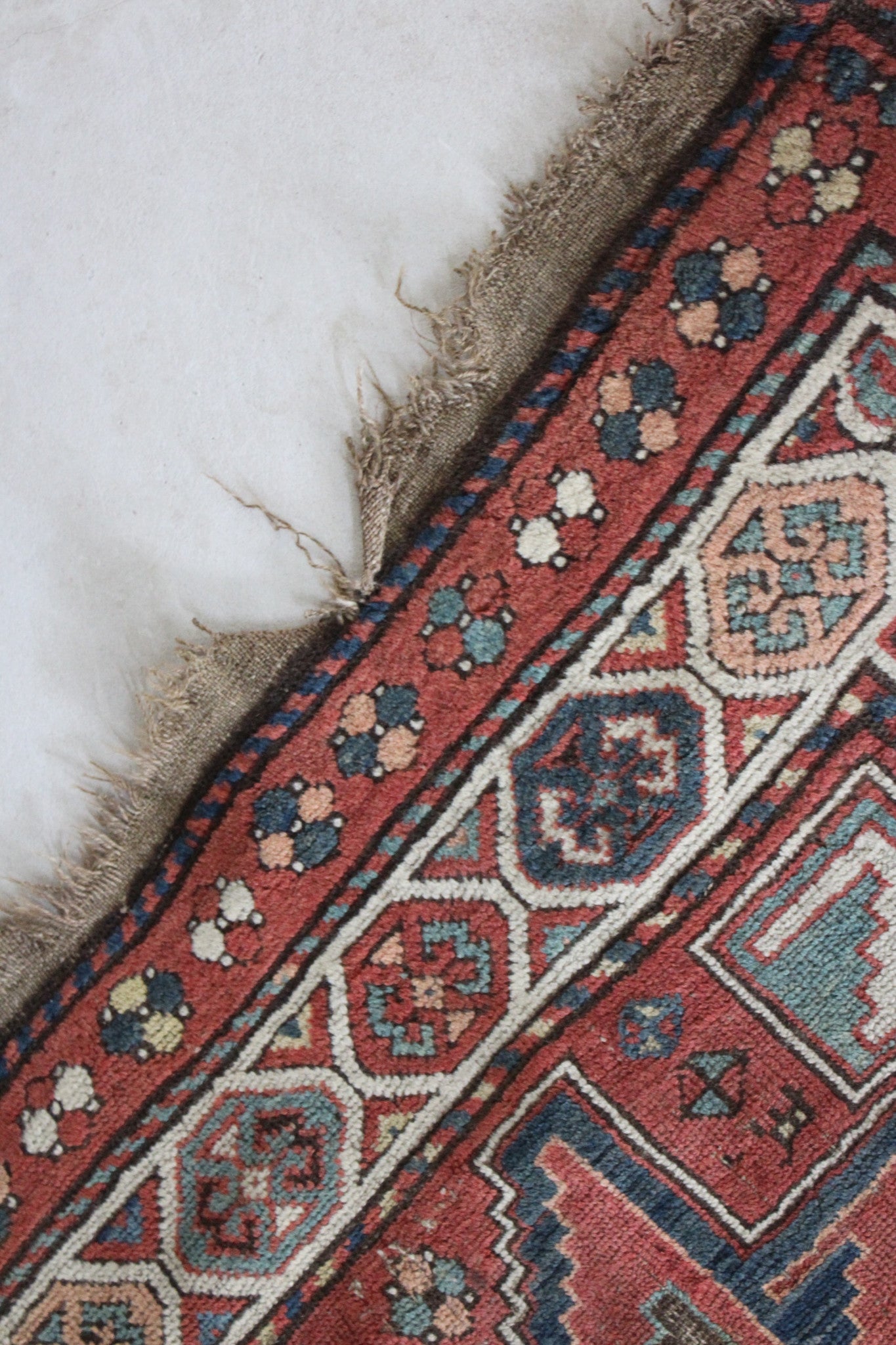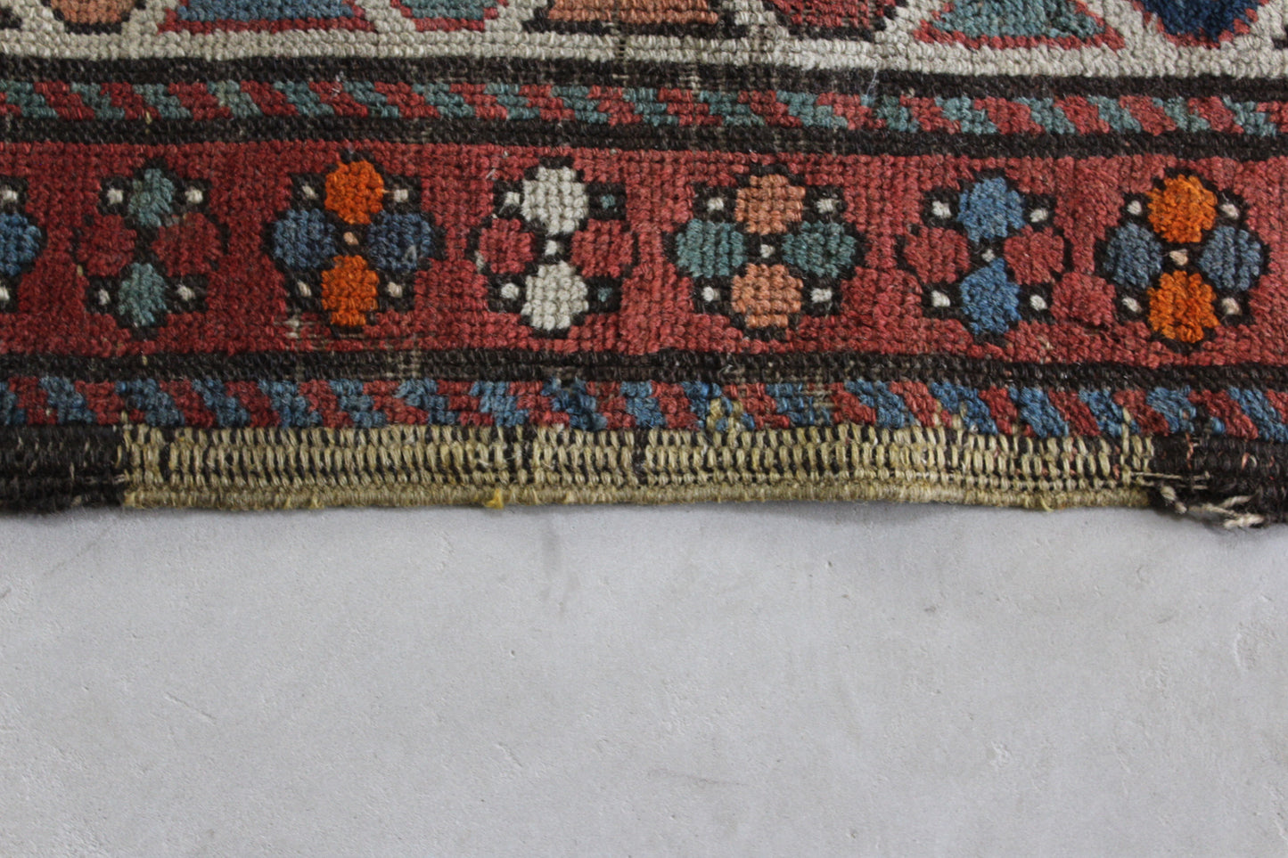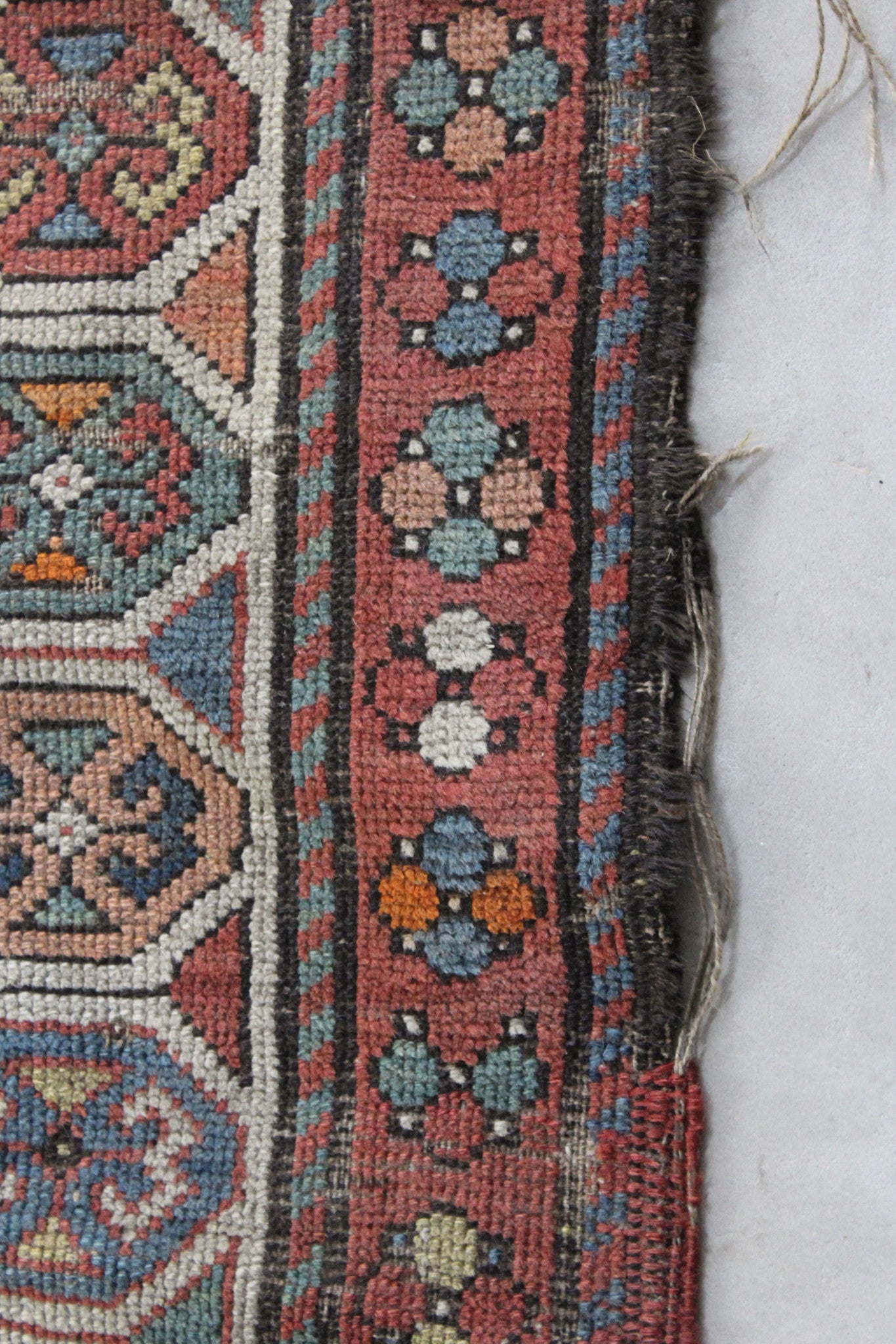 The reverse knotting detail indicates this to be of the origin as stated. The Caucasian mountainous region is made up of a number of districts, home to town and village workshops making rugs of distinctive character. Consistent with all districts, their rugs display designs drawn in a geometric style showing stylised pattern details representing both flora and fauna forms drawn in totemic form based on a Caucasian tradition dating back to the early 16th Century. This rug displays such traditional representations. Often pattern details traditional to one region or district are copied, or shared with other district weavers. This rug shows a column of central medallions, the shape and style of which are traditional and characteristic to the Shirvan District of the East Caucasus. Shirvan rugs are technically made on cotton foundations and are much finer knotted. This rug is of different construction and looser knotted consistent with Garabagh rugs. The Garabagh district is occupied by many ethnic groups including Armenians. Armenian rugs with inscriptions often display ‘Roman' numerals, which suggest a date. However, the date is spurious, which is often the case as the weavers are often illiterate. The colours used suggests that the date is not accurate. Whilst the colours are mostly vegetable dyed the orange colour is an aniline dye which began to be introduced around 1870, and was used extensively from then through to the early years of the 20th Century. The colours here certainly indicate a pre 1900 date, and suggest that the date should read 1896 perhaps.