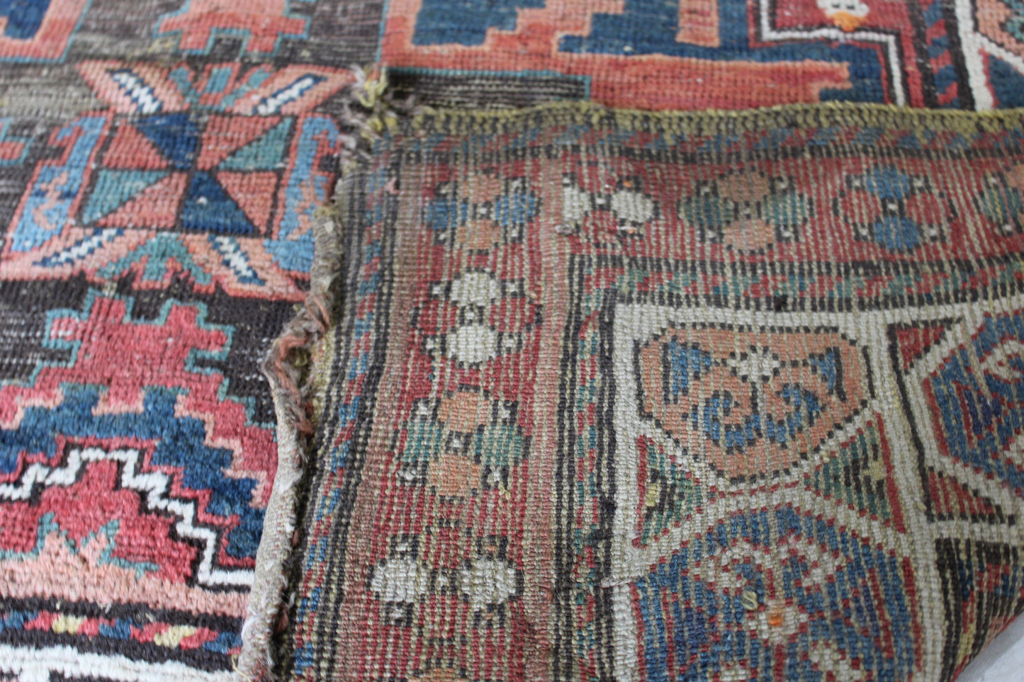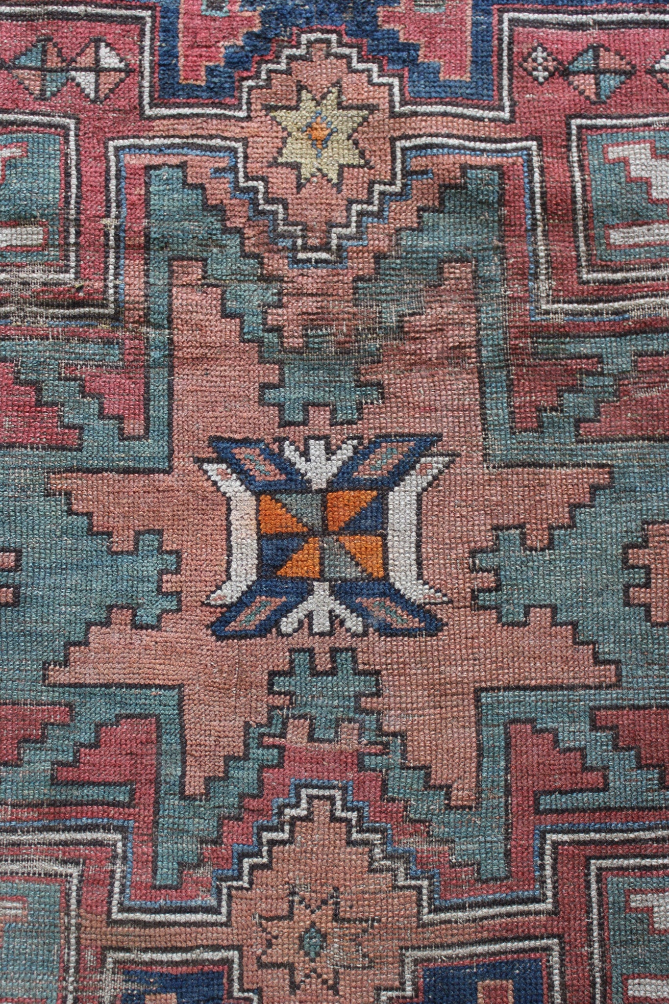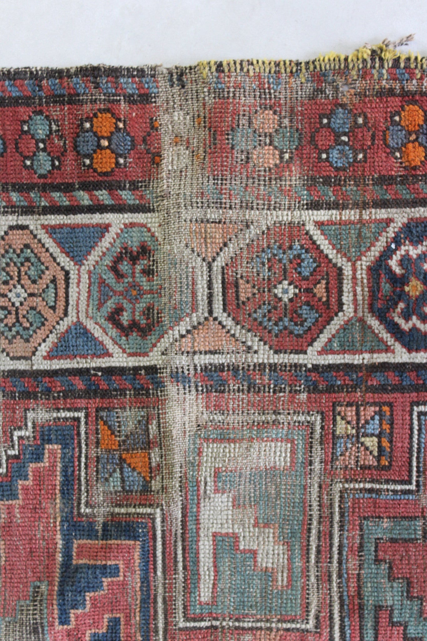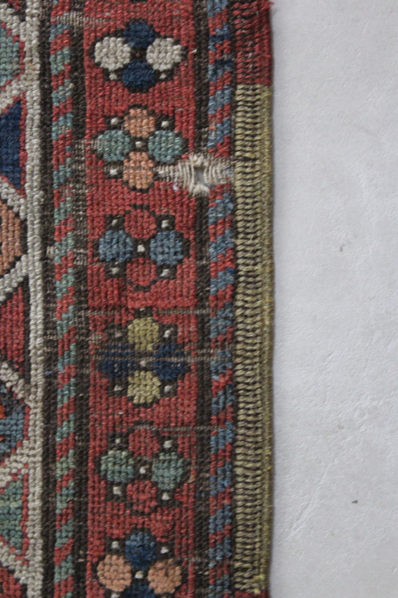 The reverse knotting detail indicates this to be of the origin as stated. The Caucasian mountainous region is made up of a number of districts, home to town and village workshops making rugs of distinctive character. Consistent with all districts, their rugs display designs drawn in a geometric style showing stylised pattern details representing both flora and fauna forms drawn in totemic form based on a Caucasian tradition dating back to the early 16th Century. This rug displays such traditional representations. Often pattern details traditional to one region or district are copied, or shared with other district weavers. This rug shows a column of central medallions, the shape and style of which are traditional and characteristic to the Shirvan District of the East Caucasus. Shirvan rugs are technically made on cotton foundations and are much finer knotted. This rug is of different construction and looser knotted consistent with Garabagh rugs. The Garabagh district is occupied by many ethnic groups including Armenians. Armenian rugs with inscriptions often display ‘Roman' numerals, which suggest a date. However, the date is spurious, which is often the case as the weavers are often illiterate. The colours used suggests that the date is not accurate. Whilst the colours are mostly vegetable dyed the orange colour is an aniline dye which began to be introduced around 1870, and was used extensively from then through to the early years of the 20th Century. The colours here certainly indicate a pre 1900 date, and suggest that the date should read 1896 perhaps.