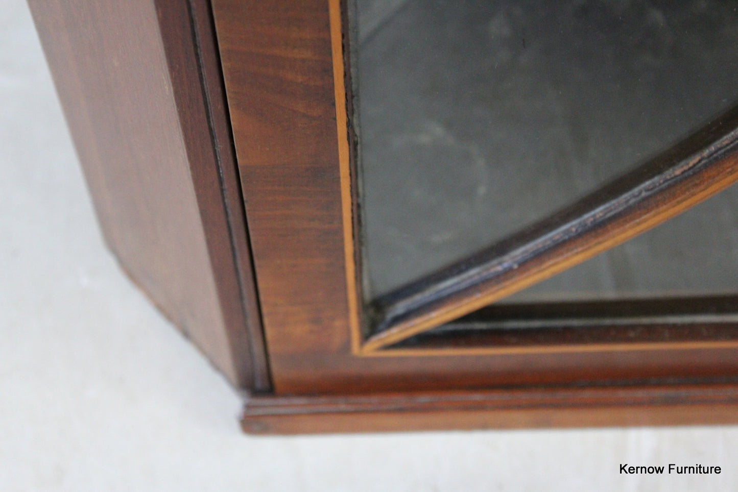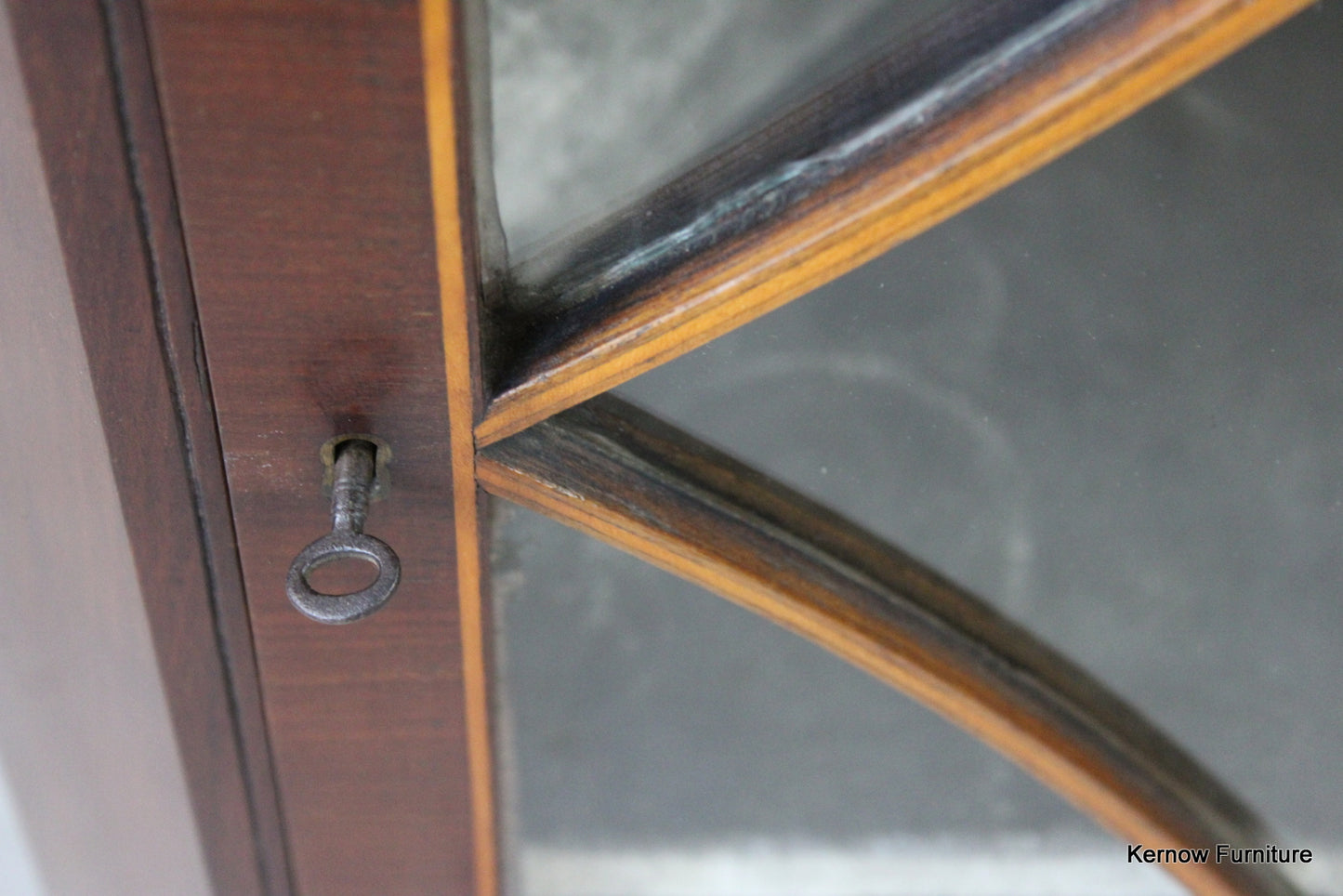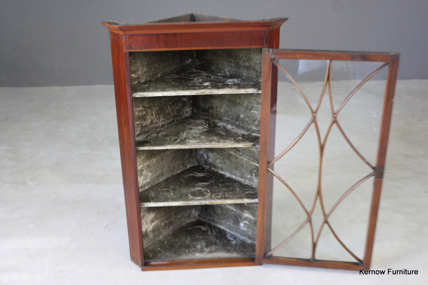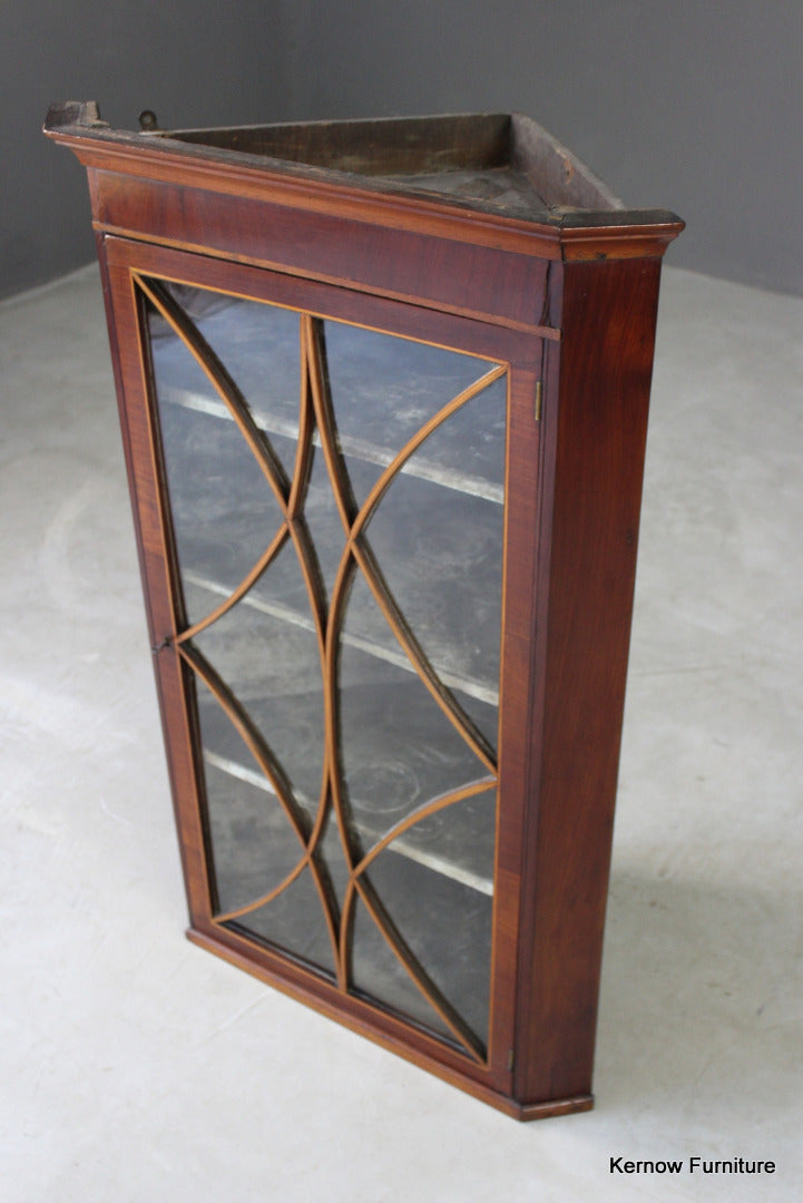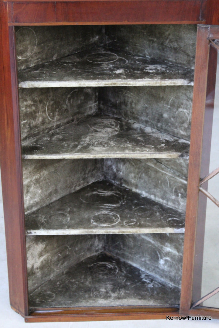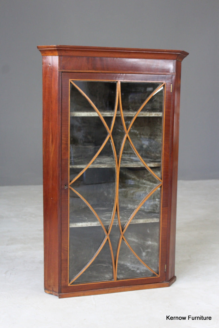 Antique astragal glazed corner cabinet. 19th Century inlaid mahogany hanging corner cabinet with lined interior & astragal glazed door.