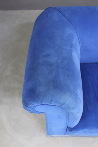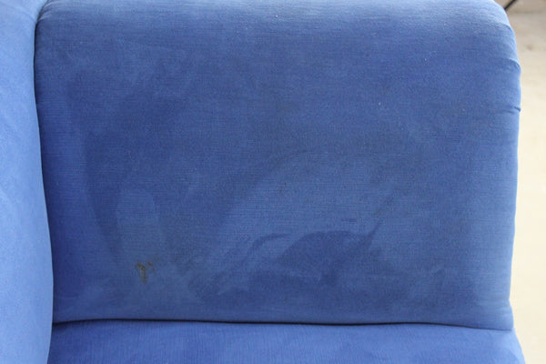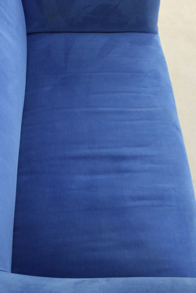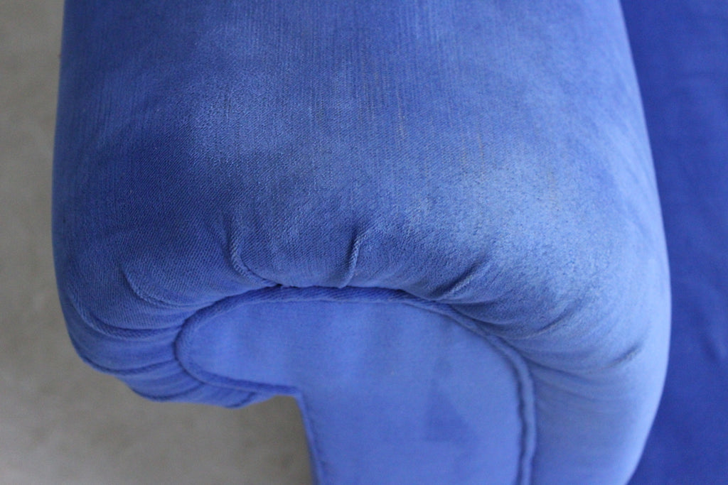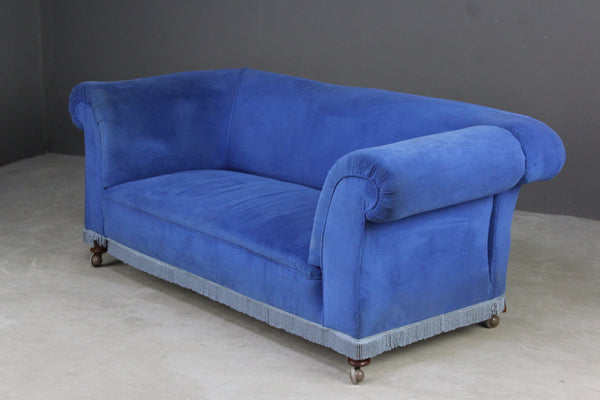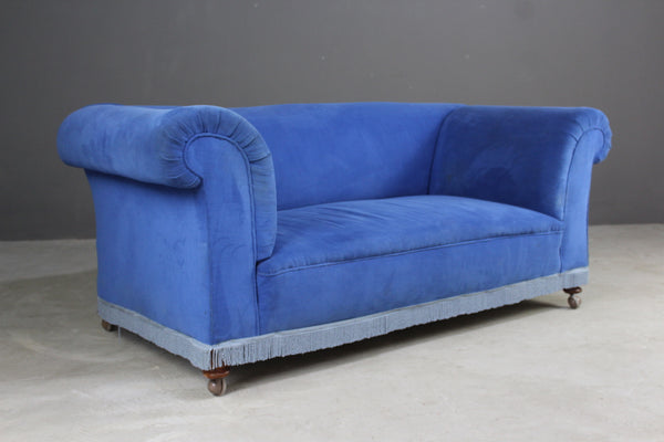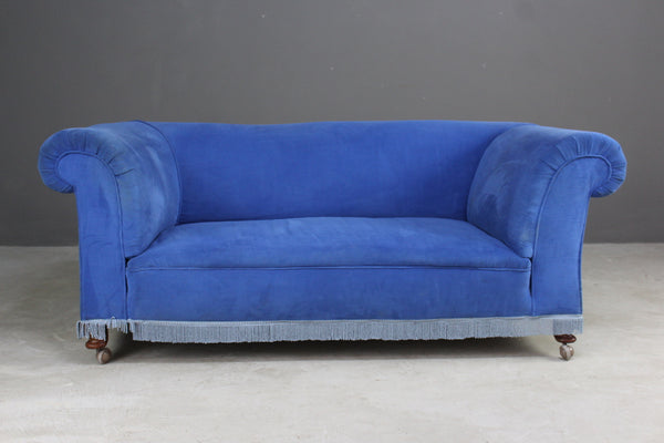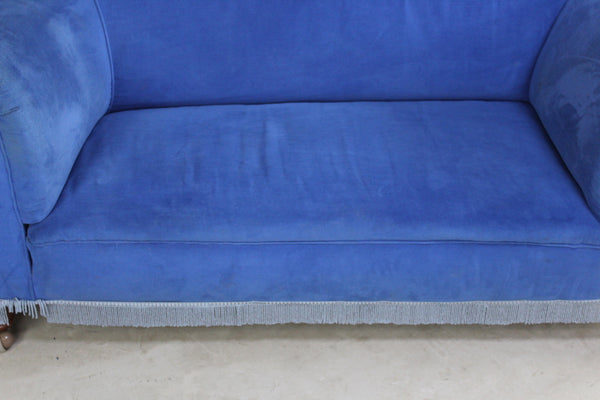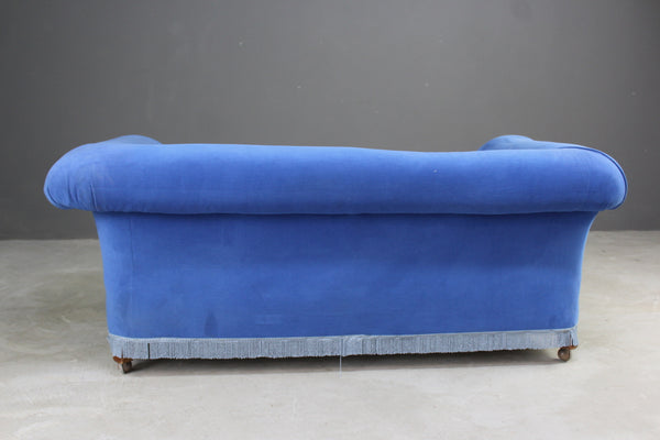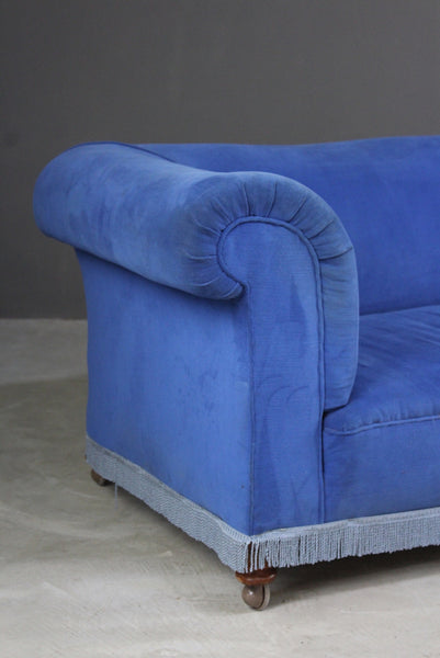 Antique blue upholstered sofa. Early 20th Century chesterfield style sofa. Upholstered in blue dralon, sprung seat on small cabriole legs and later gypsy castors.
