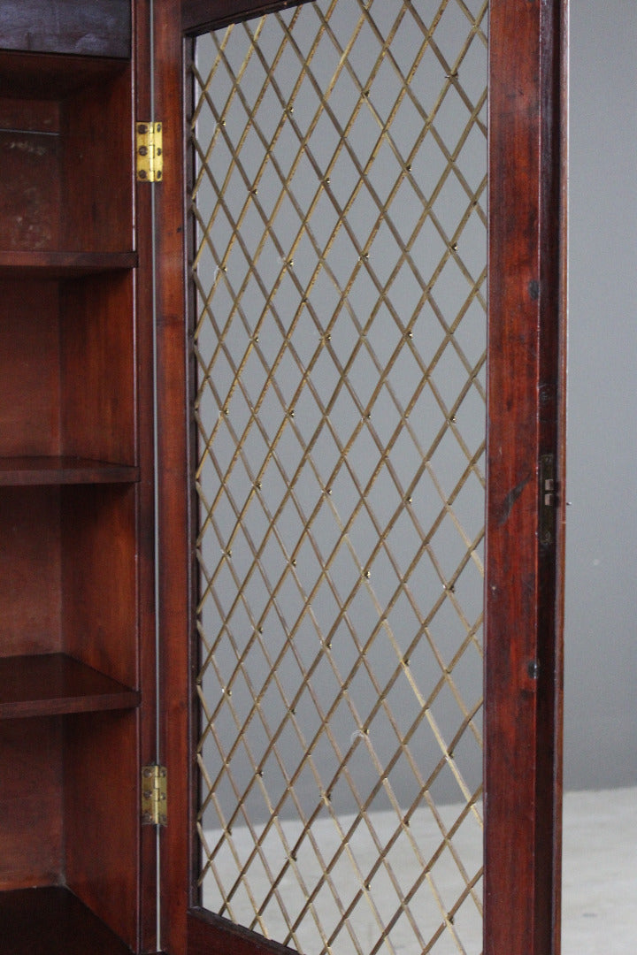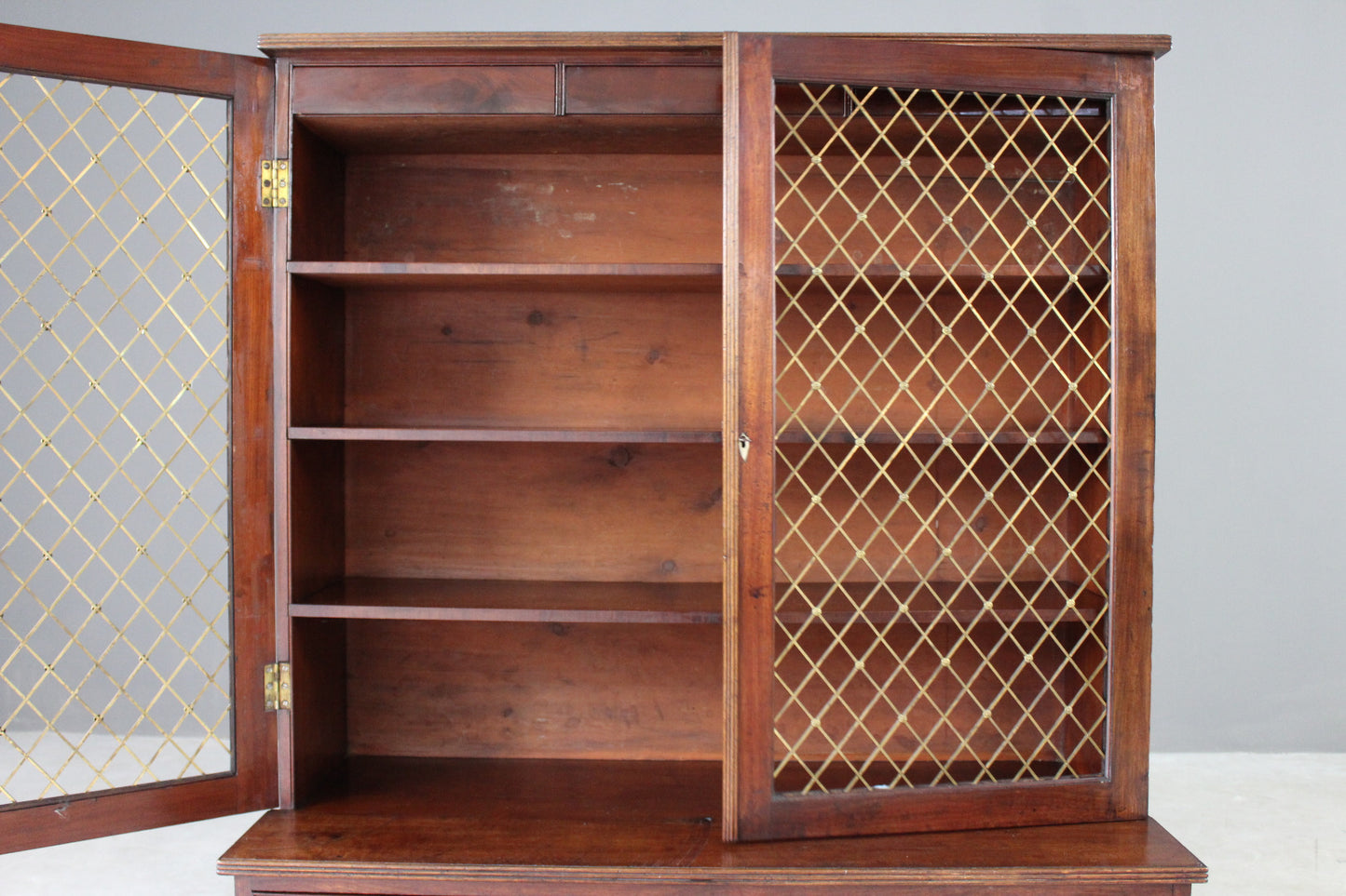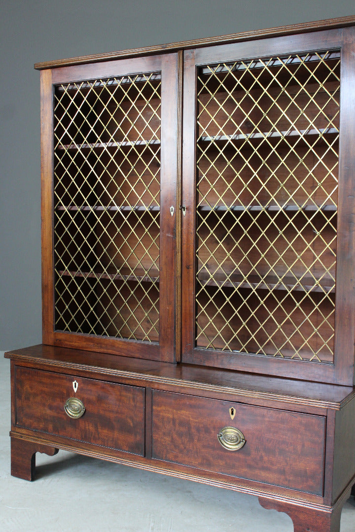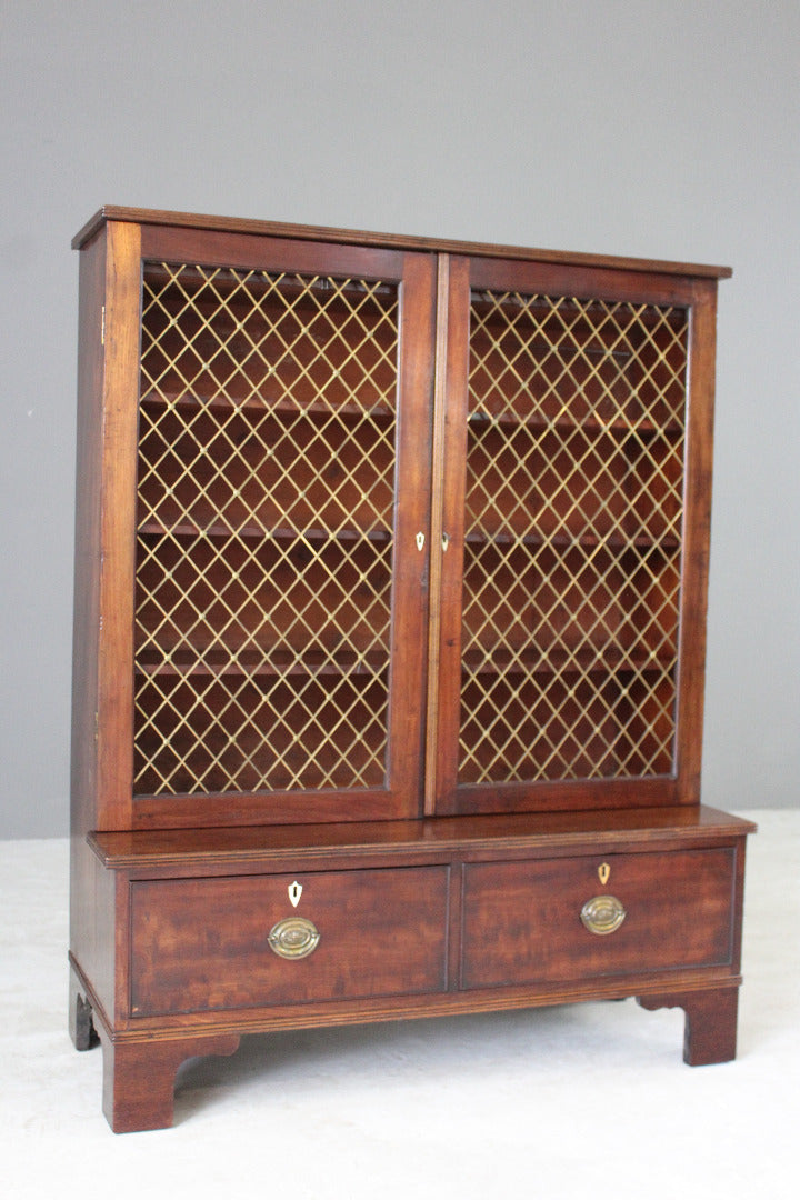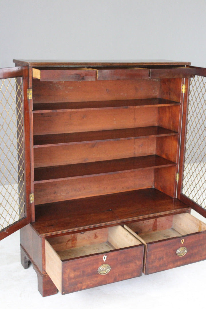 Antique mahogany bookcase. Antique 19th Century mahogany bookcase with pair of hinged doors with brass grills, three fixed internal shelves & three small internal drawers at the top of the cupboard. Pair of short drawers below with bone escutcheons and later pressed brass handles.