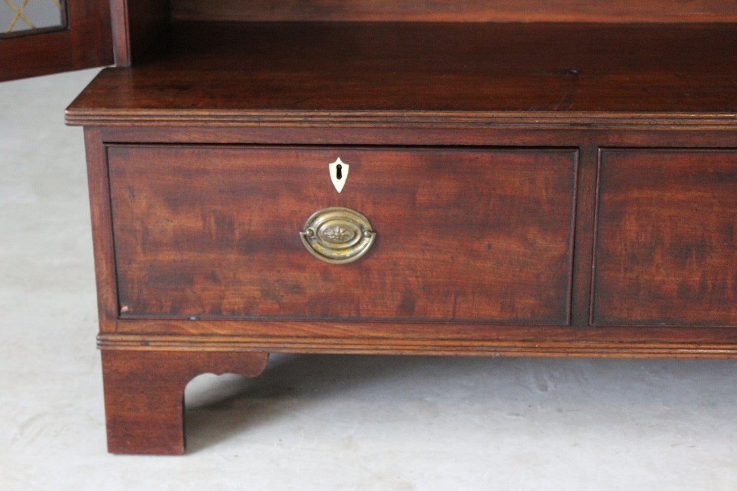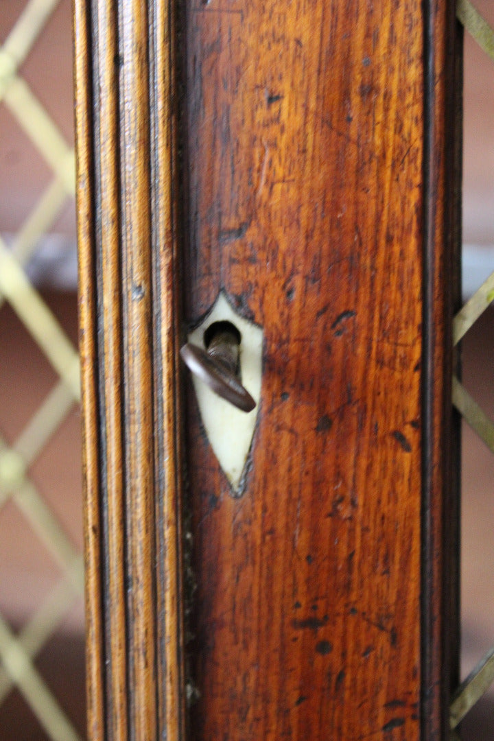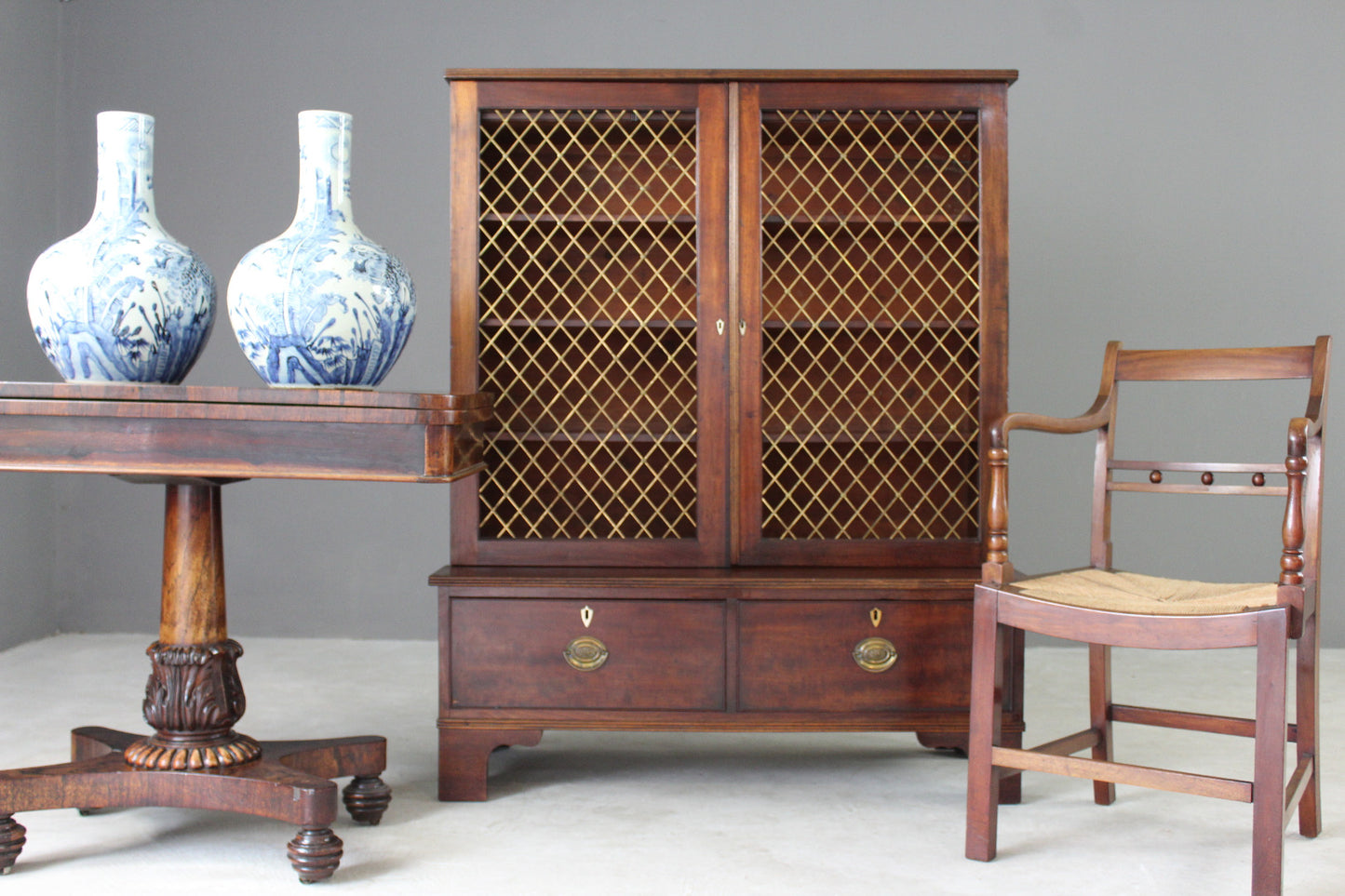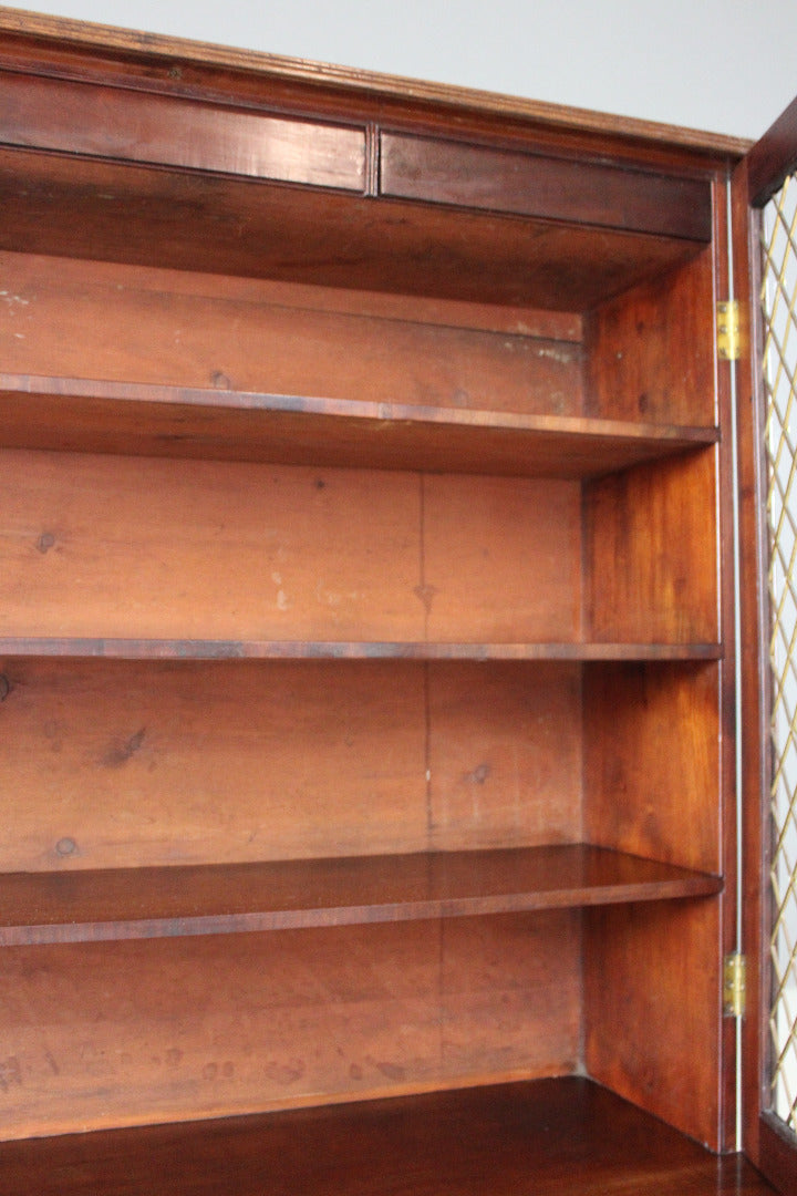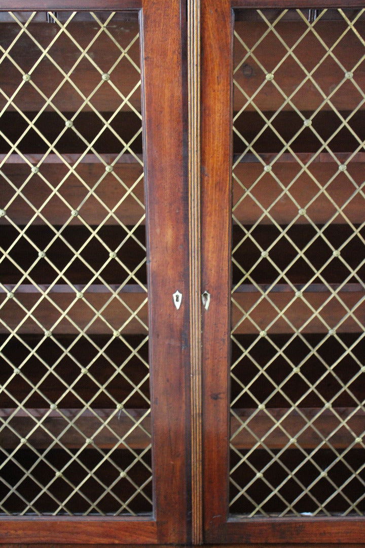 Antique mahogany bookcase. Antique 19th Century mahogany bookcase with pair of hinged doors with brass grills, three fixed internal shelves & three small internal drawers at the top of the cupboard. Pair of short drawers below with bone escutcheons and later pressed brass handles.