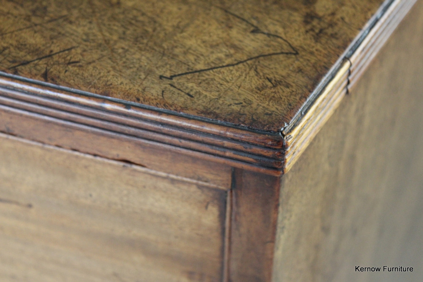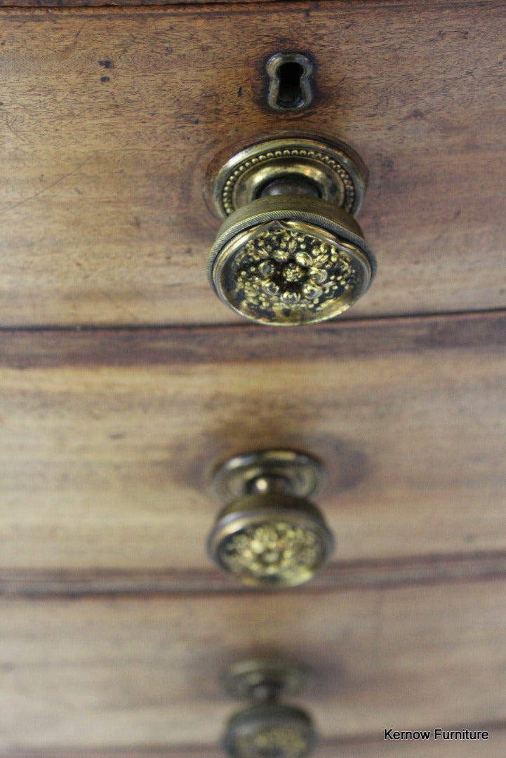 Condition: Solid condition, some chips and losses to the veneer, some replacement edging around the top, age and tarnishing to the handles, some have been knocked and dented a little. repair to the underneath of the bottom drawer.