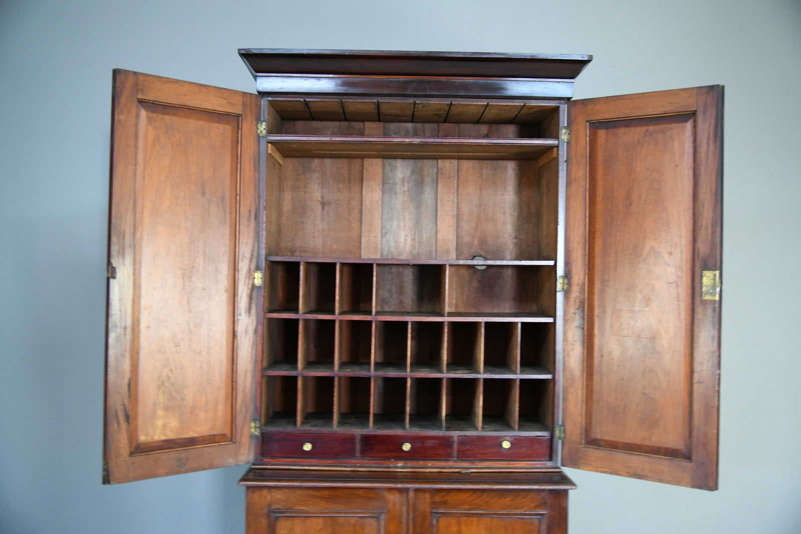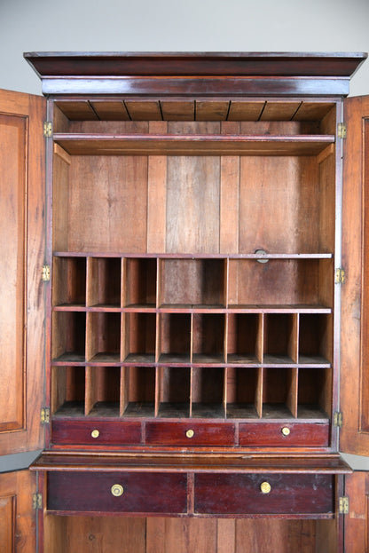 Antique Mahogany Housekeepers / Estate Cupboard. 19th Century mahogany two-section estate cupboard, the pair of doors enclosing pigeonholes and three small drawers, the base with two hinged doors enclosing two drawers and a shelf upon plinth base