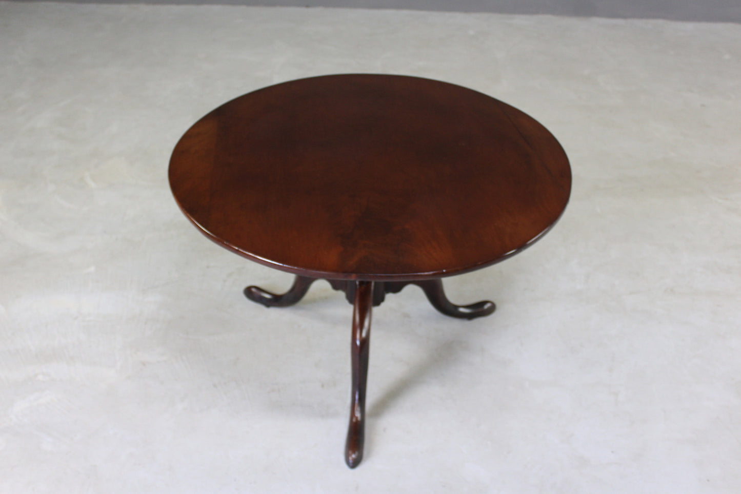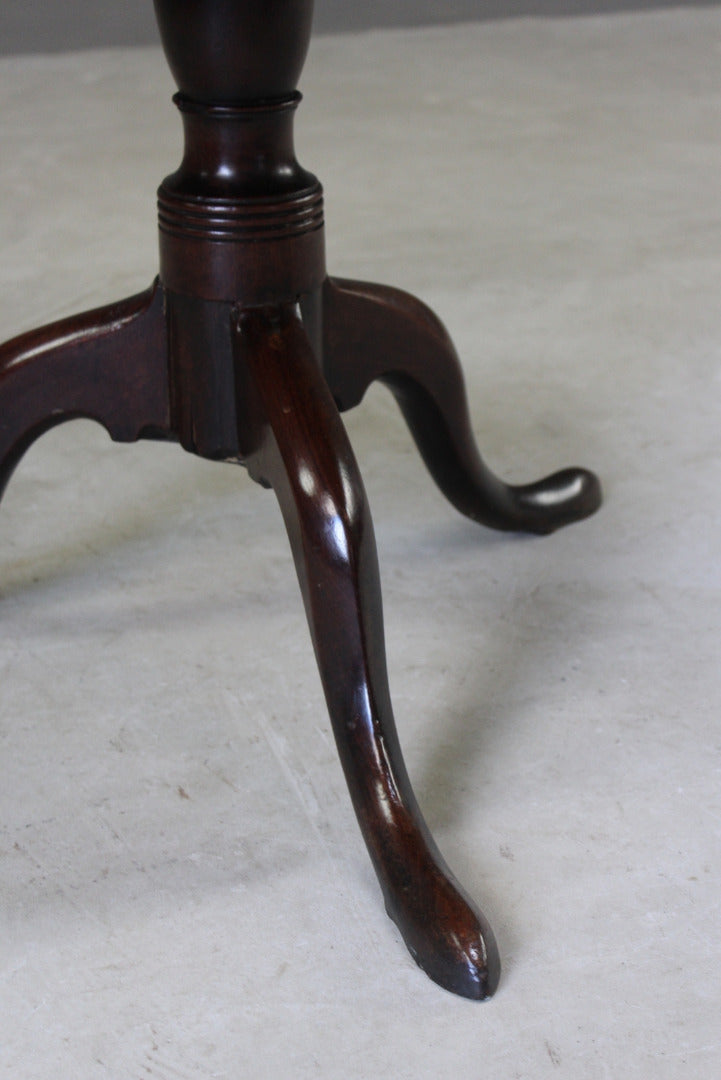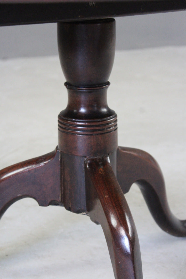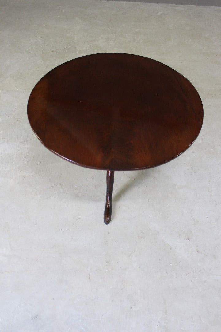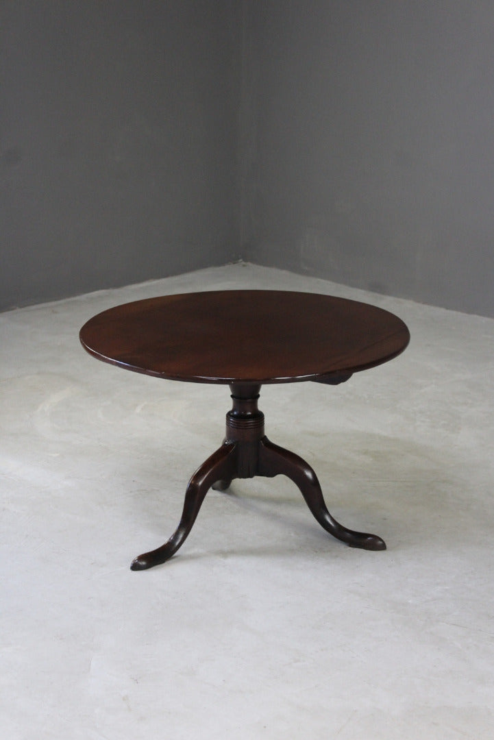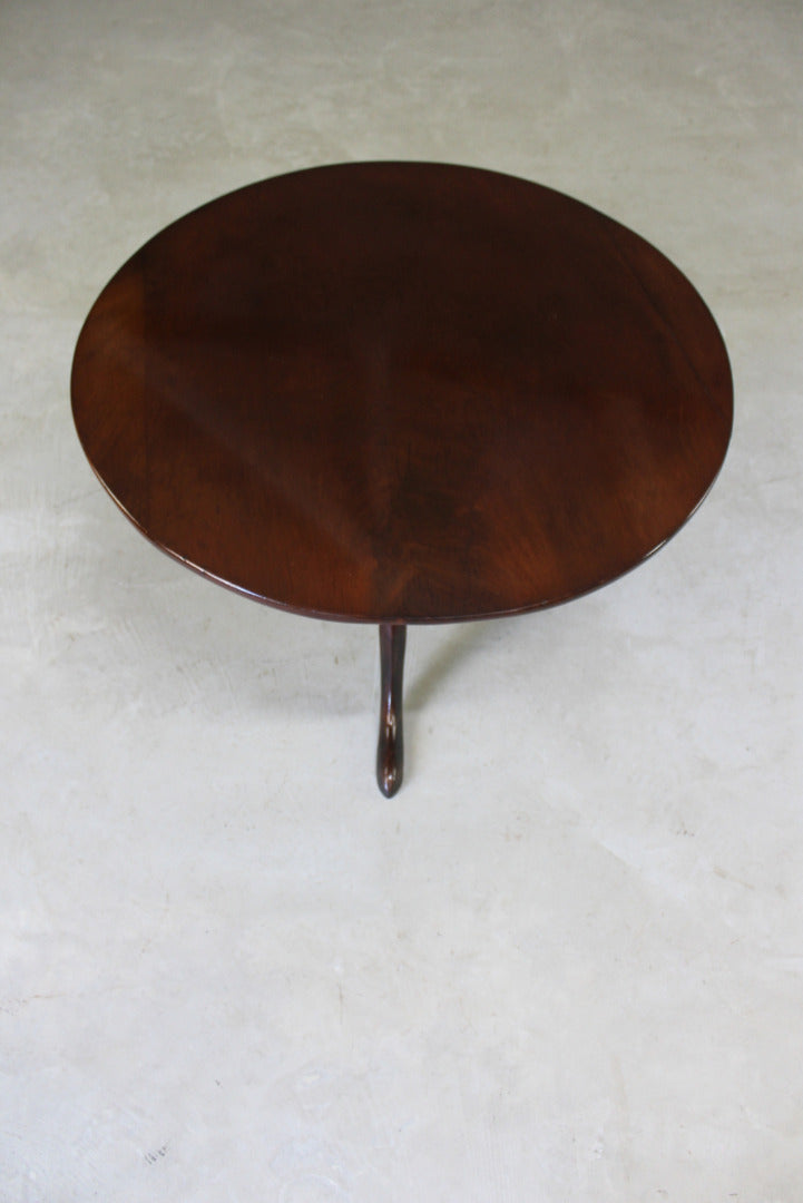 Antique mahogany round coffee table. 19th Century mahogany tea table which has been reduced to coffee table height. Solid mahogany round top on turned column & tripod base.