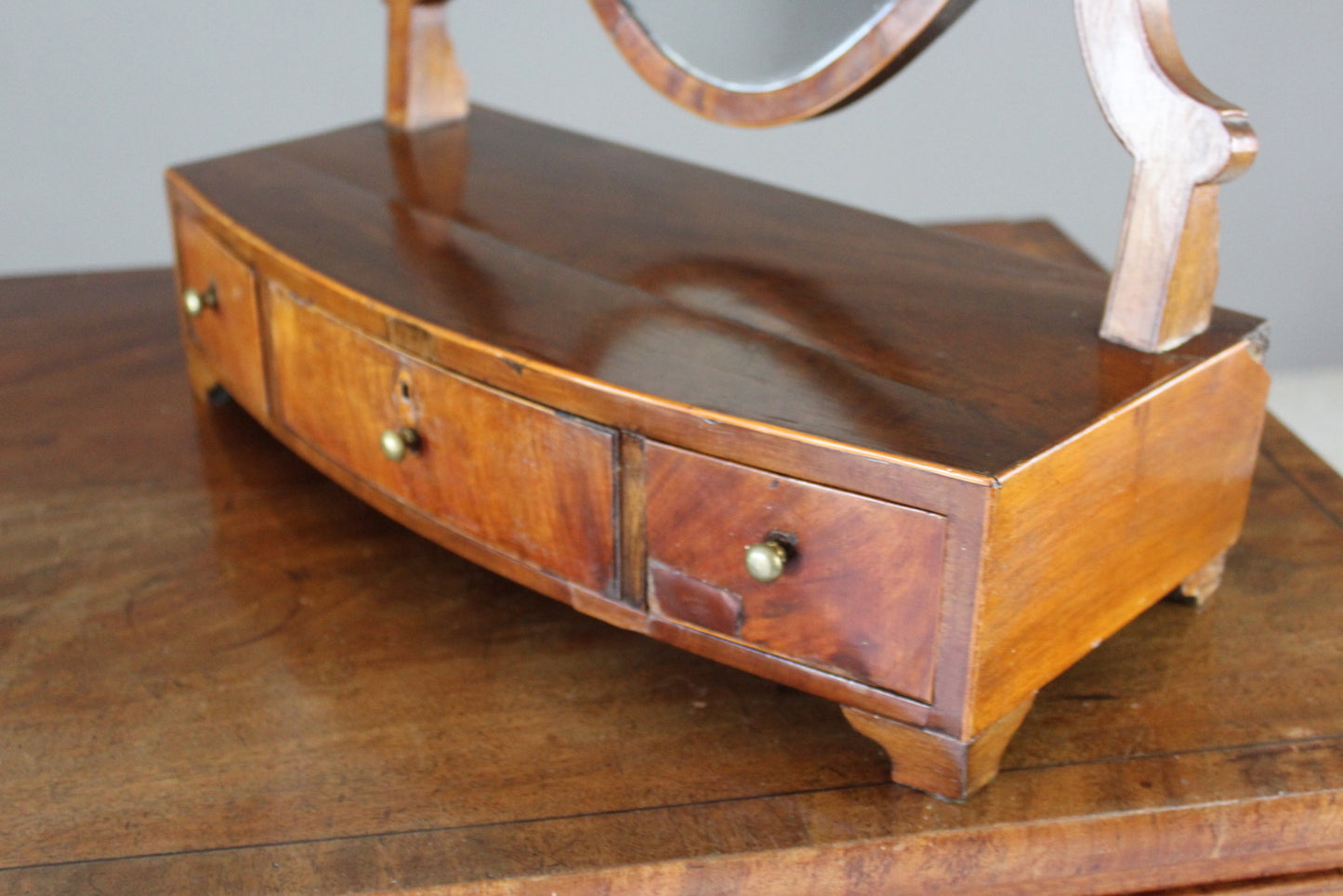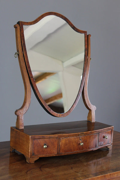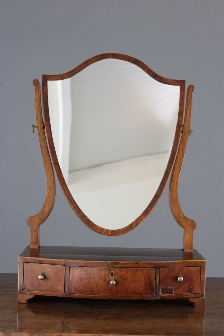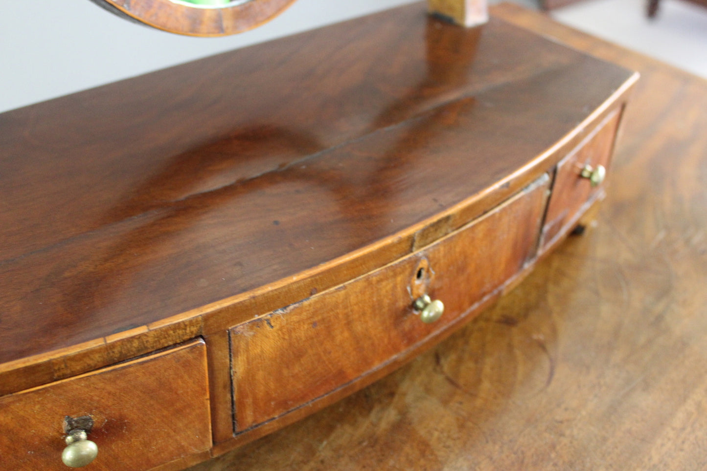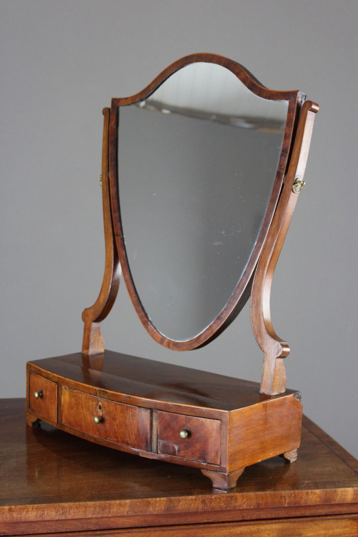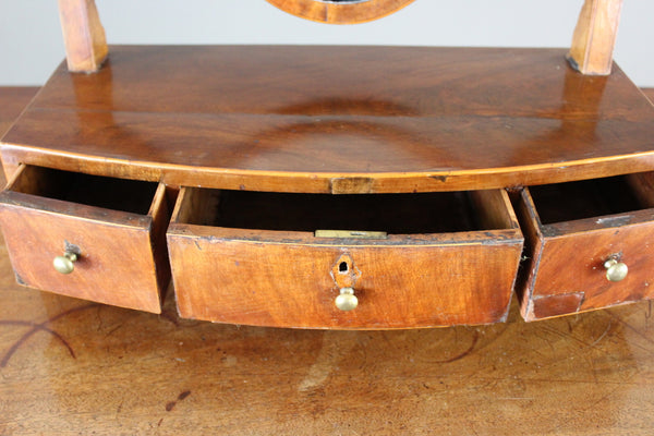 Antique Mahogany shield swing toilet mirror. Bow front base with three small drawers, shield shape swing mirror.