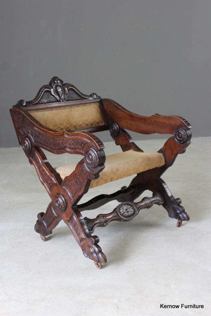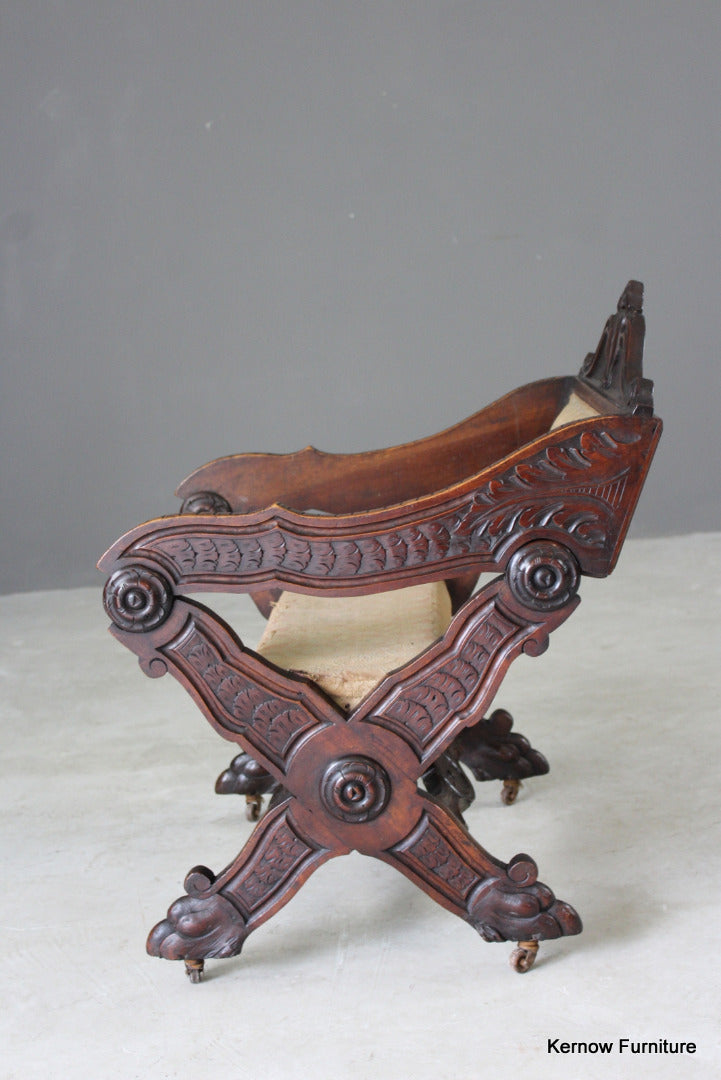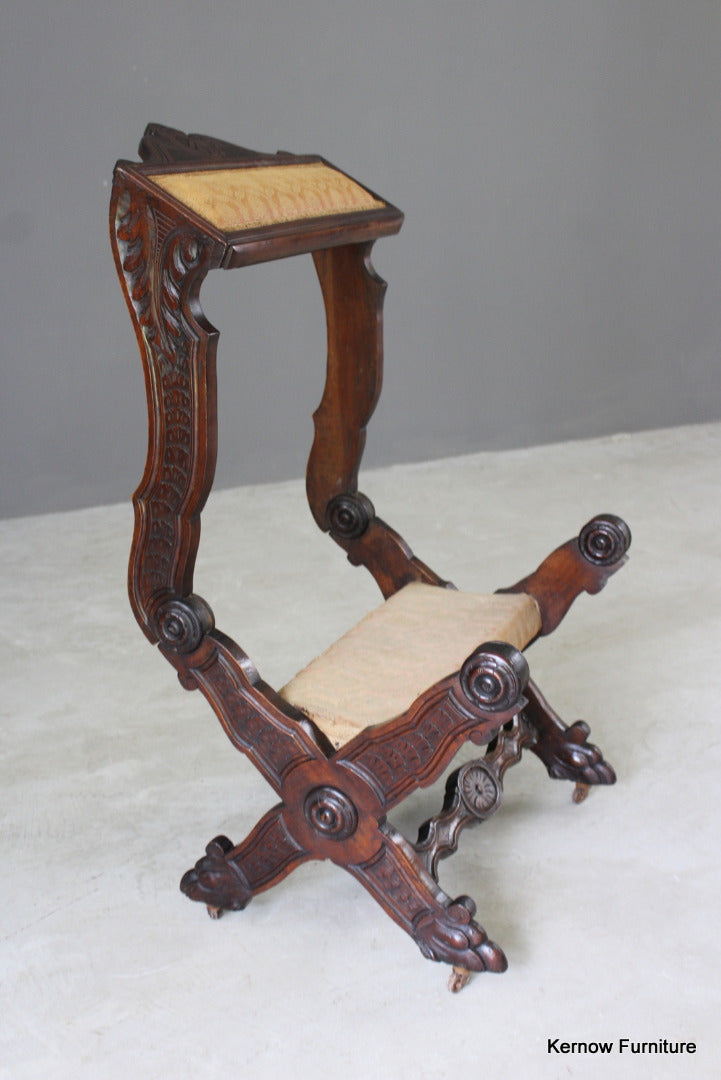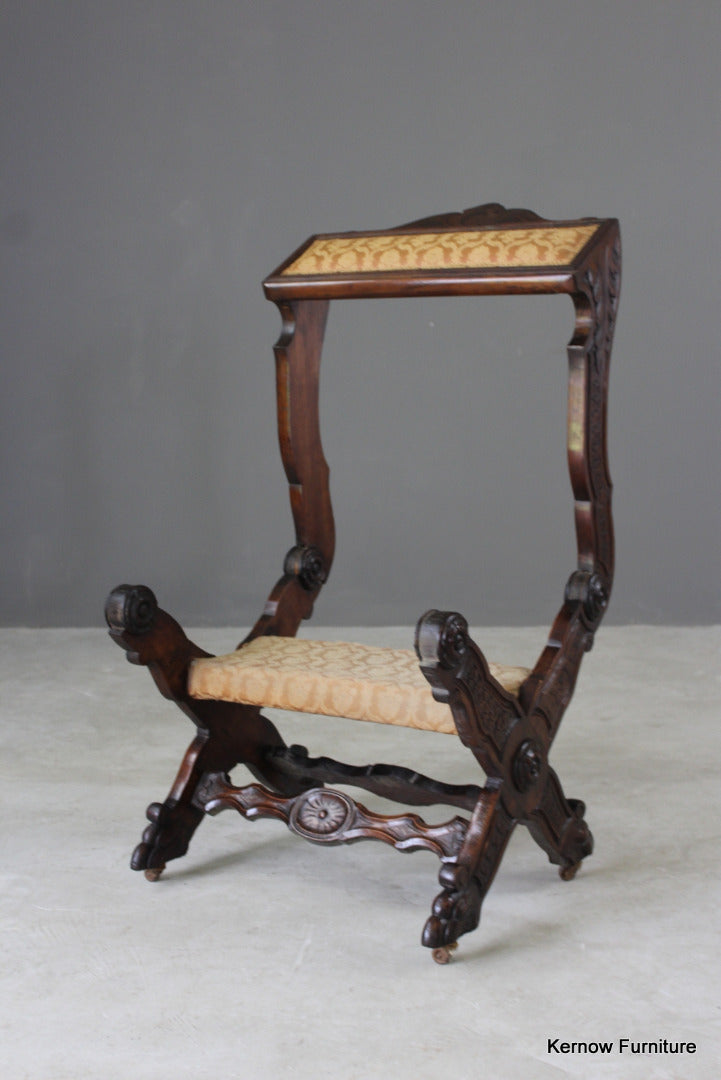Antique metamorphic Prie Dieu. 19th Century carved walnut X frame chair with upholstered seat and back, the arms hinge forward to adjust to a prayer chair.