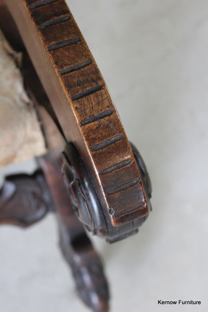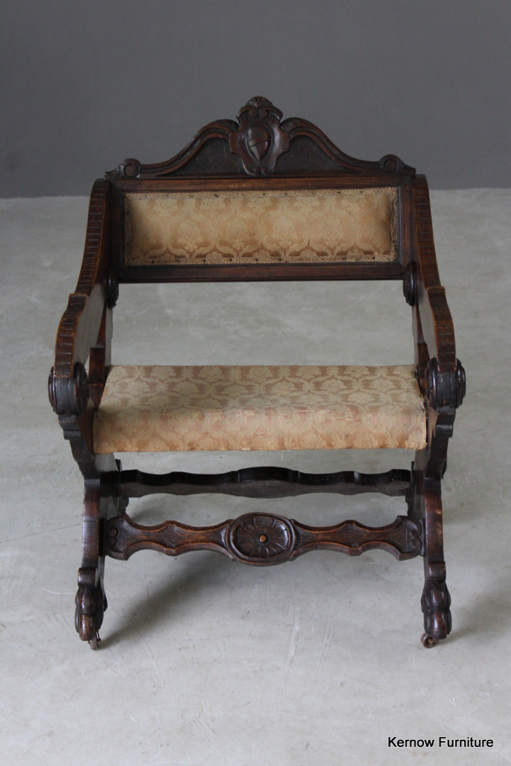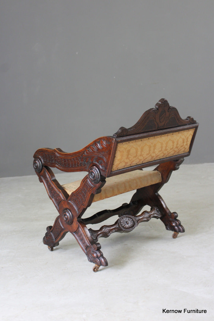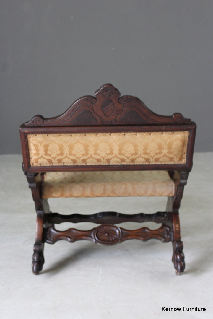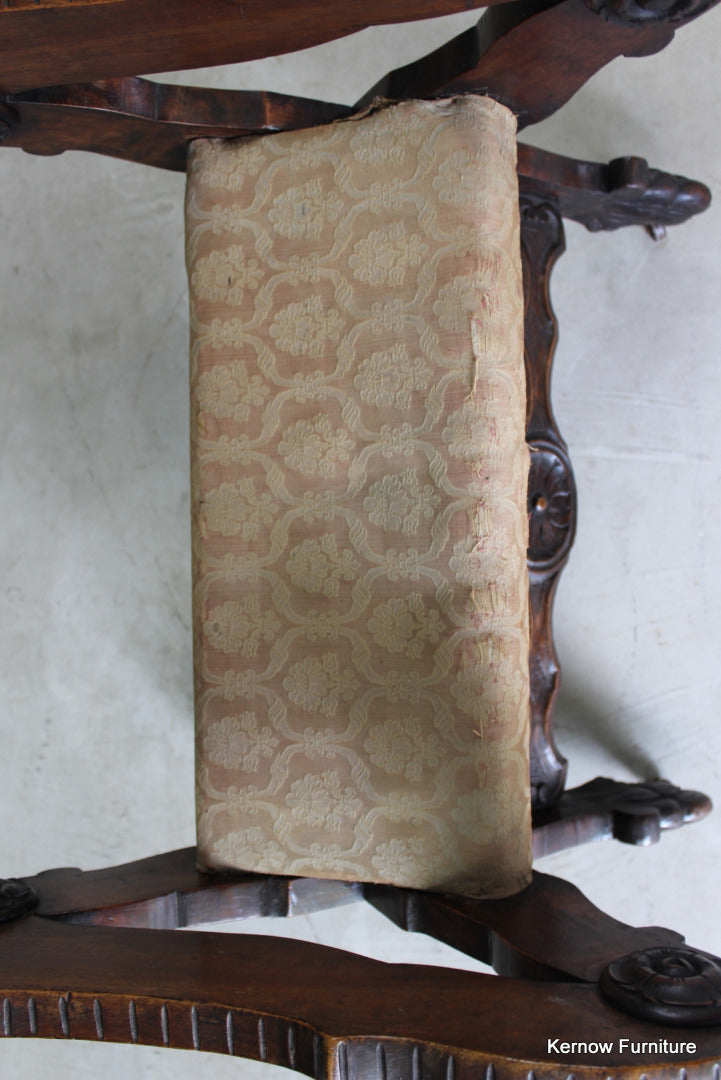Antique metamorphic Prie Dieu. 19th Century carved walnut X frame chair with upholstered seat and back, the arms hinge forward to adjust to a prayer chair.