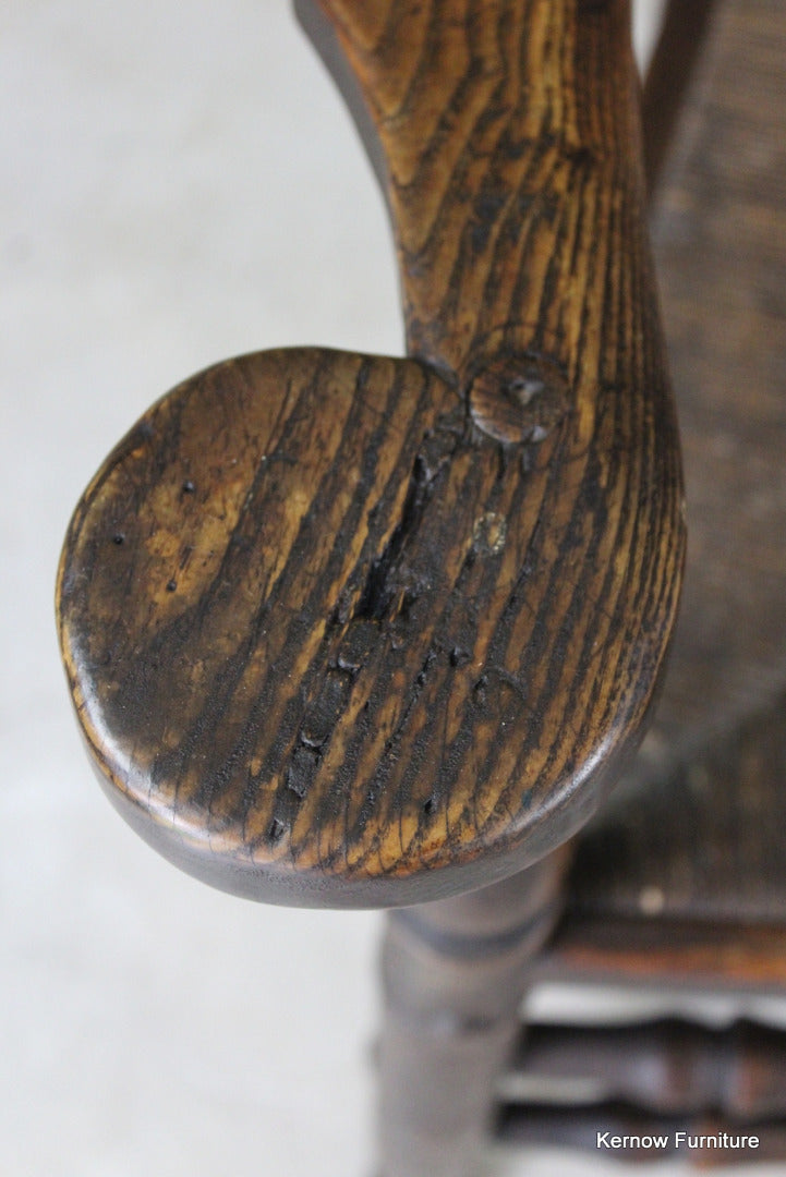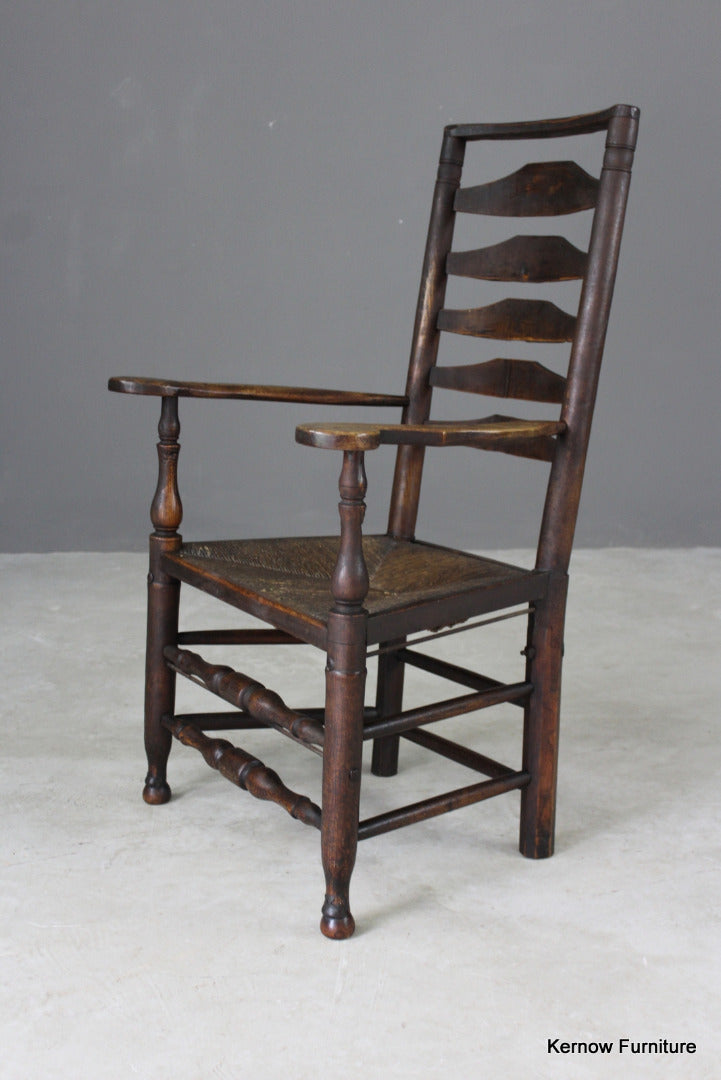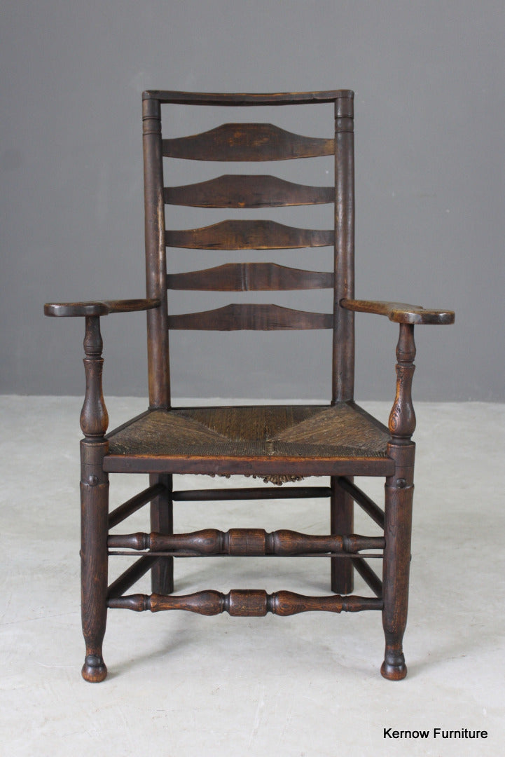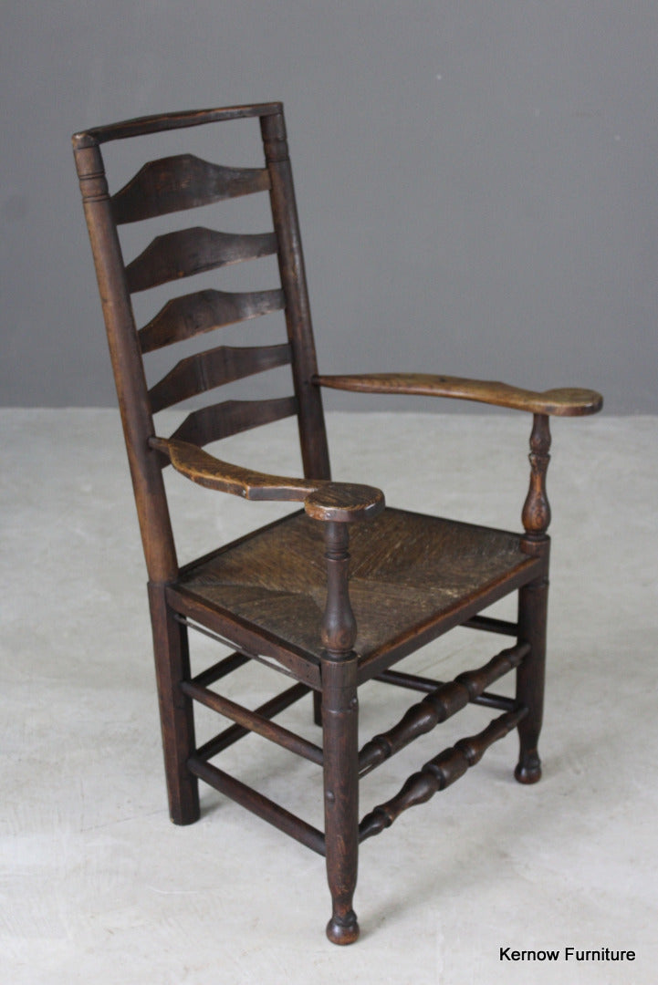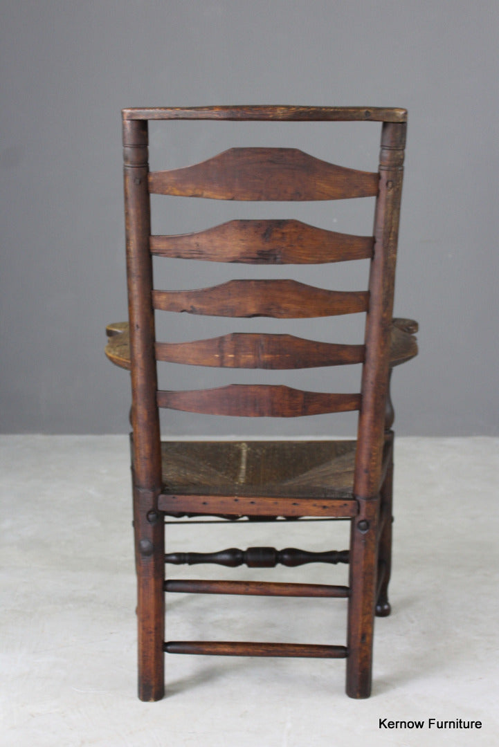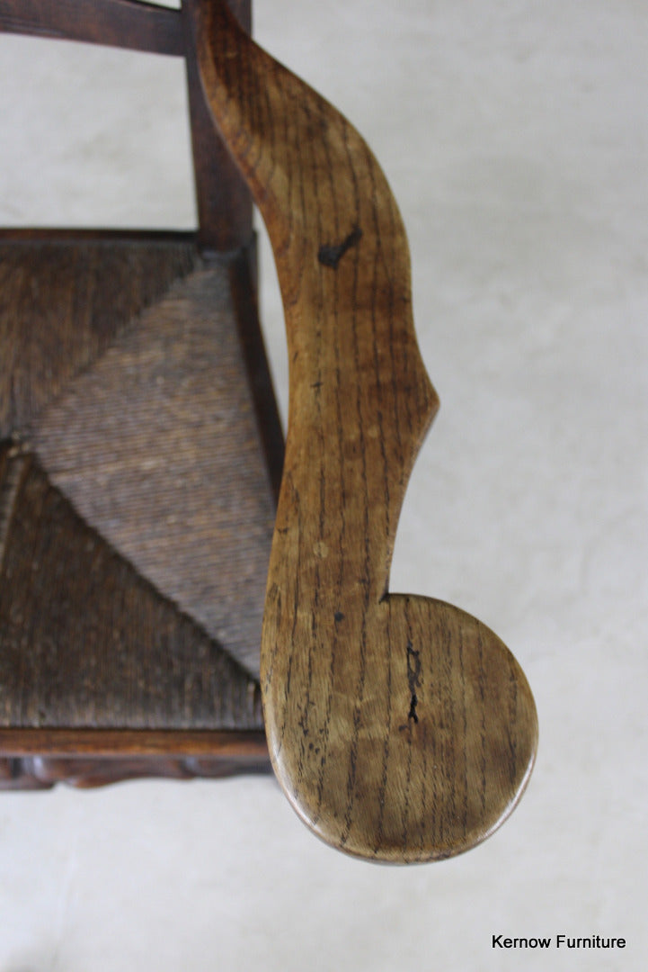 Antique oak & elm ladderback chair. 18th Century / early 19th Century country carver chair with rush seat.
