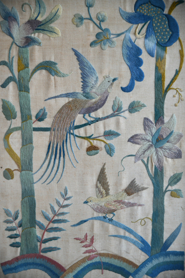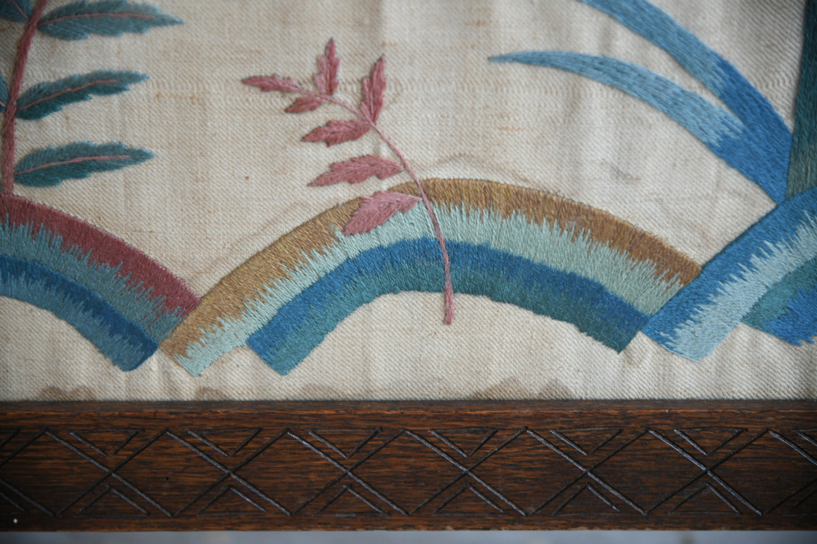 Antique Oak Fire Screen. Early 20th century oak firescreen with barley twist supports and crewel work panel under glass.