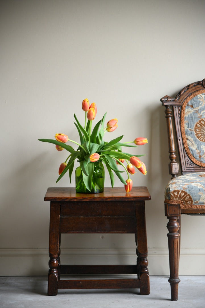 Antique Oak Joint Stool. Late 19th traditional style joint stool. Polished seat on turned splayed legs with pegged joints and joined by low stretchers.