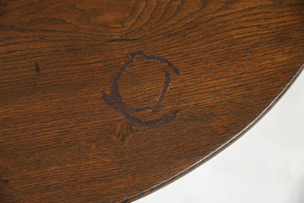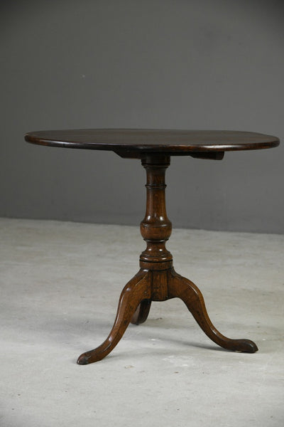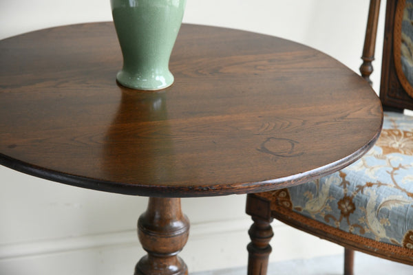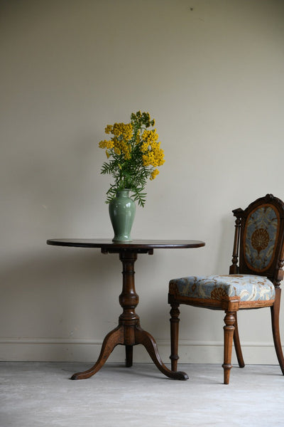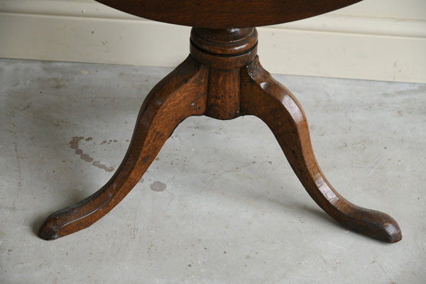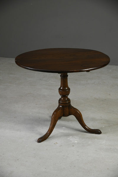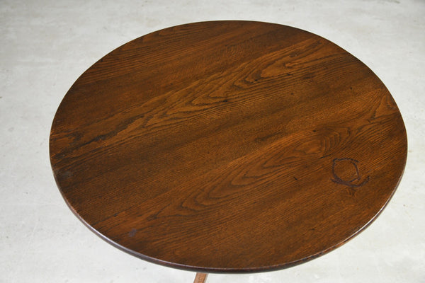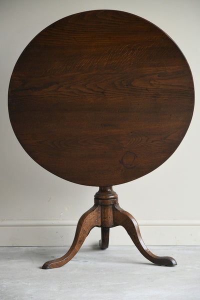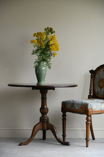 Antique Oak Tilt Top Table. Antique small round tilt top table, planked oak top on turned column and three splayed legs.