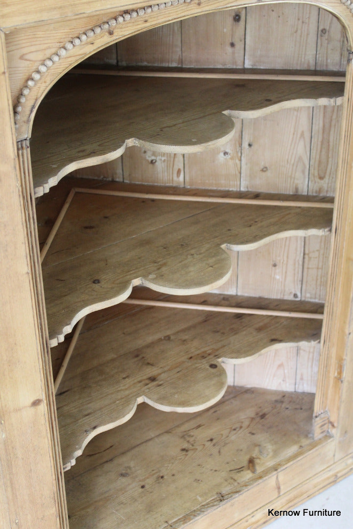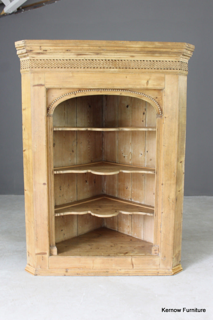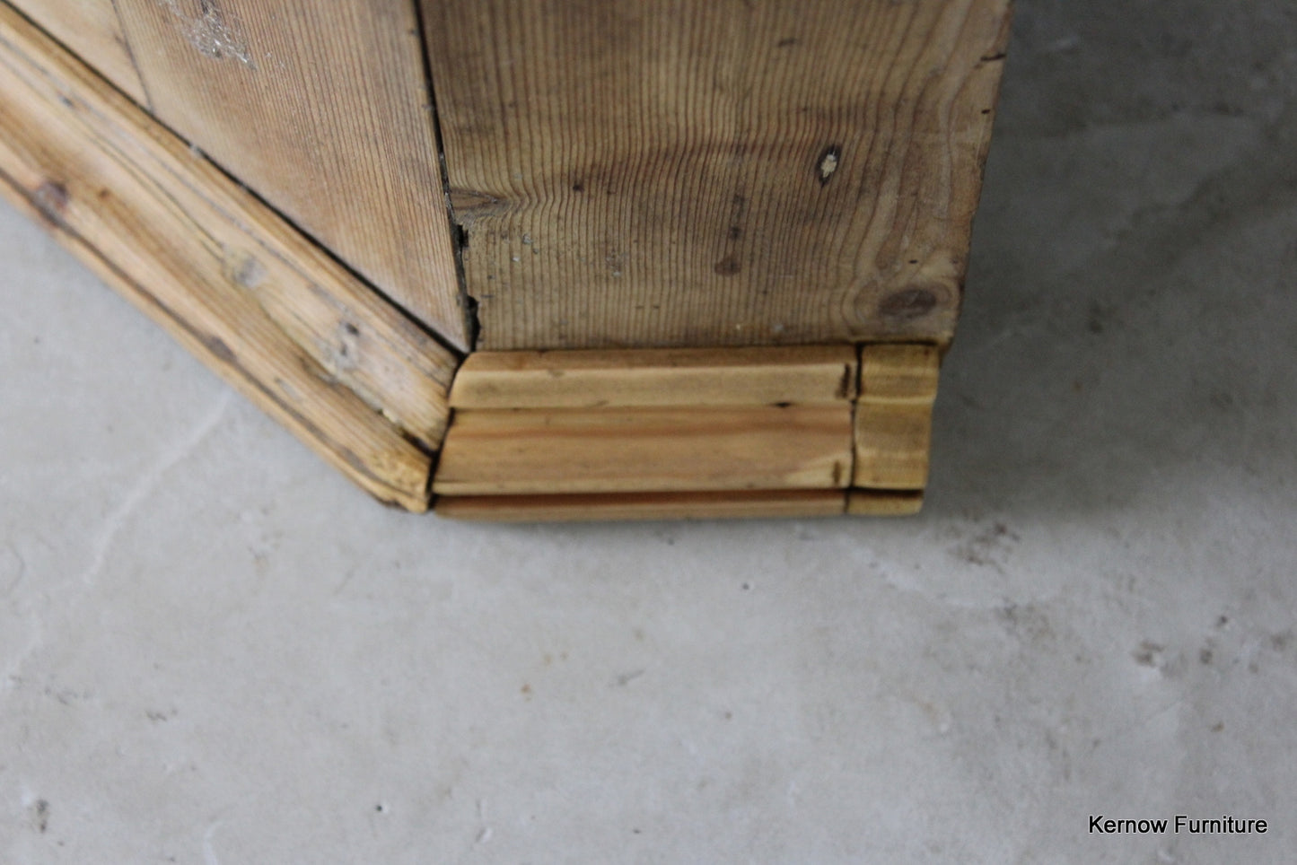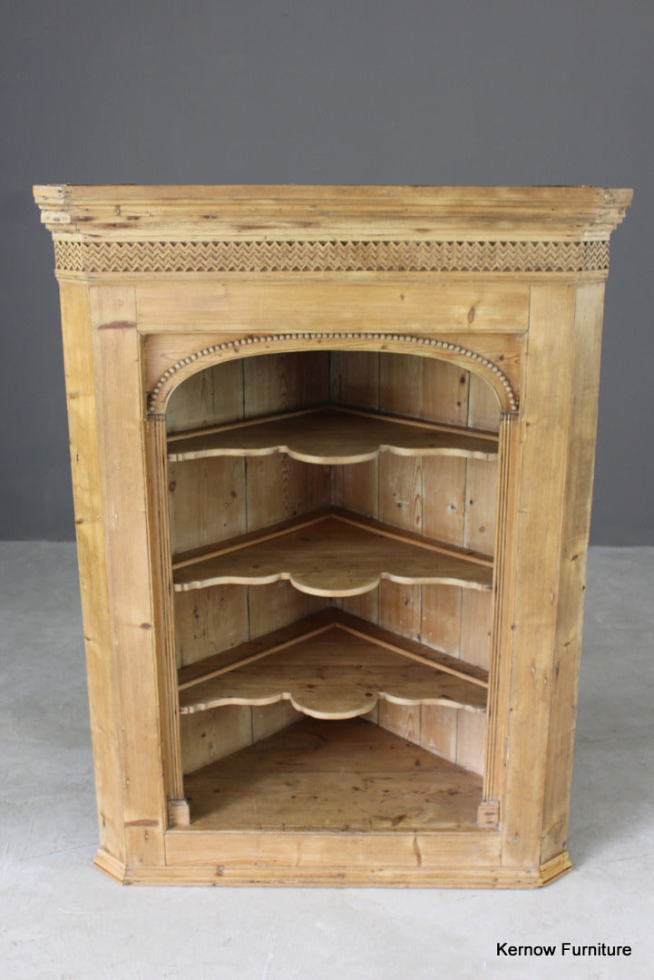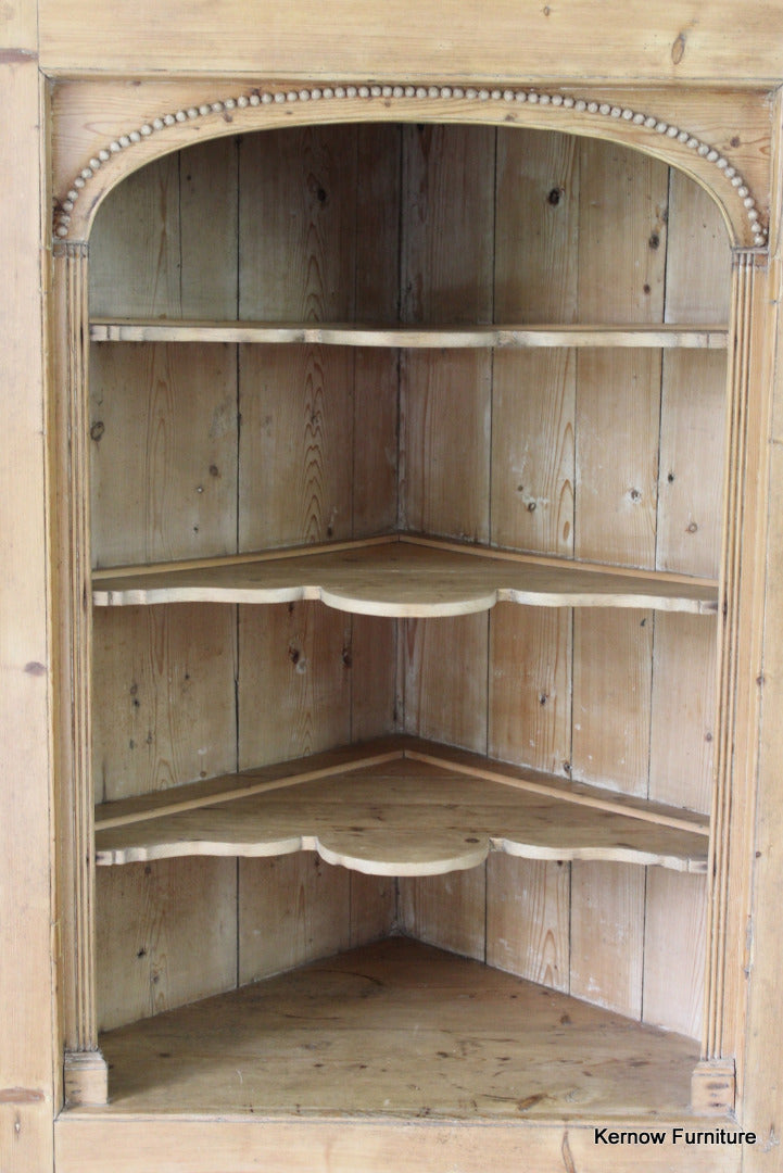 Antique pine hanging corner cupboard. Large 19th Century rustic pine wall cupboard, three fixed shaped shelves.