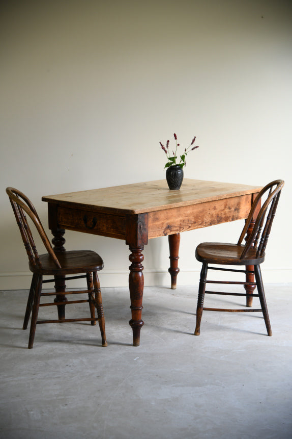 Antique Pine Scrub Top Kitchen Table. 19th Century small pine kitchen table, planked pine top with waxed finish, single frieze drawer in each end, on turned legs.