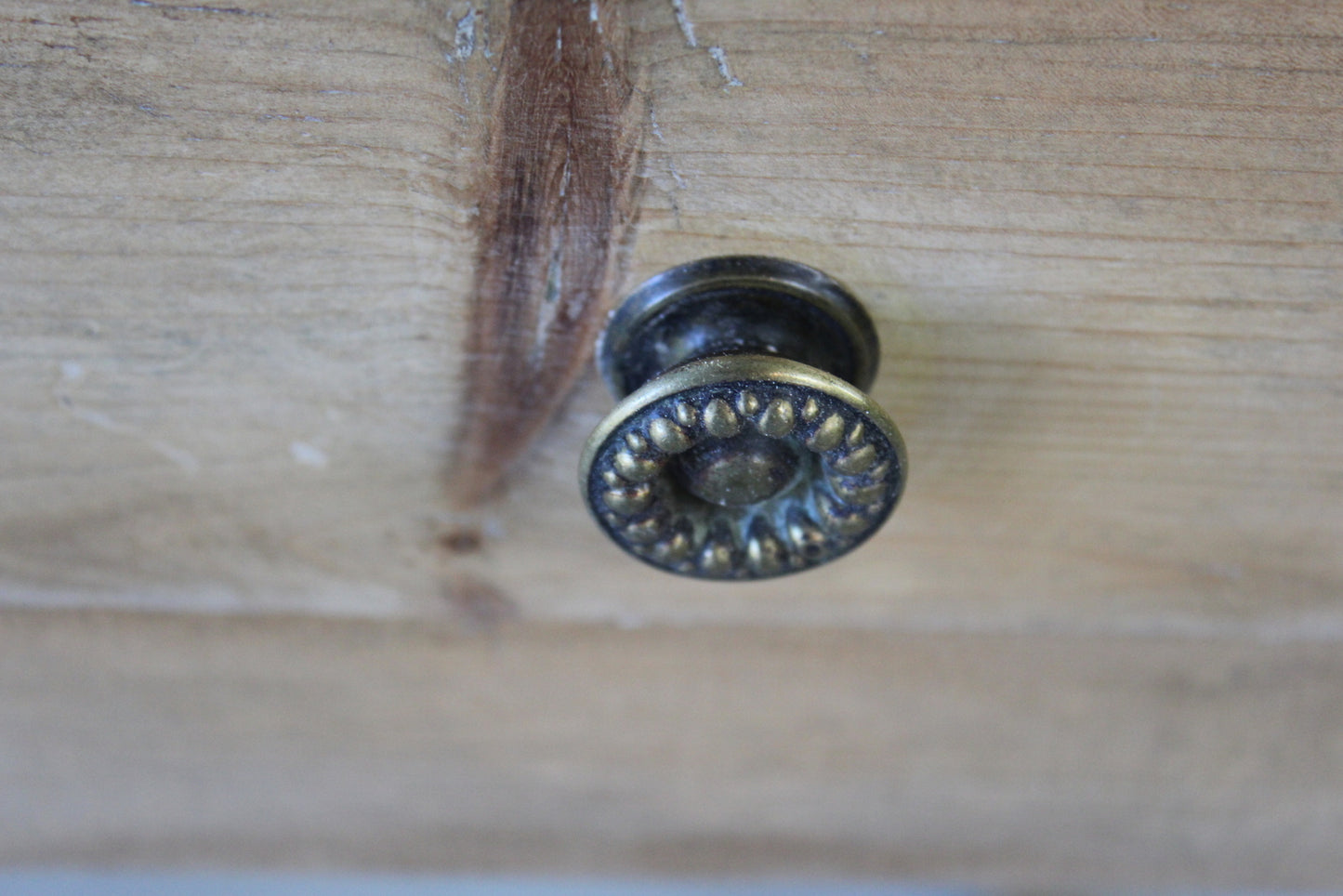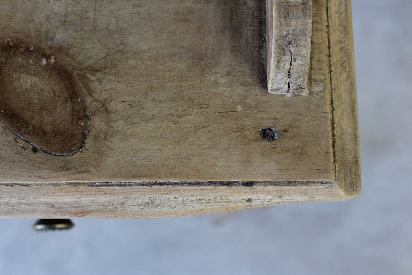 Condition: Solid and sturdy condition, rustic antique finish, damage to the front right corner.