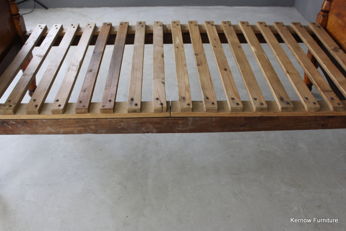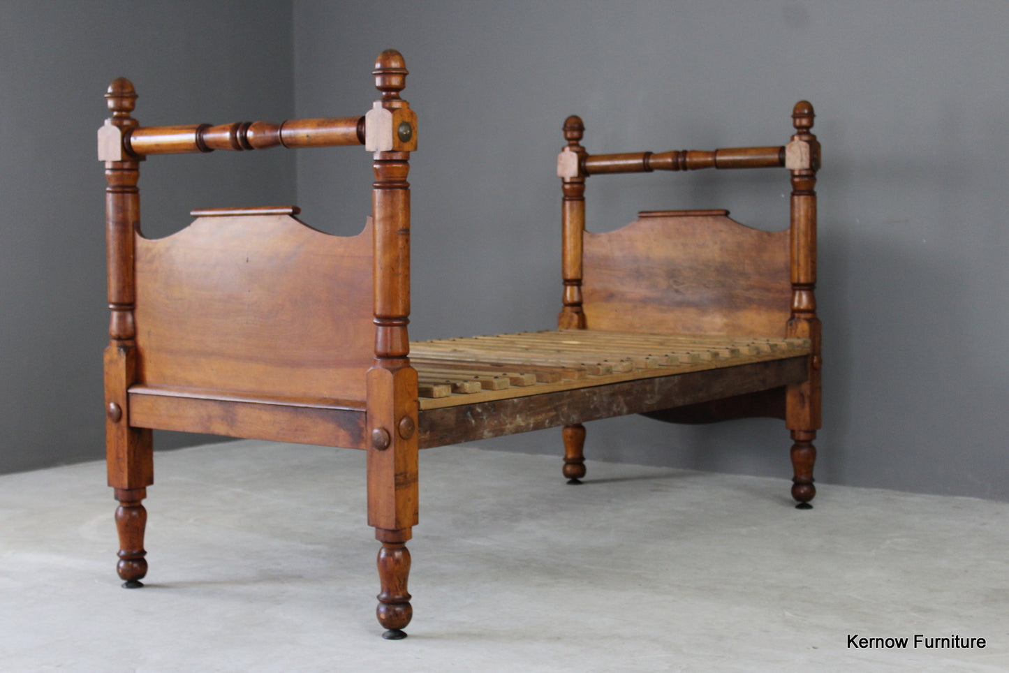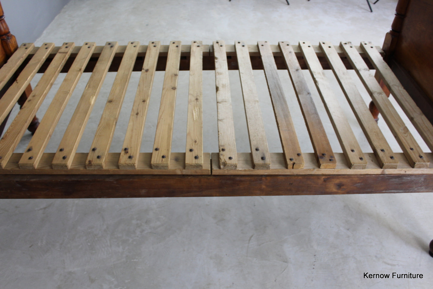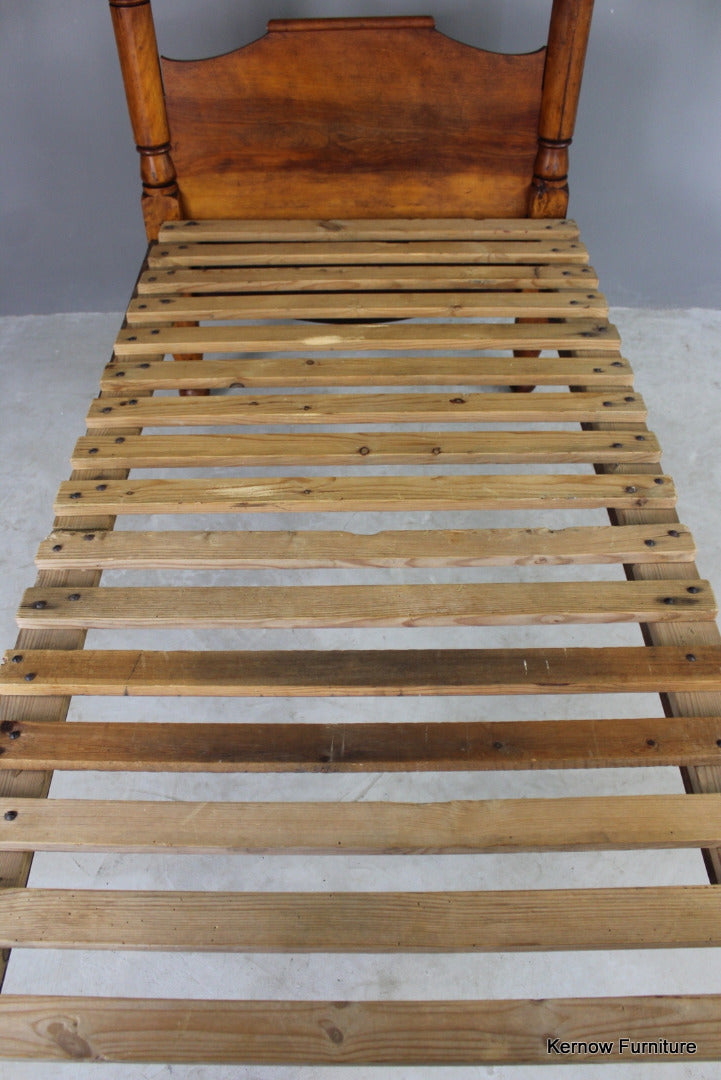 Antique single bed frame. Single antique bed frame, walnut headboard and footboard with turned finials, later folding slatted pine frame for the mattress which sits on the original metal side rails.