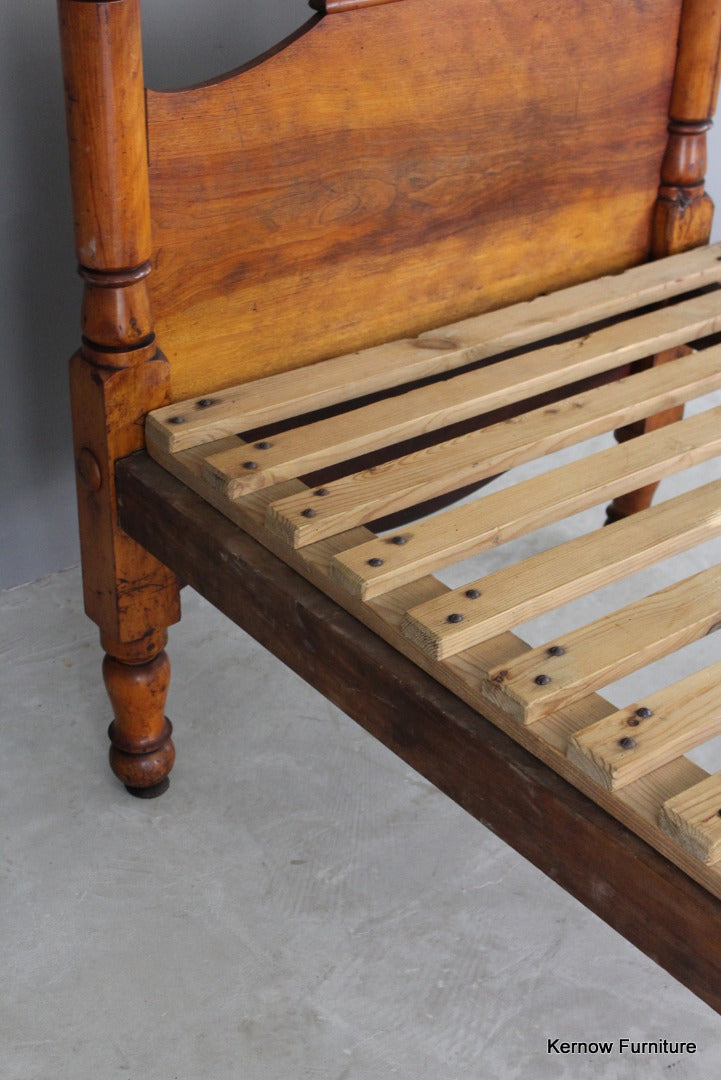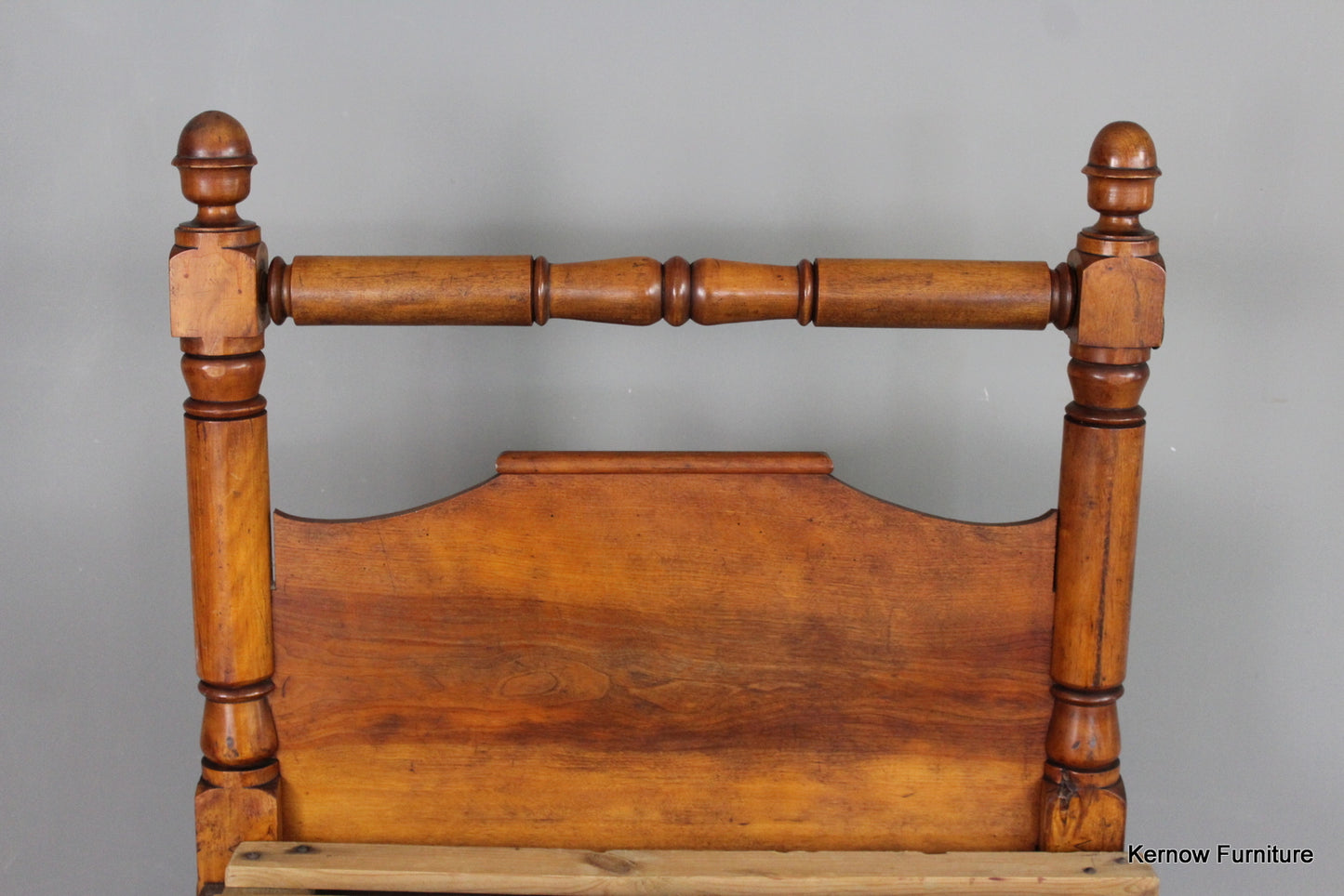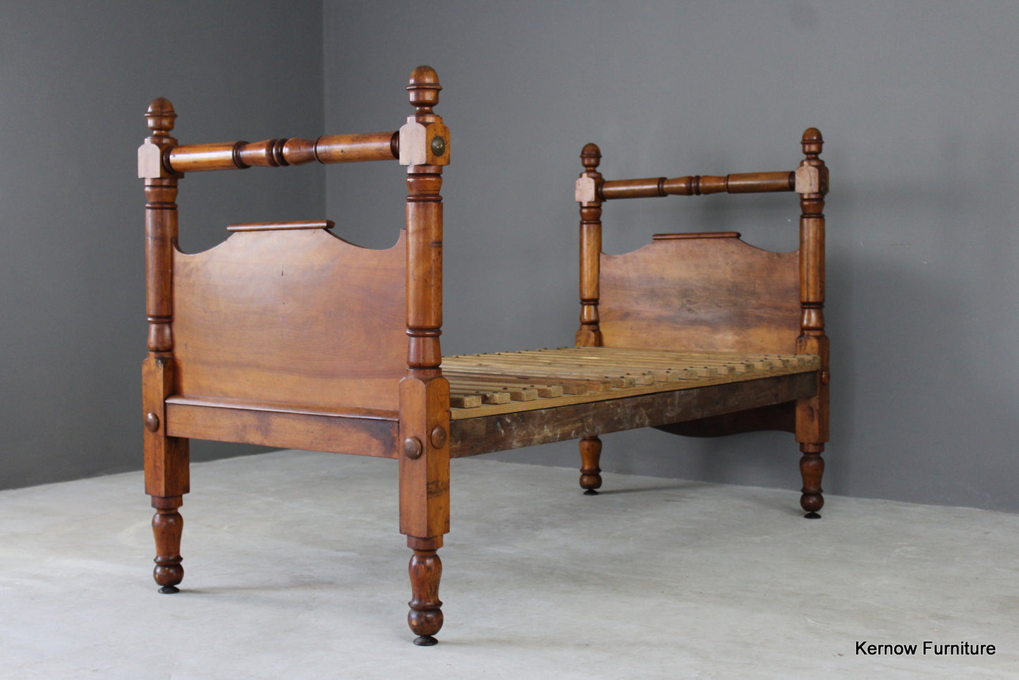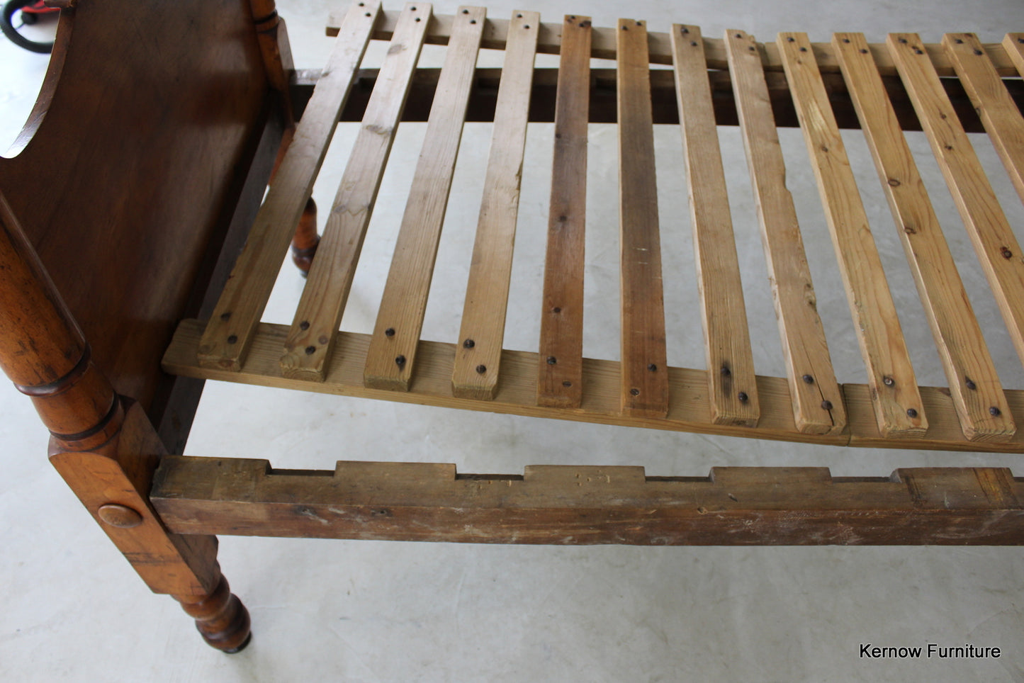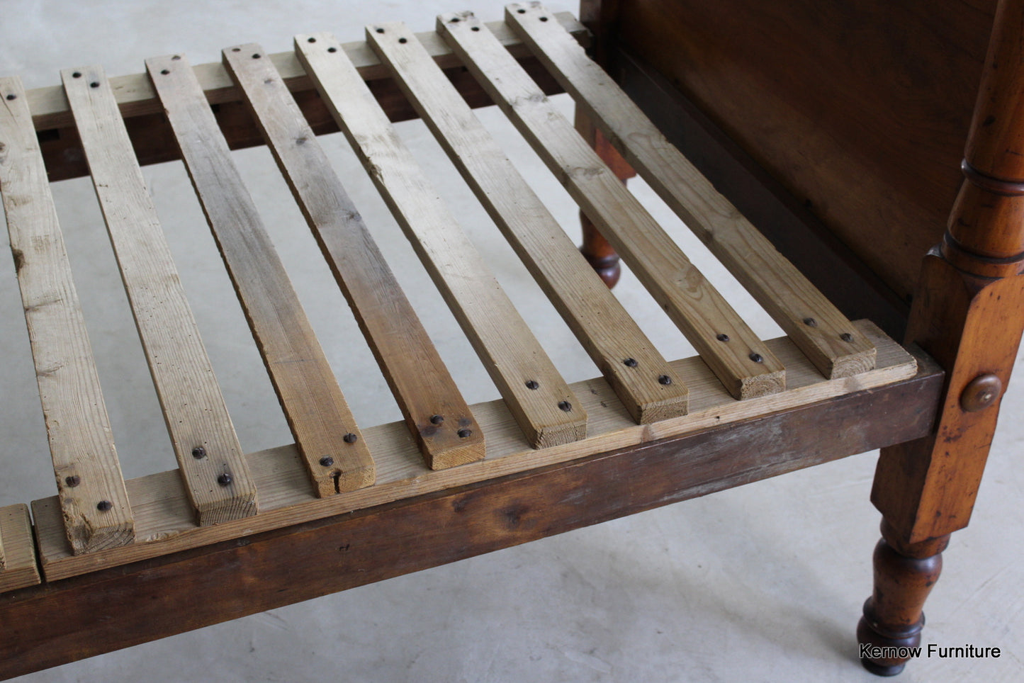 Antique single bed frame. Single antique bed frame, walnut headboard and footboard with turned finials, later folding slatted pine frame for the mattress which sits on the original metal side rails.