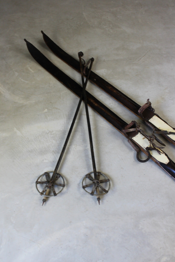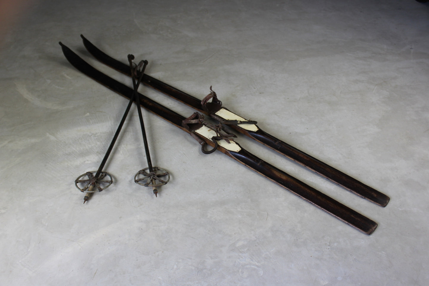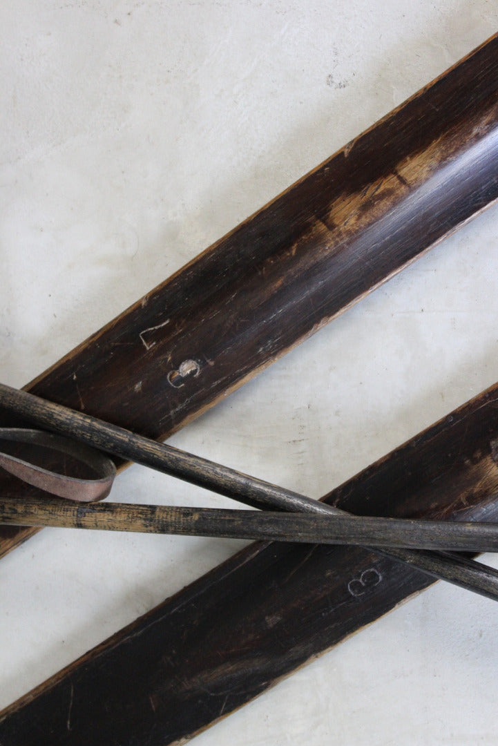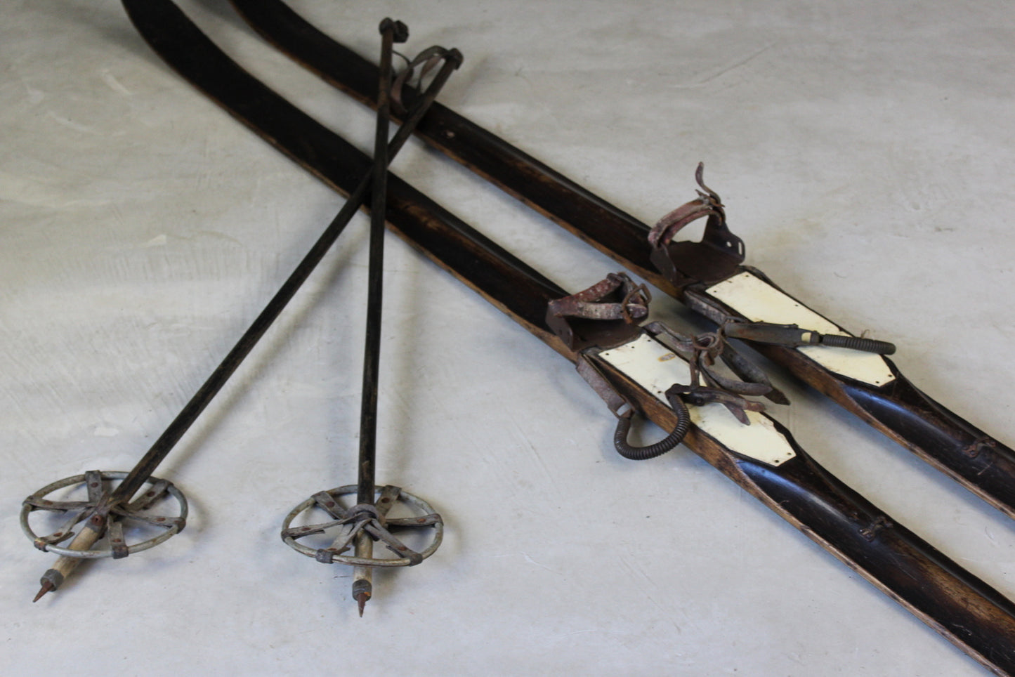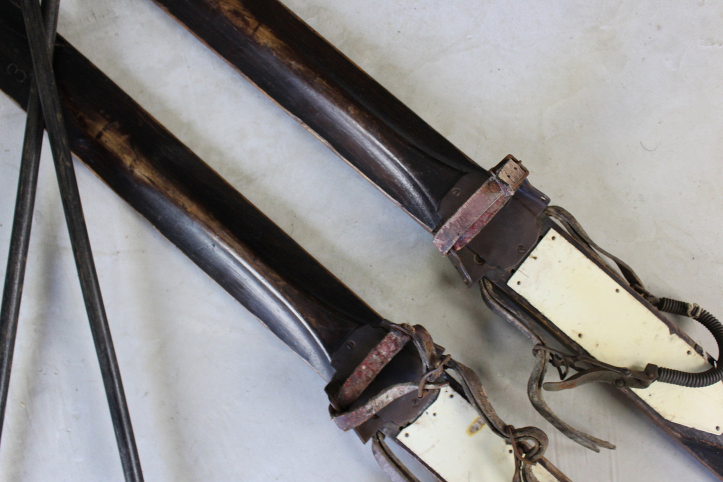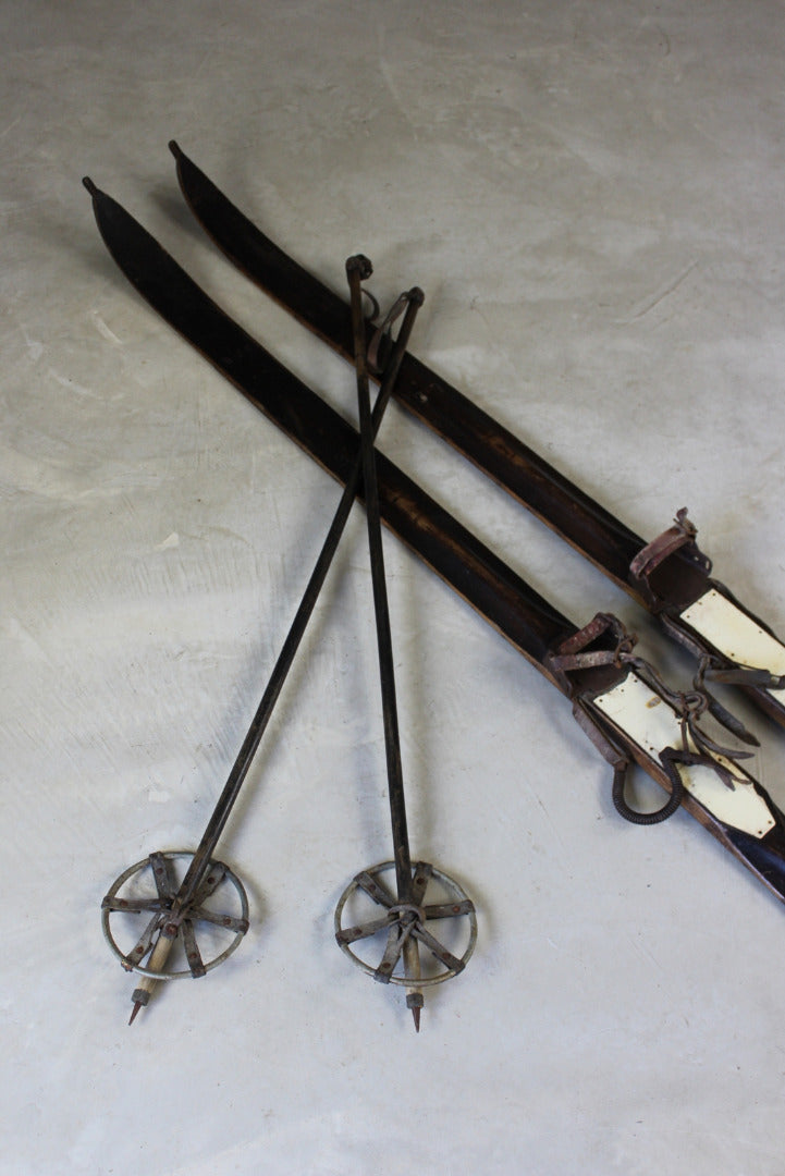 Antique skis & poles. Pair antique wooden skis and hand poles with leather bindings.