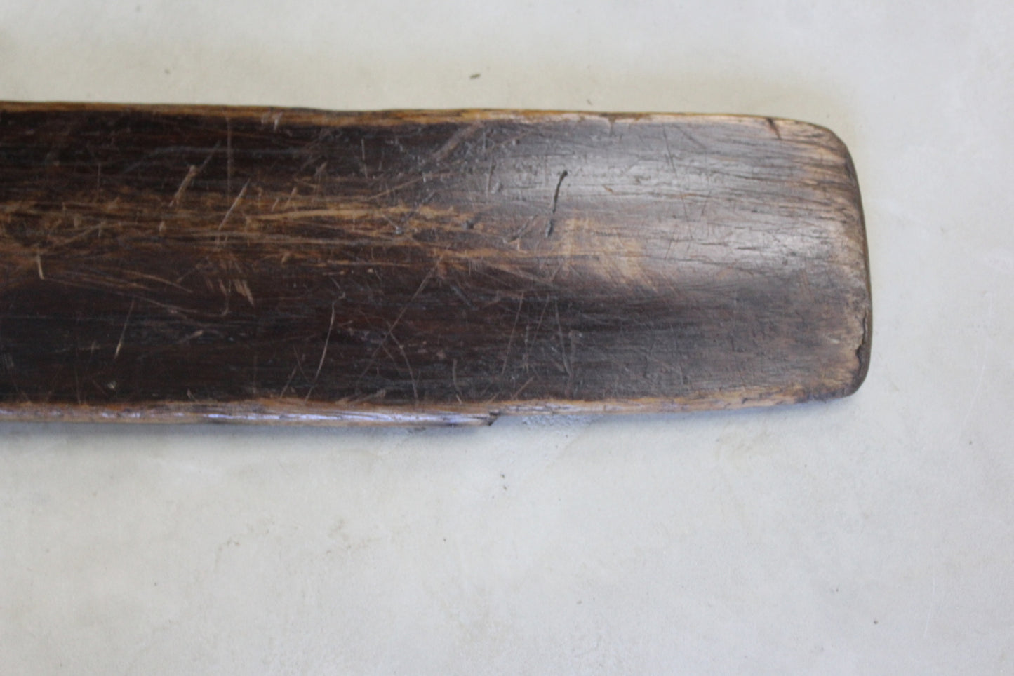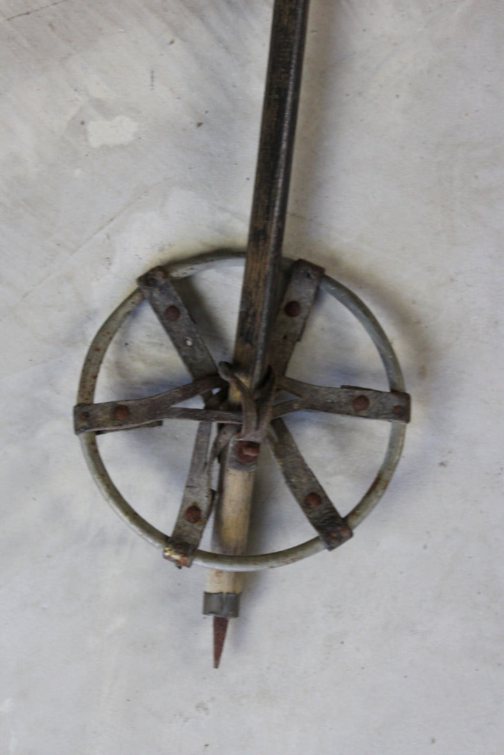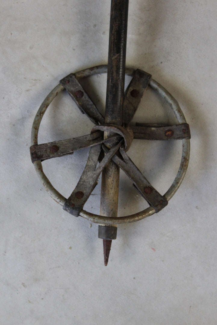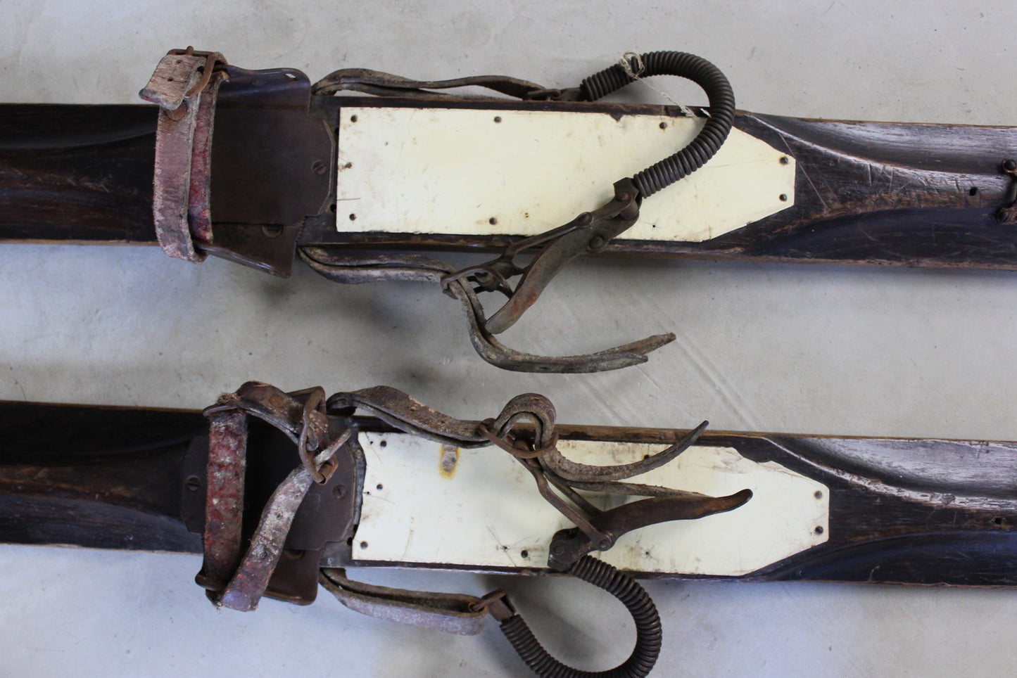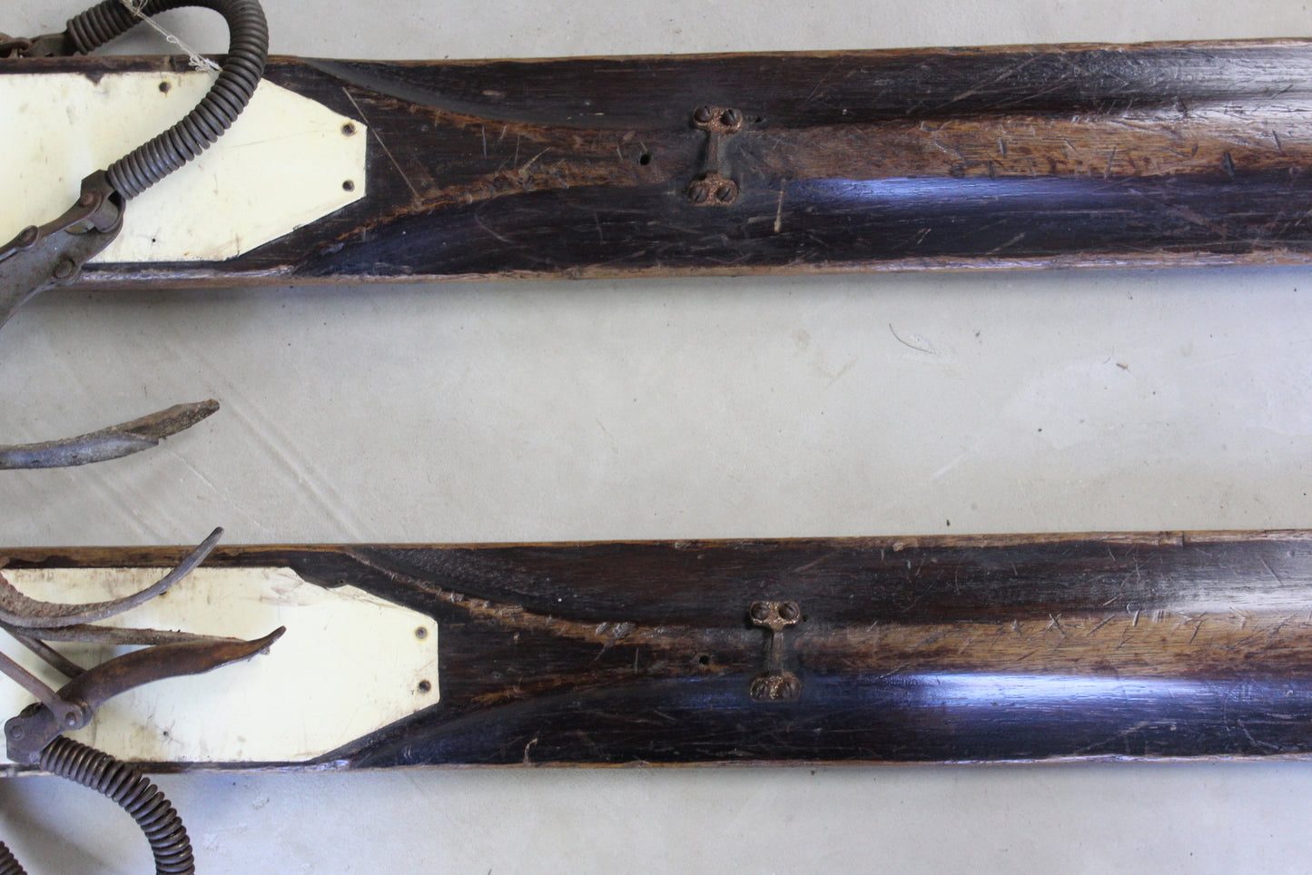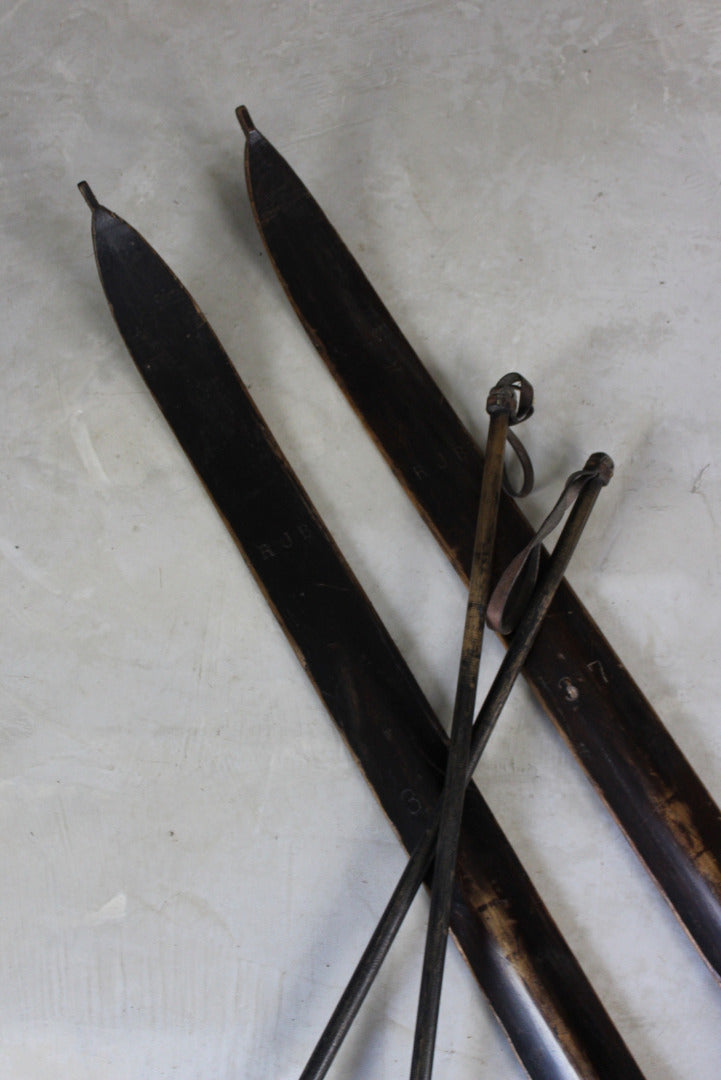 Antique skis & poles. Pair antique wooden skis and hand poles with leather bindings.