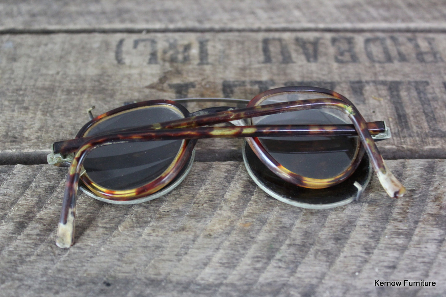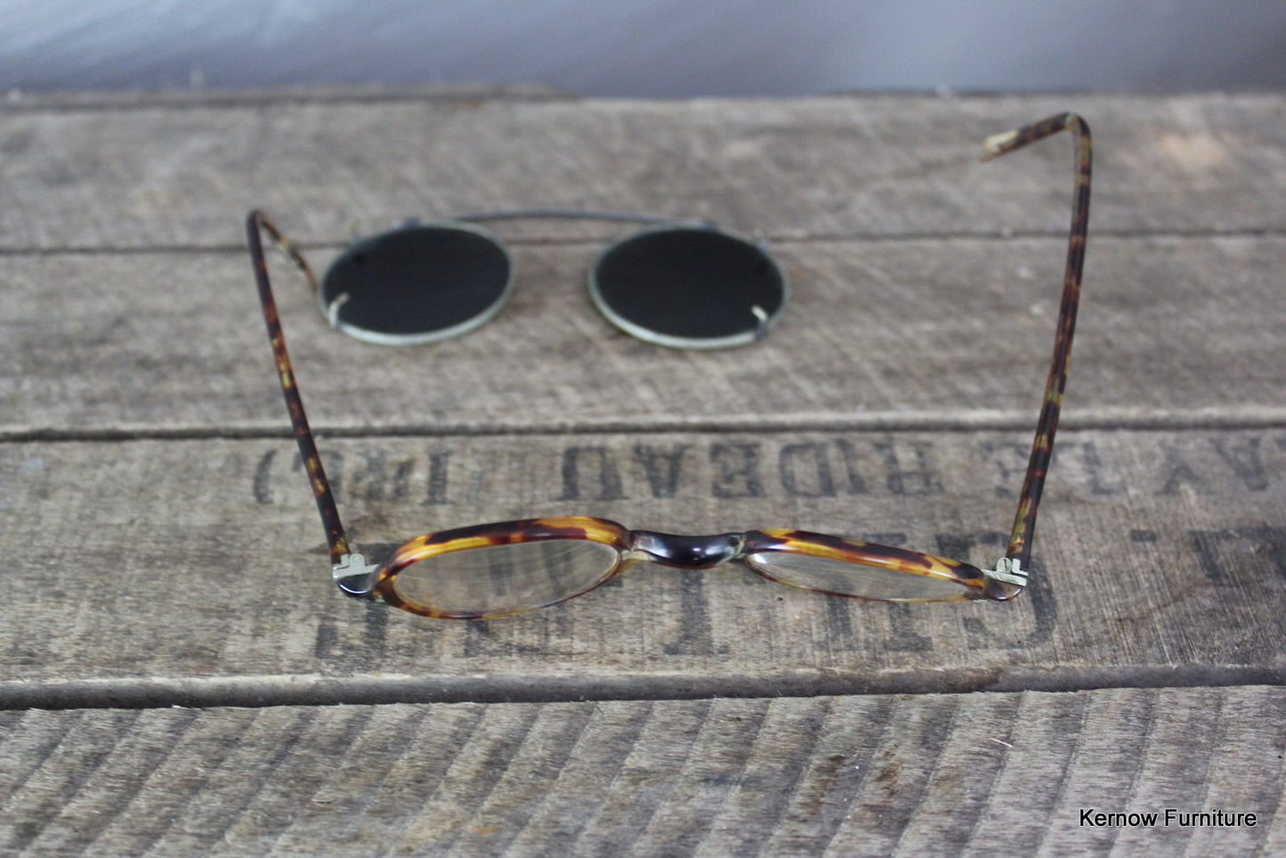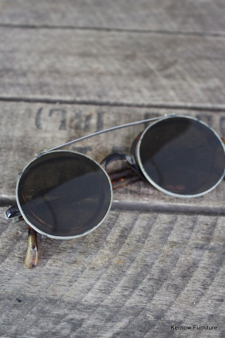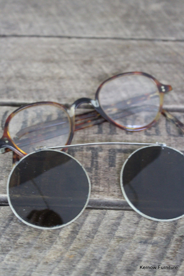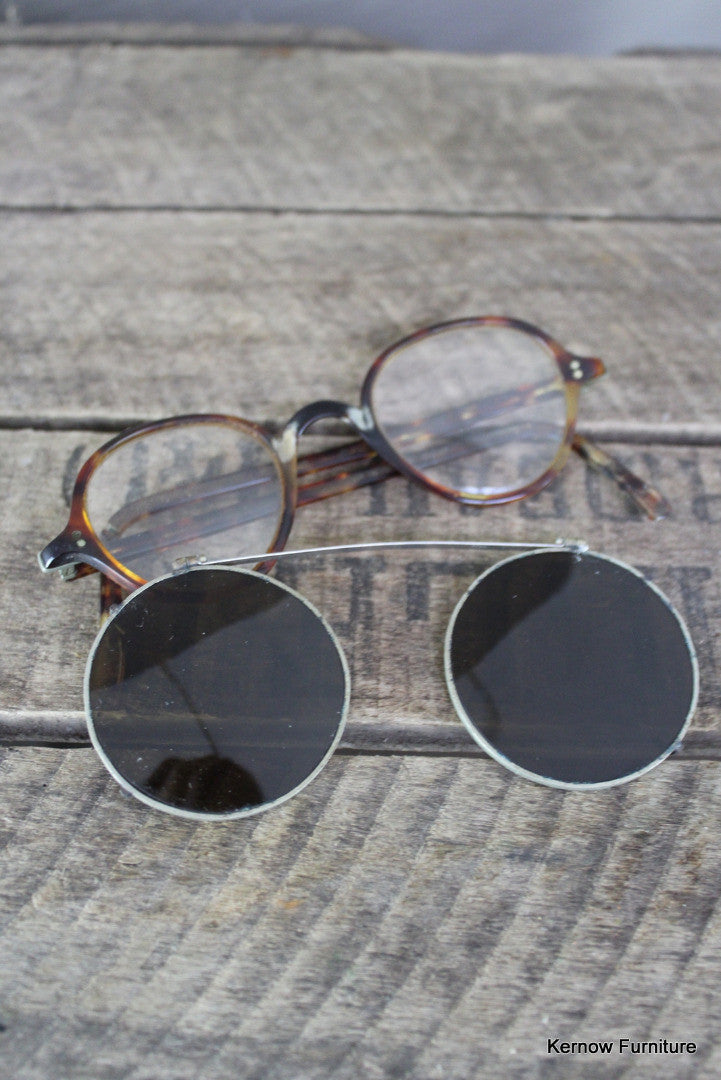 Antique spectacles. Pair of tortoiseshell effect spectacles with clip on tinted sunglasses.