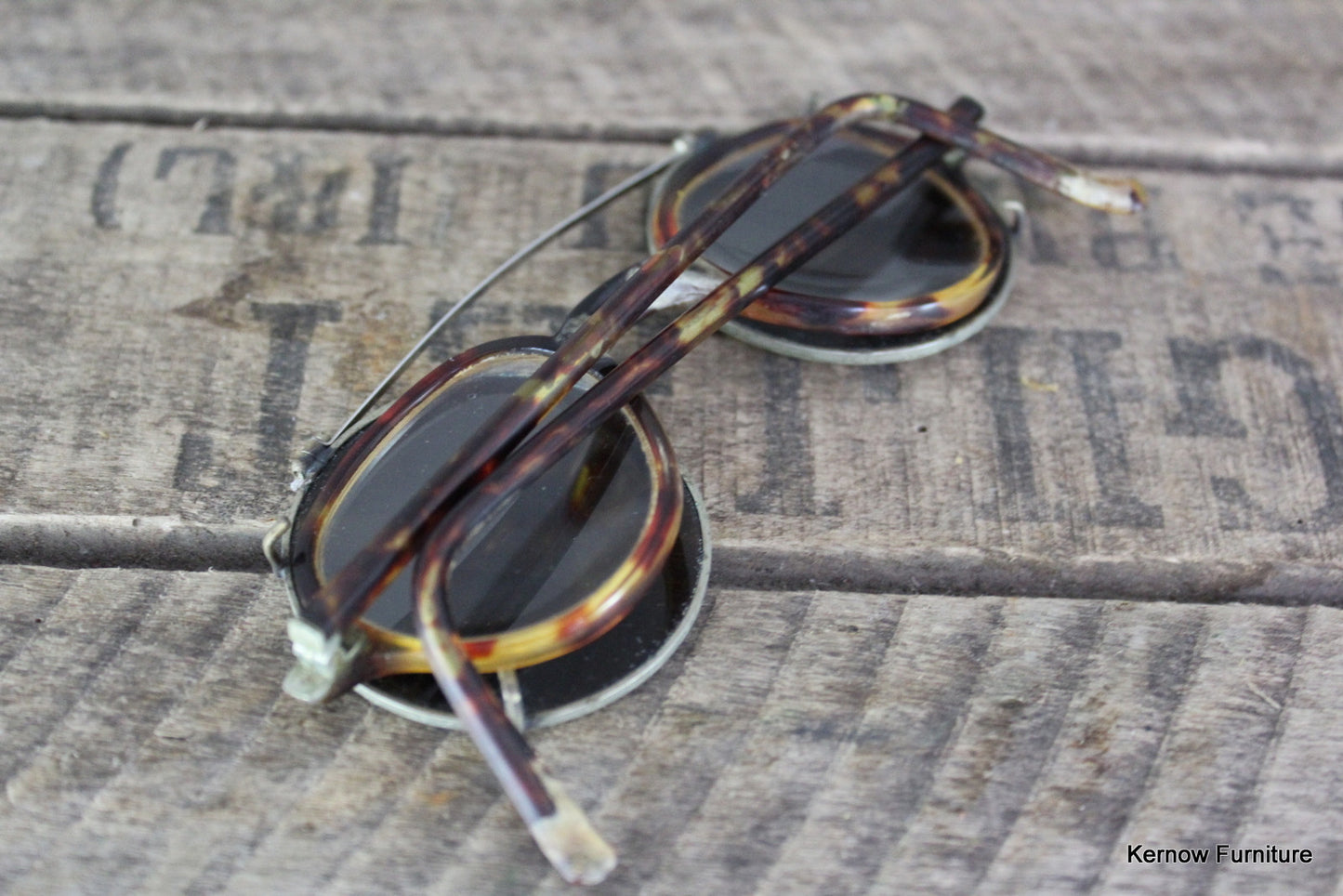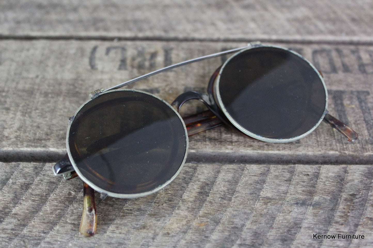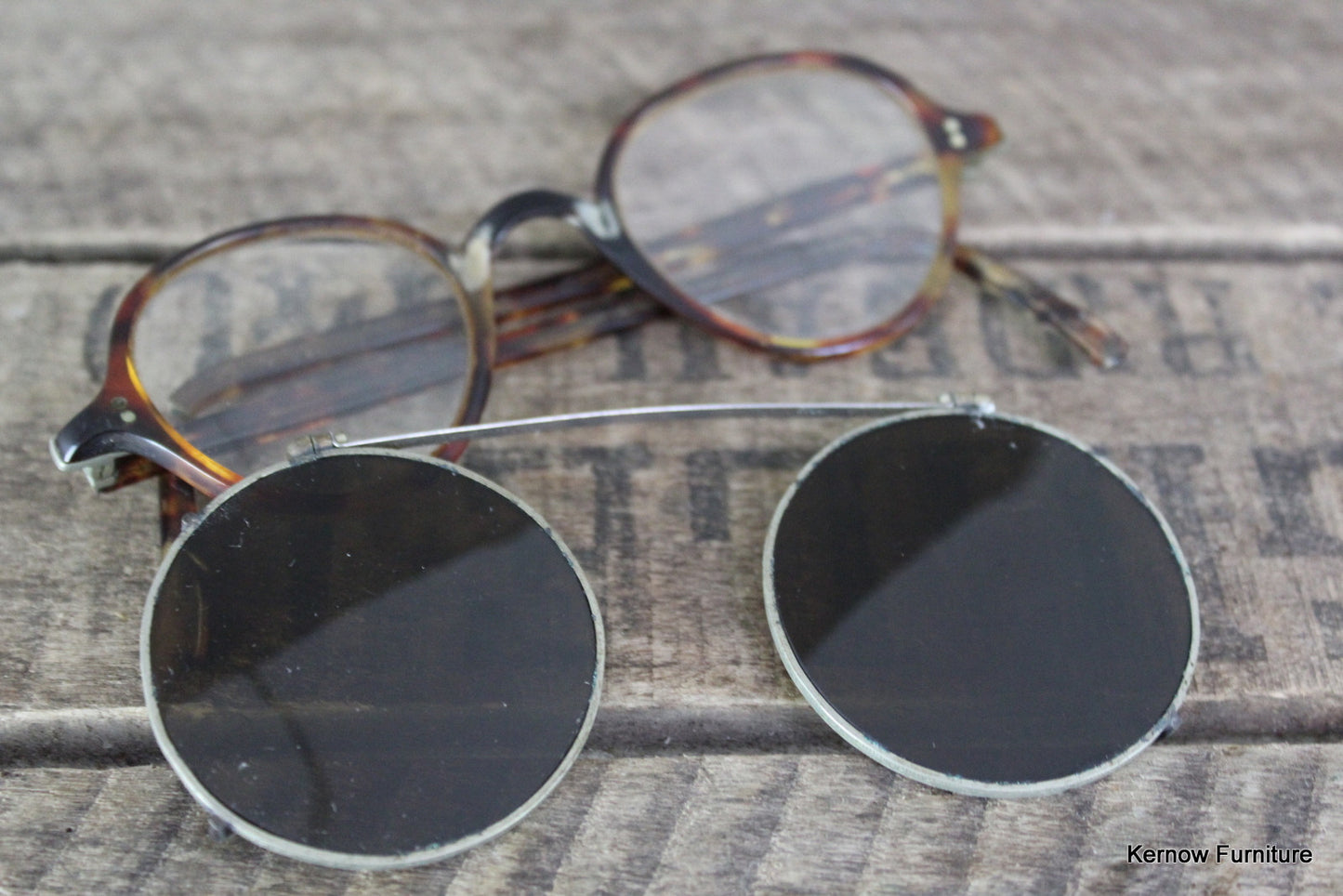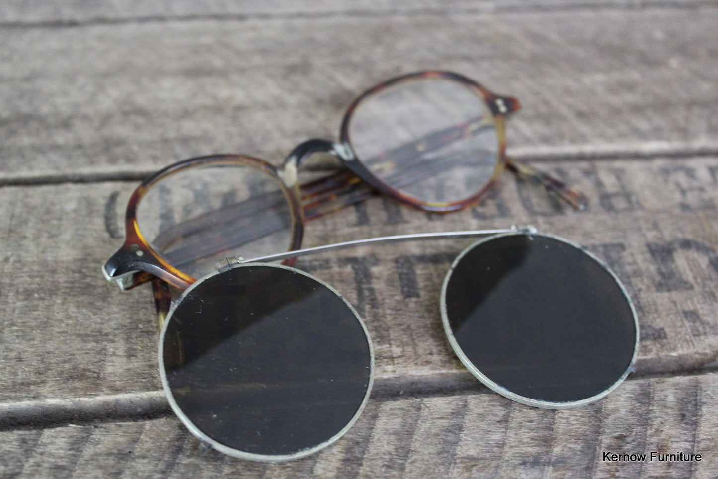 Antique spectacles. Pair of tortoiseshell effect spectacles with clip on tinted sunglasses.