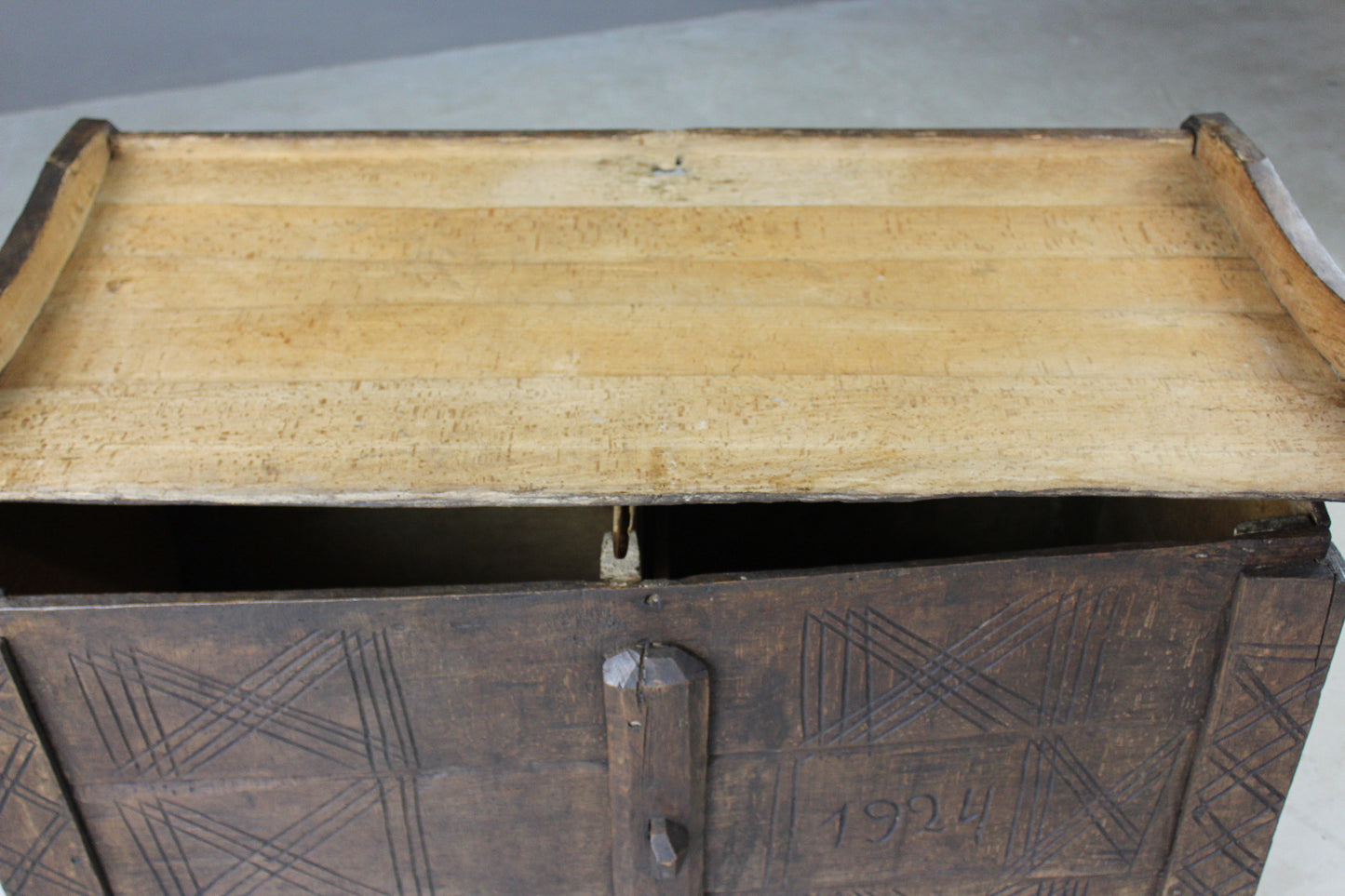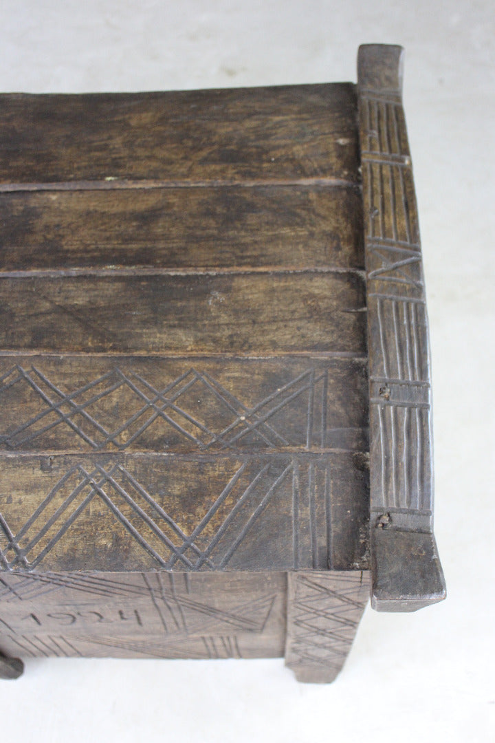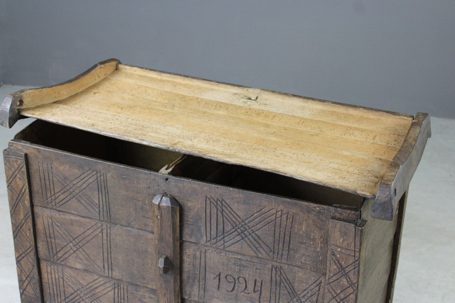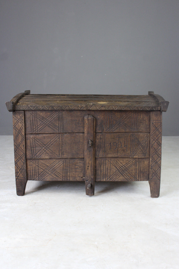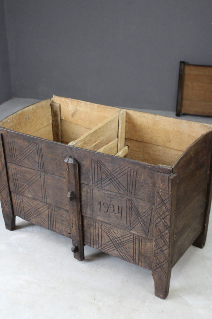 Antique stained beech flour ark. Rustic solid stained beech flour ark, pegged joints, carved decoration.