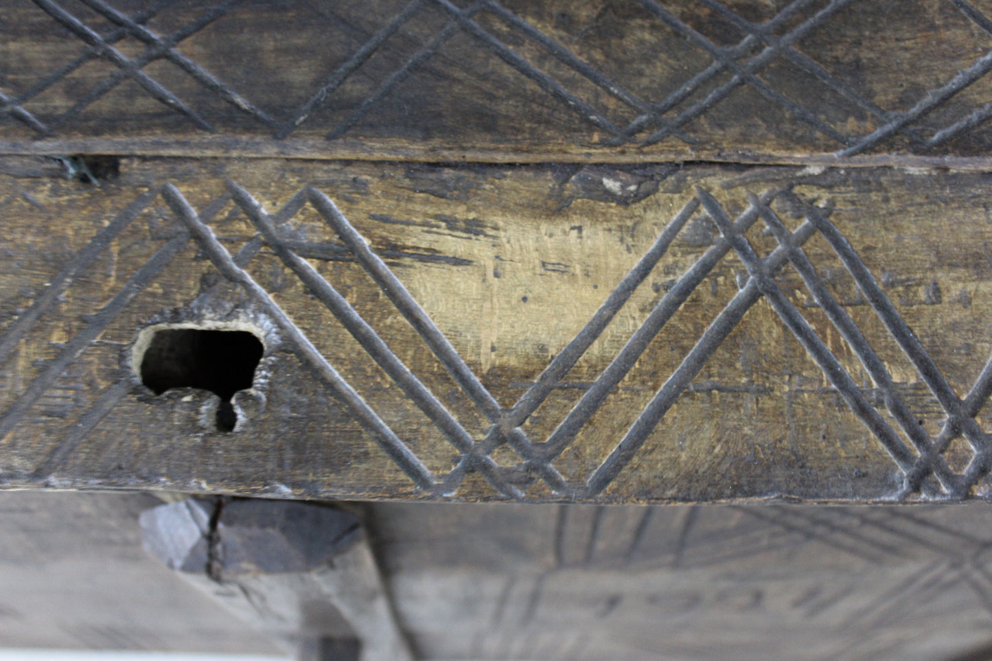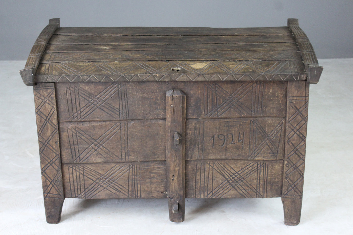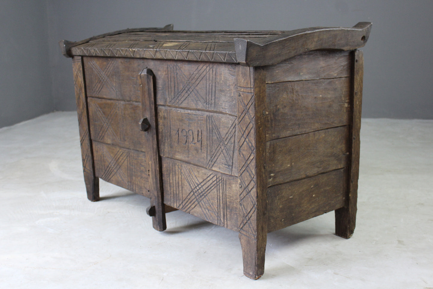 Antique stained beech flour ark. Rustic solid stained beech flour ark, pegged joints, carved decoration.