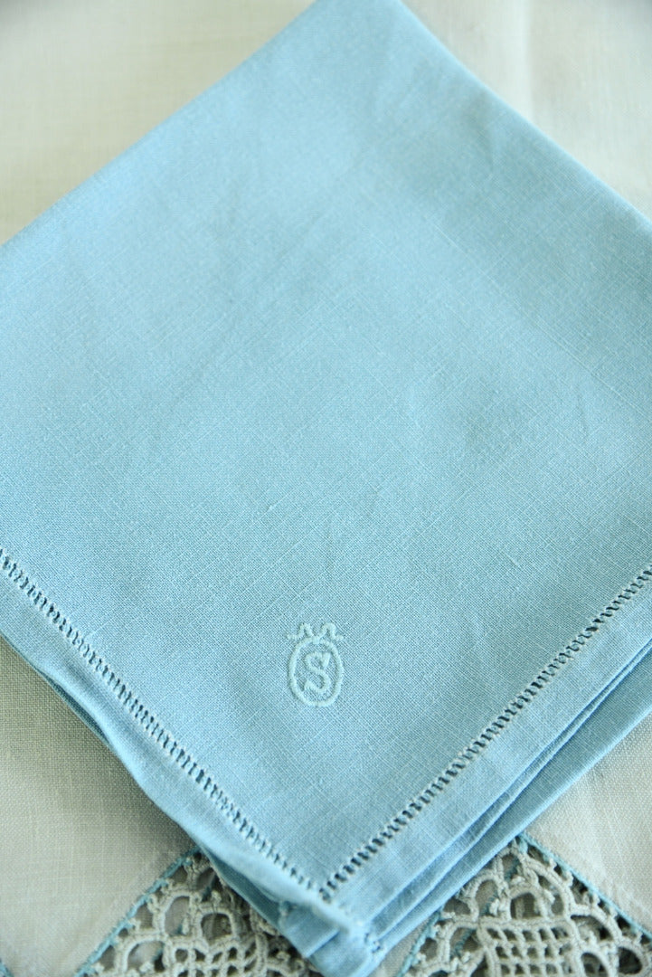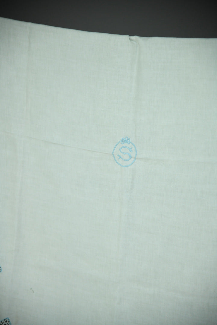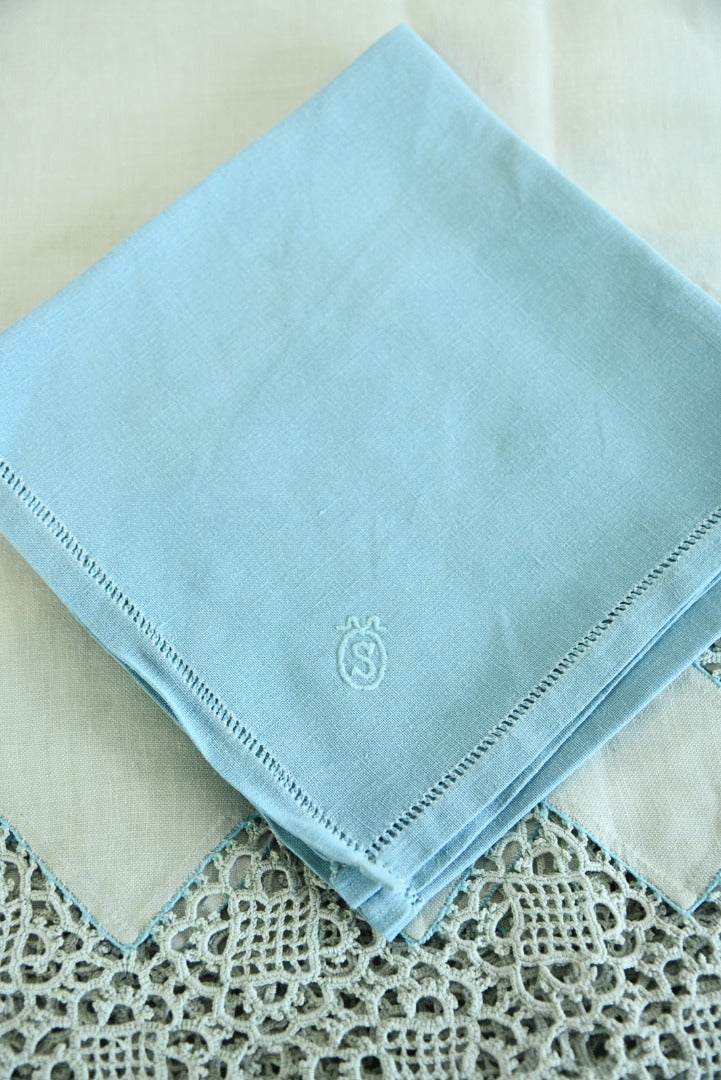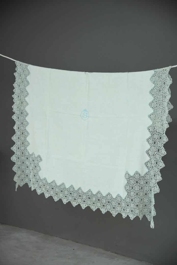 Antique tablecloth & napkins. Antique linen tablecloth with lace border and embroidered S monogram.