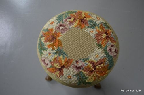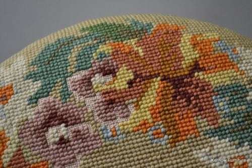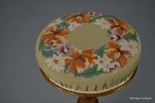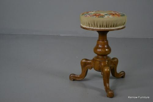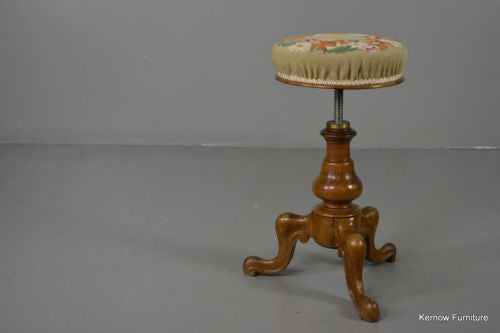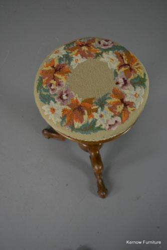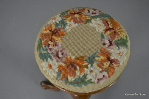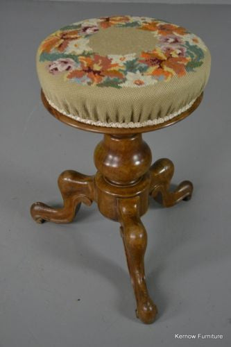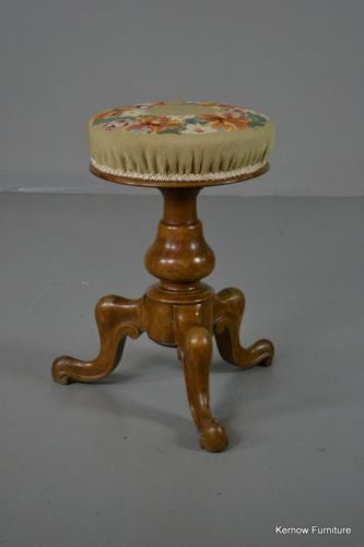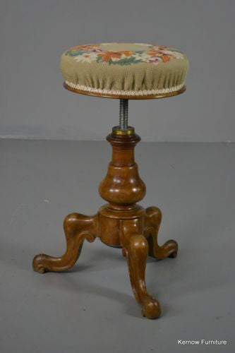 Antique Victorian adjustable music stool, carved walnut tripod base with turned adjustable stem with floral tapestry seat.