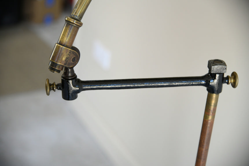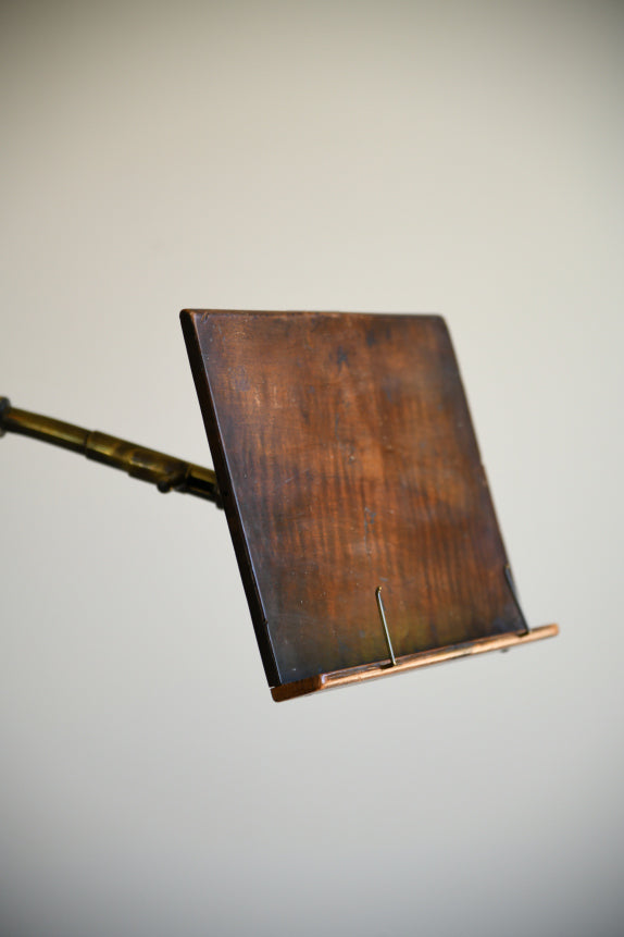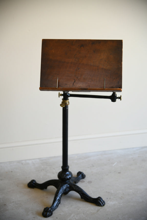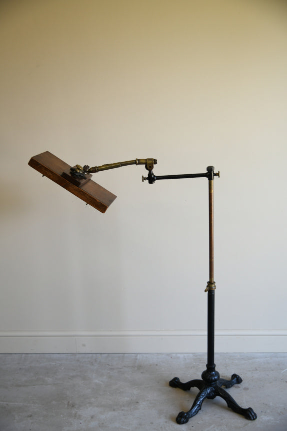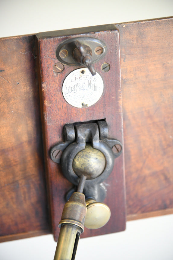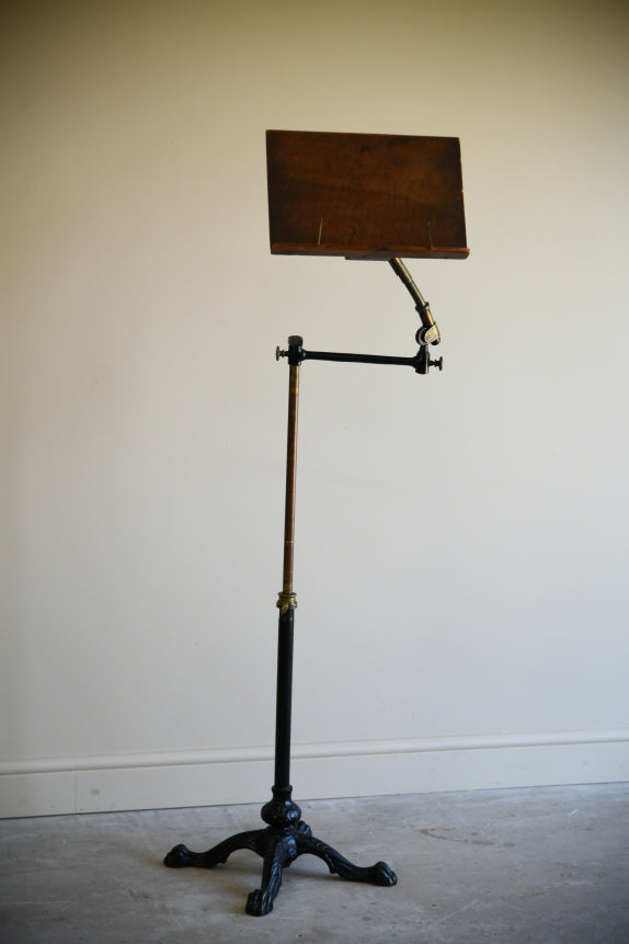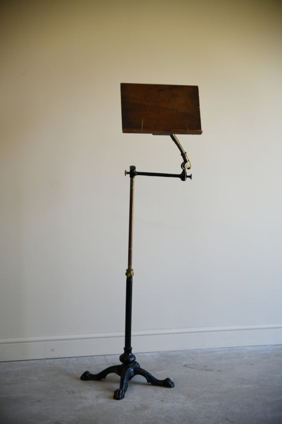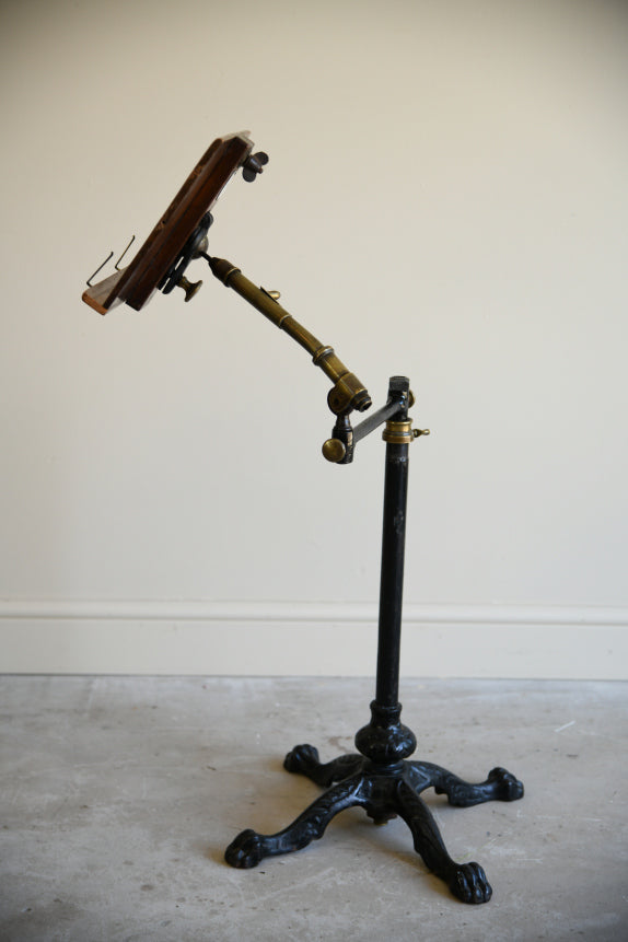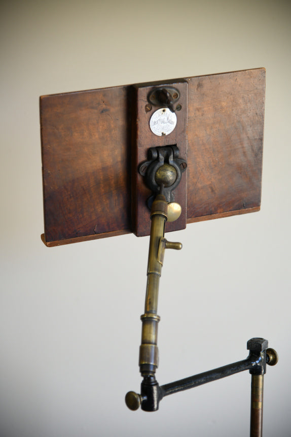 Antique Victorian Adjustable Reading Stand. 19th Century freestanding adjustable stand by Carters Patent Literary Machine, cast iron base with brass column and adjustable arm with walnut book stand.