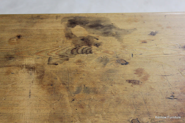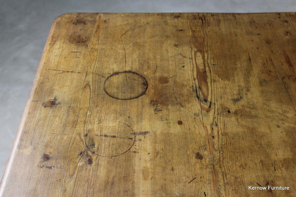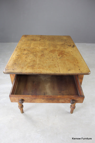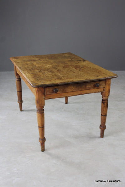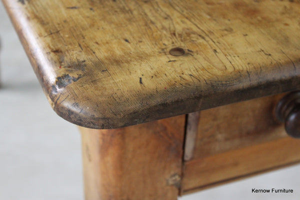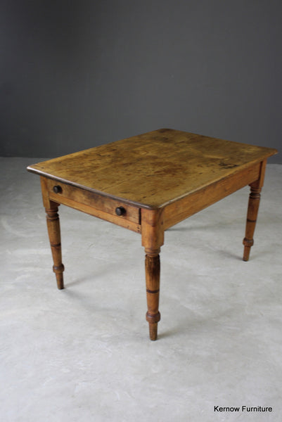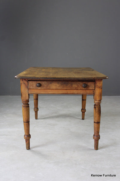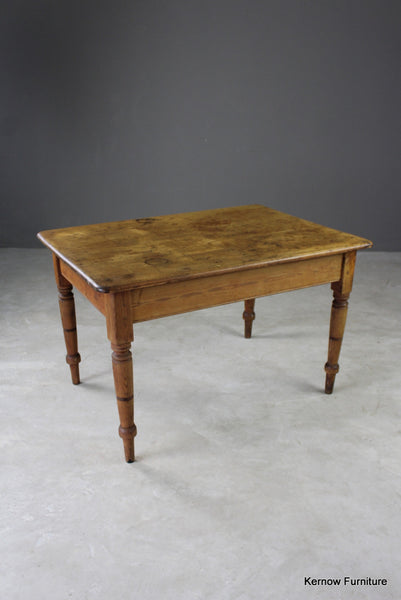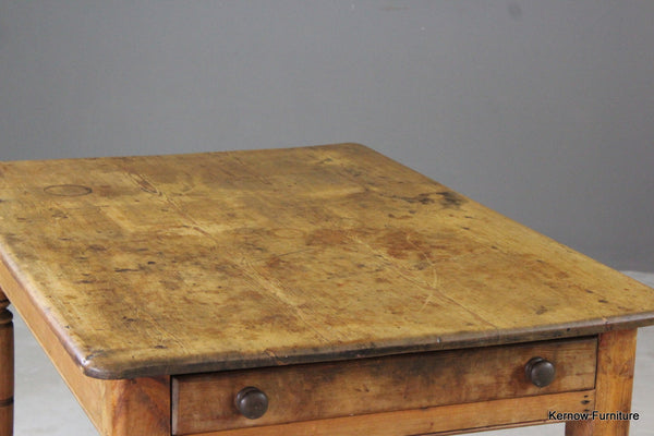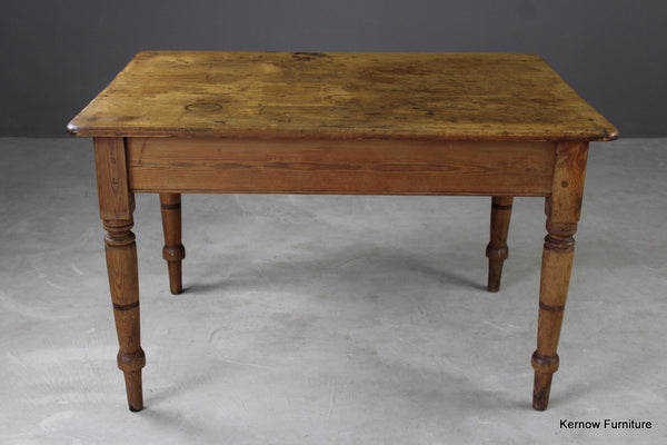 Antique Victorian pine kitchen table. Rustic waxed pine kitchen table with single frieze drawer in one end on turned legs.