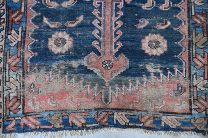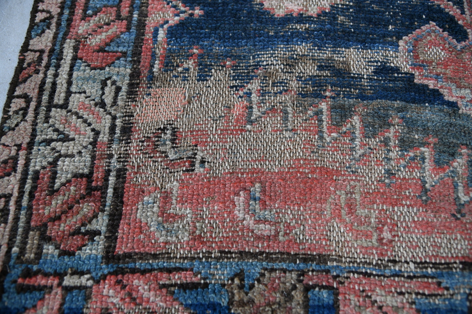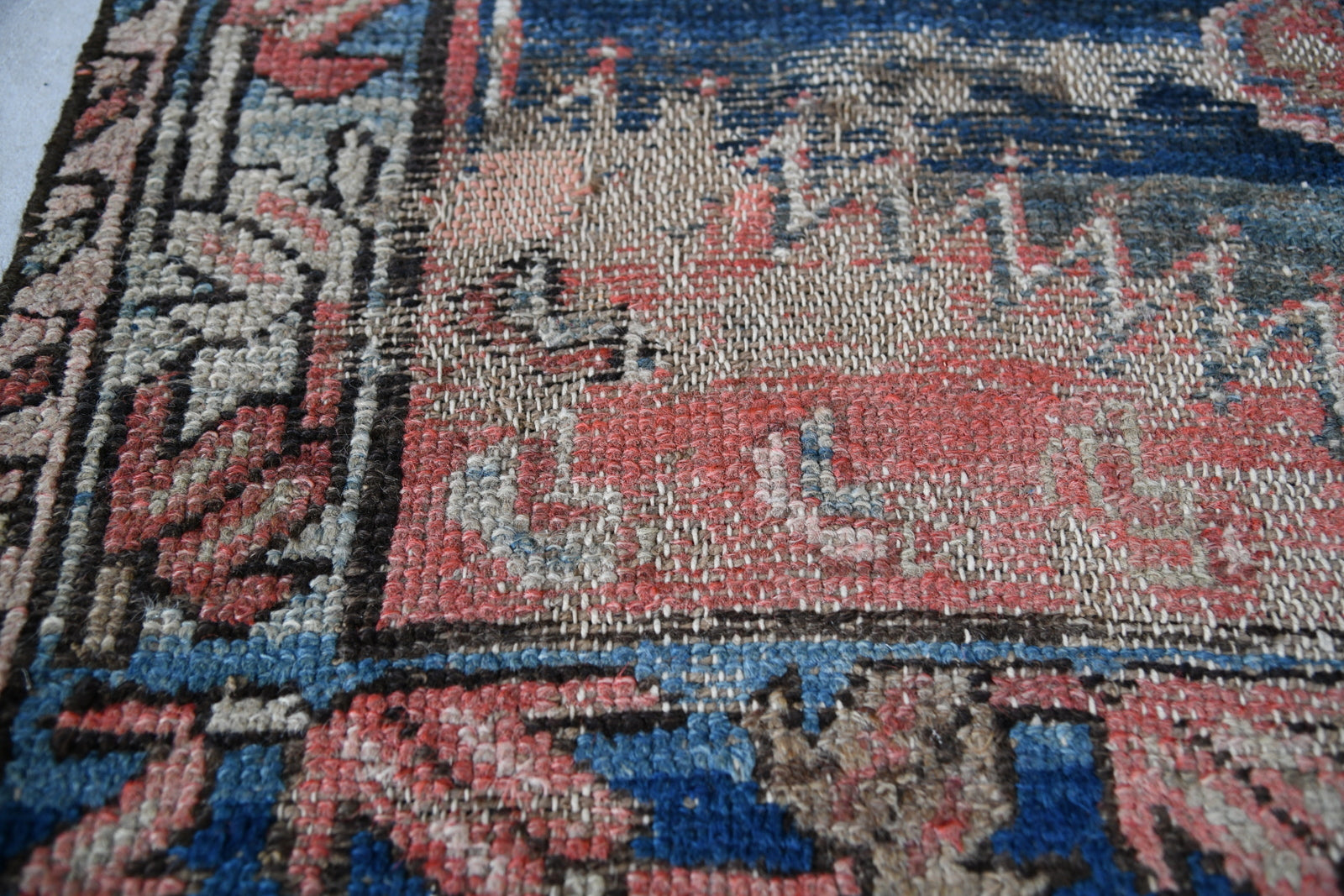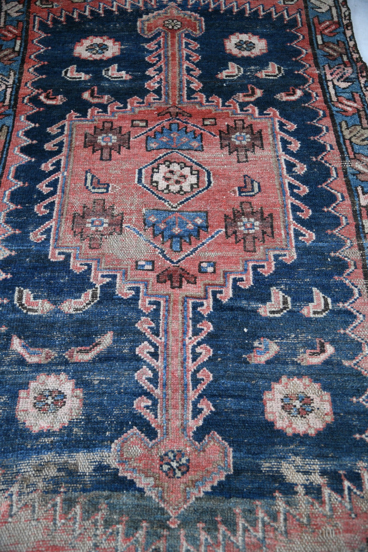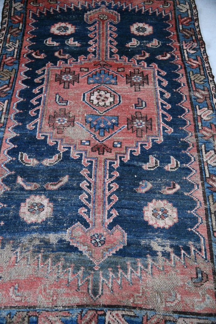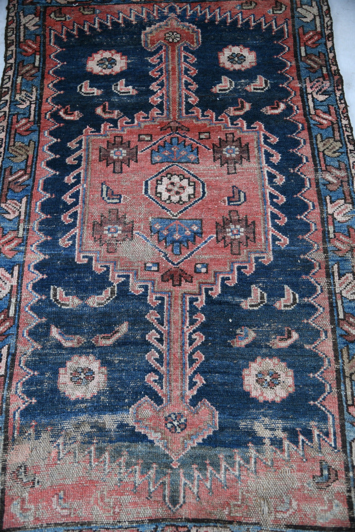 Antique Well Worn Eastern Rug. Eastern hand-knotted wool rug with geometric decoration on red and blue ground.