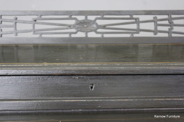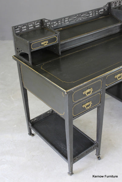 Black Aesthetic Movement Desk. Victorian Aesthetic Movement black and gilt kneehole desk, the pierced gallery back above a central lift up lid flanked by a pair of drawers, the lower part with a central frieze drawer flanked by four small drawers on square tapering supports joined by rectangular tiers.