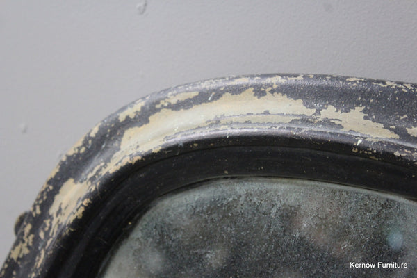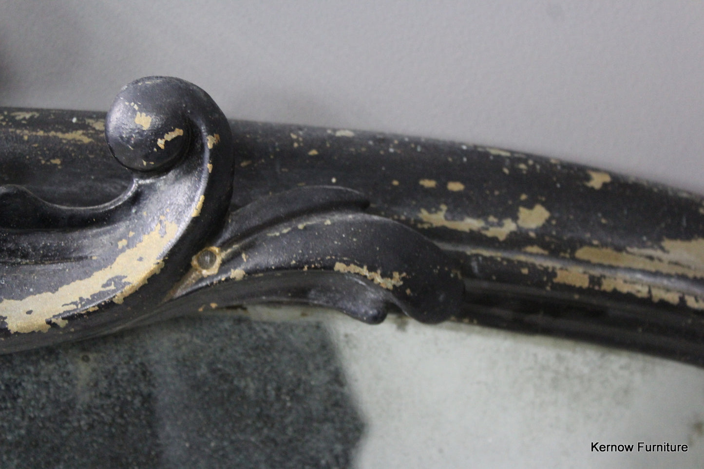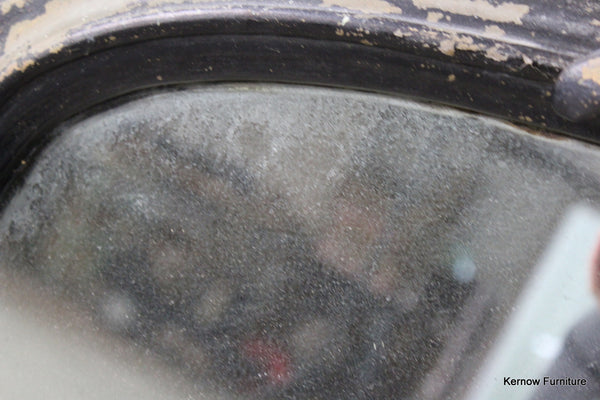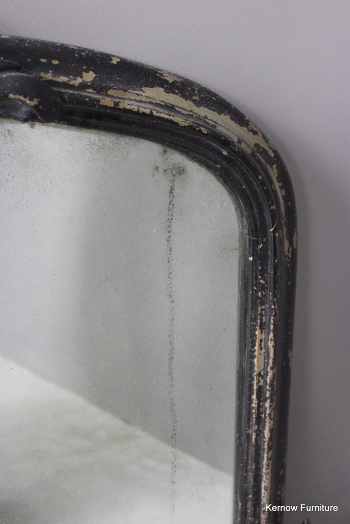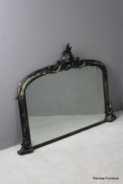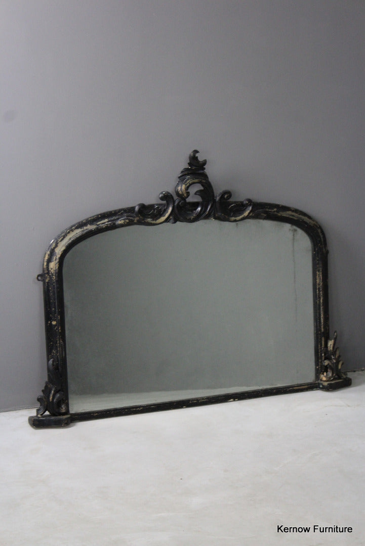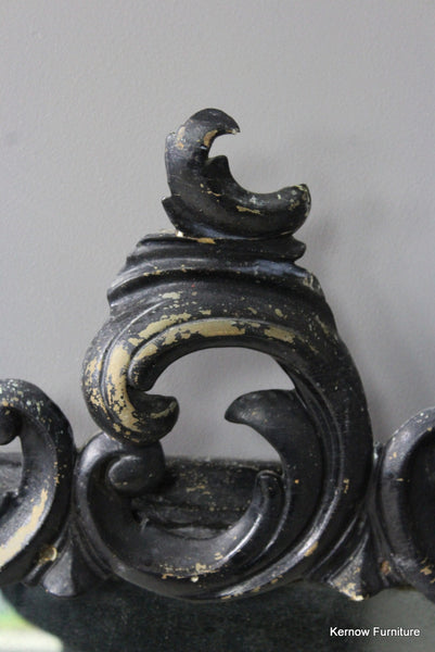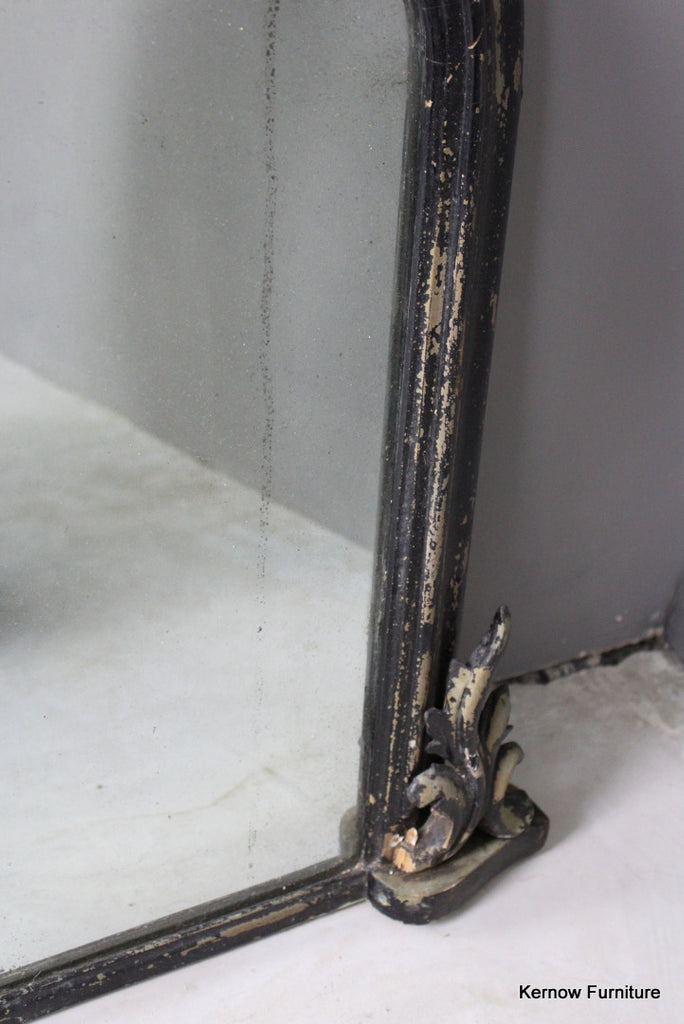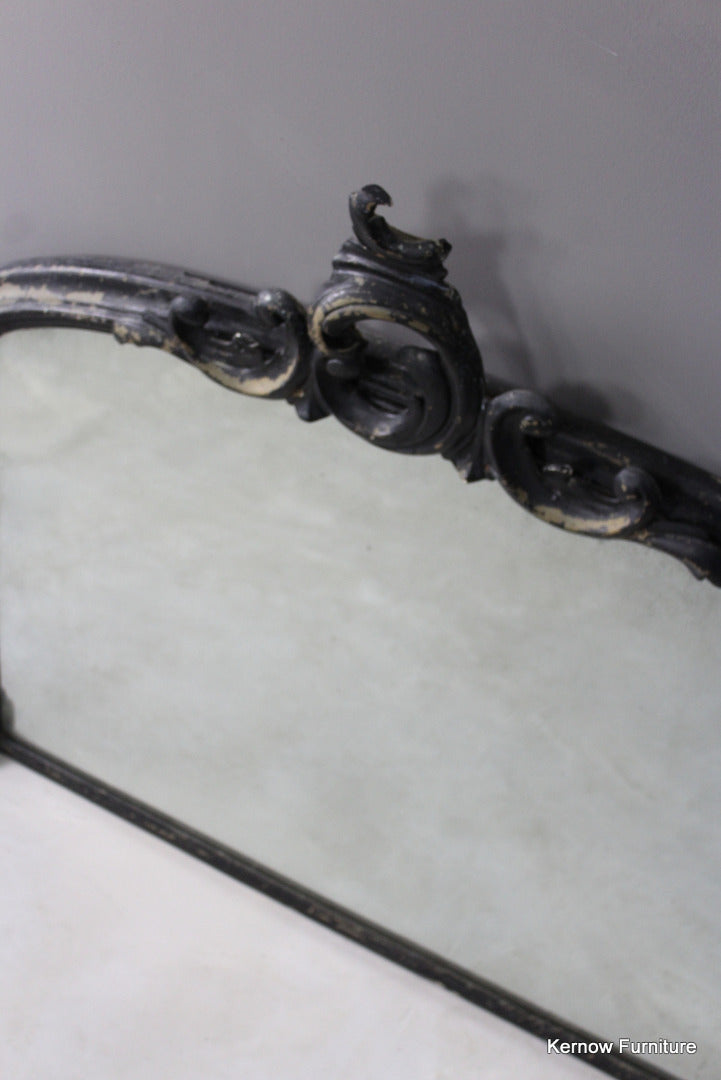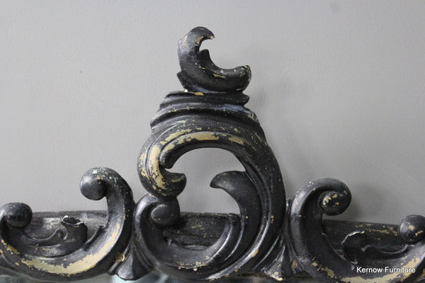 Black Victorian ornate overmantle mirror. Antique overmantle with carved scrolled crest and supports, distressed black paint finish with foxed glass.