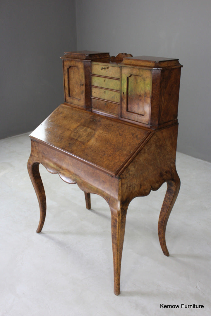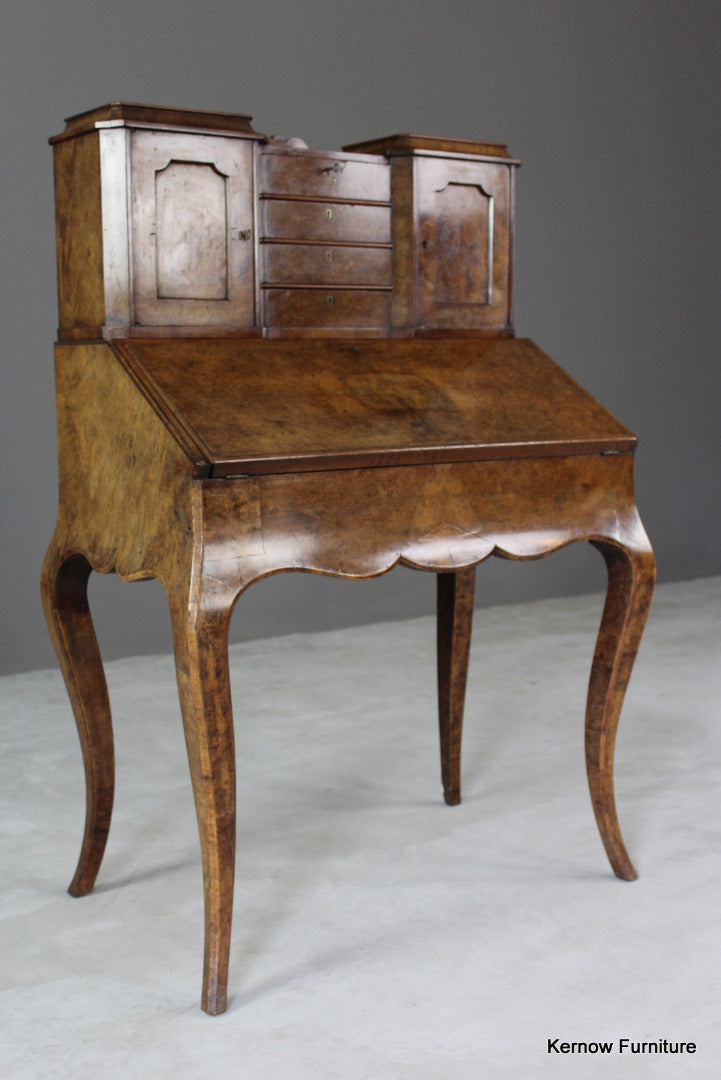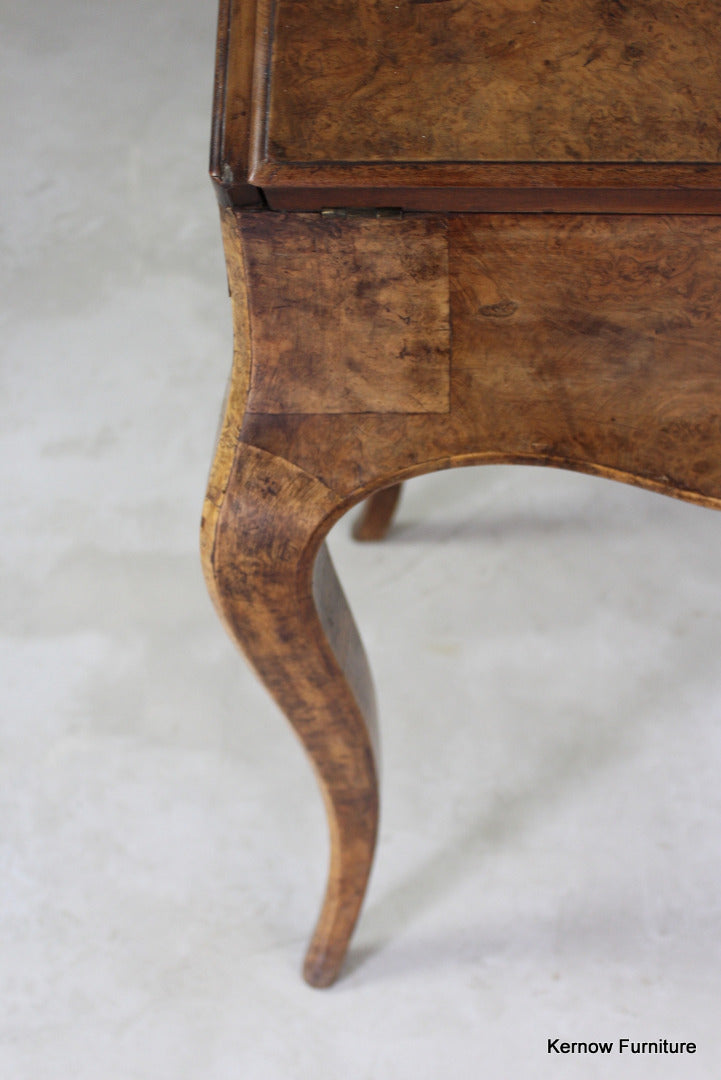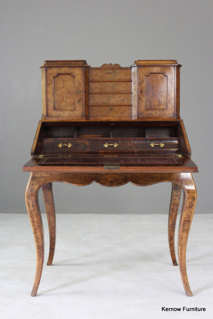 Burr walnut bonheur du jour. Antique early 20th Century small French ladies writing table with four small drawers flanked by cupboards enclosed by panelled doors & lined with faded red velvet, fall front writing surface with red leather inset, fitted interior of 3 small drawers and pigeon holes on cabriol legs.