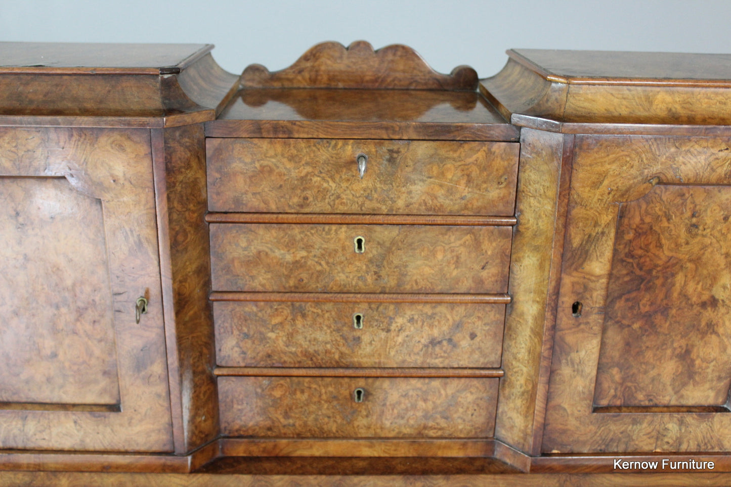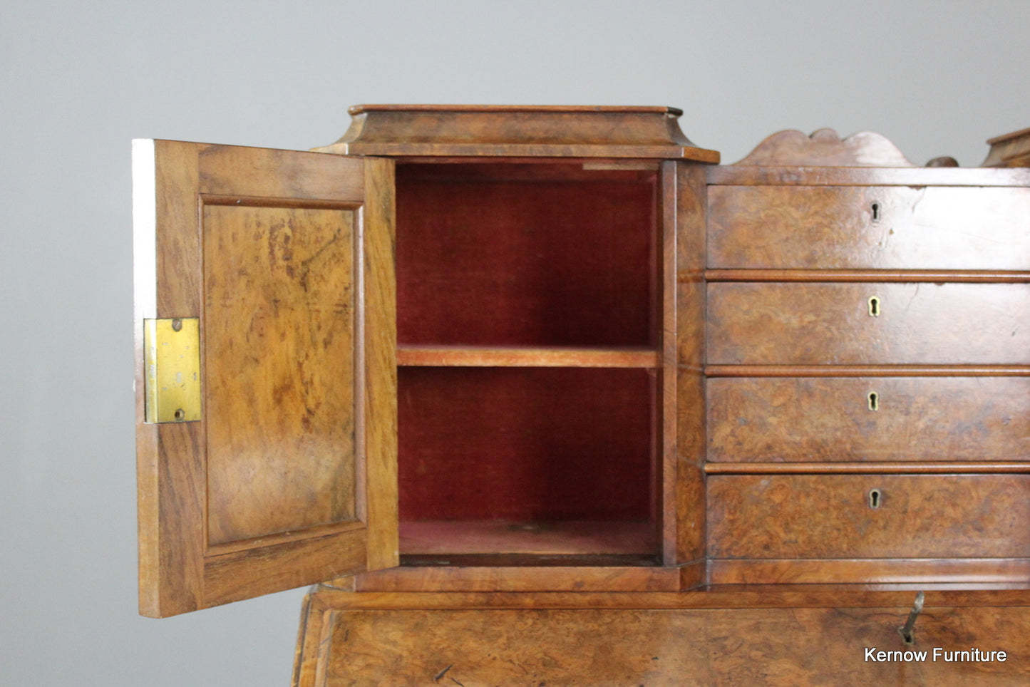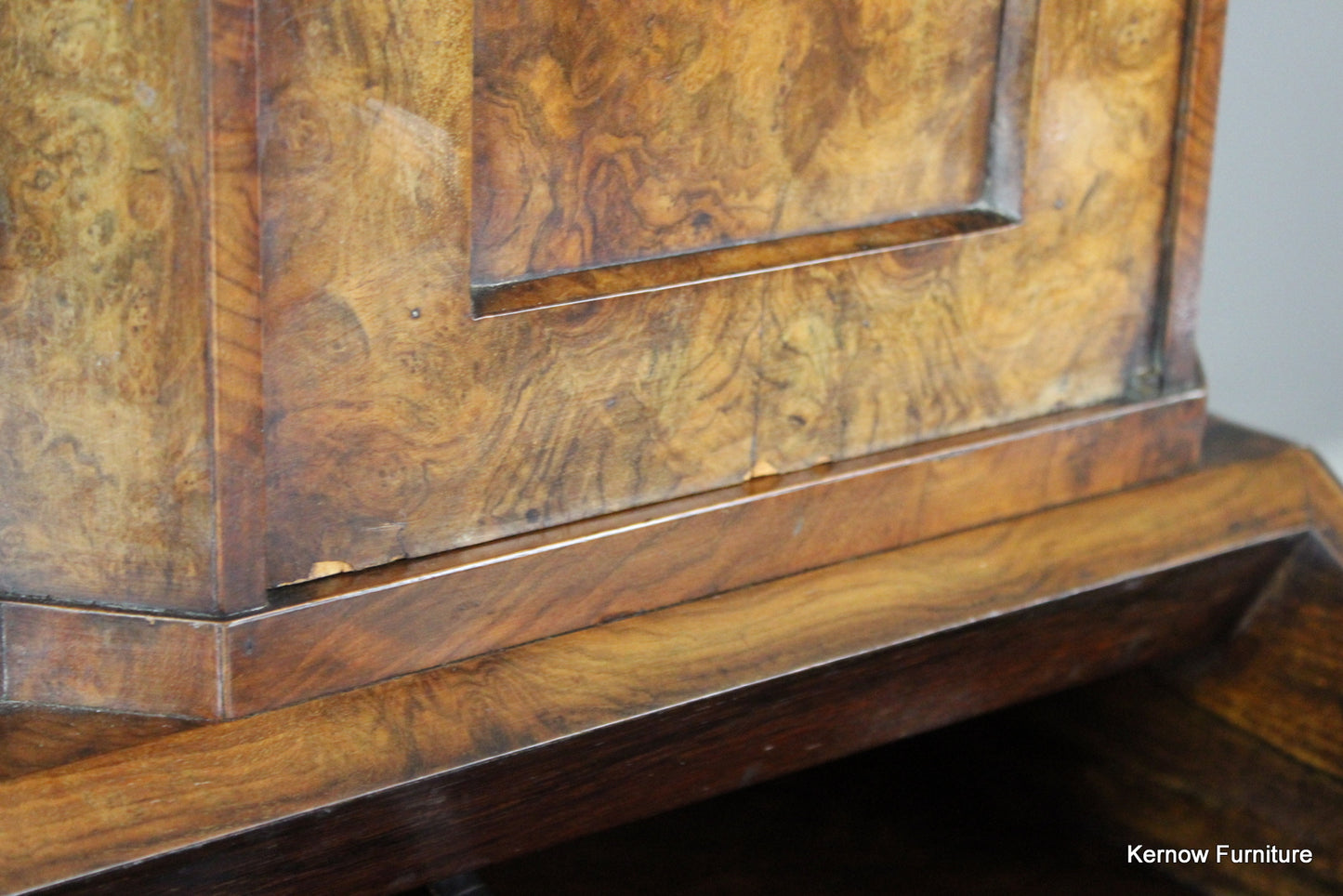 Burr walnut bonheur du jour. Antique early 20th Century small French ladies writing table with four small drawers flanked by cupboards enclosed by panelled doors & lined with faded red velvet, fall front writing surface with red leather inset, fitted interior of 3 small drawers and pigeon holes on cabriol legs.
