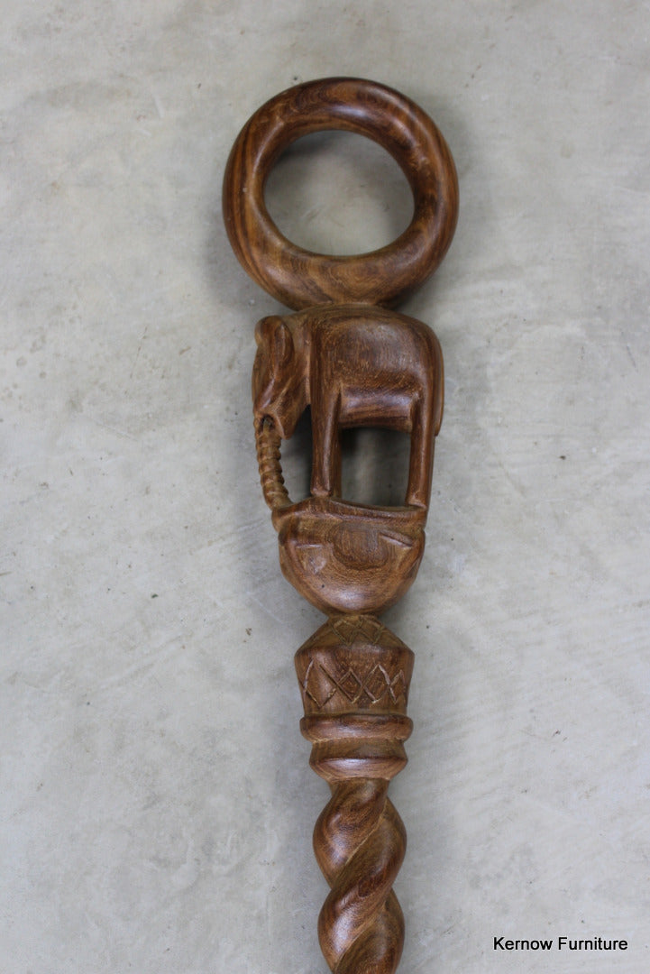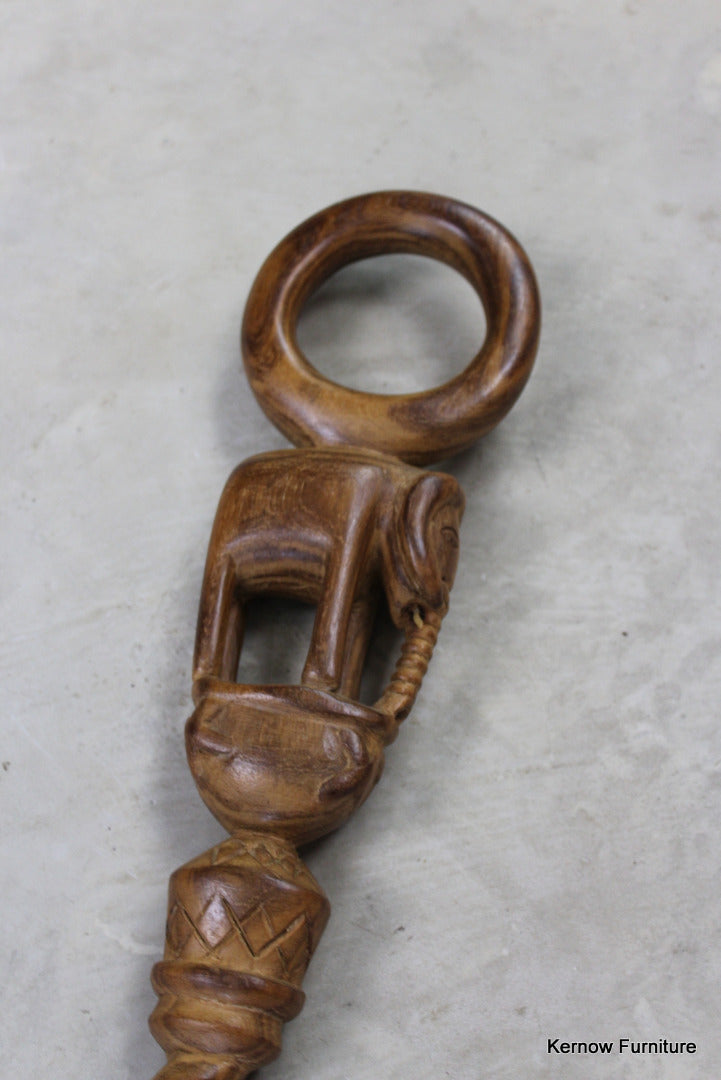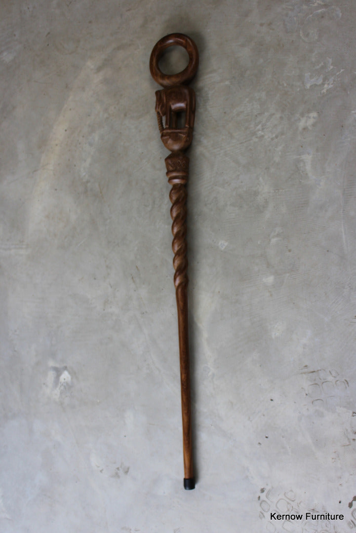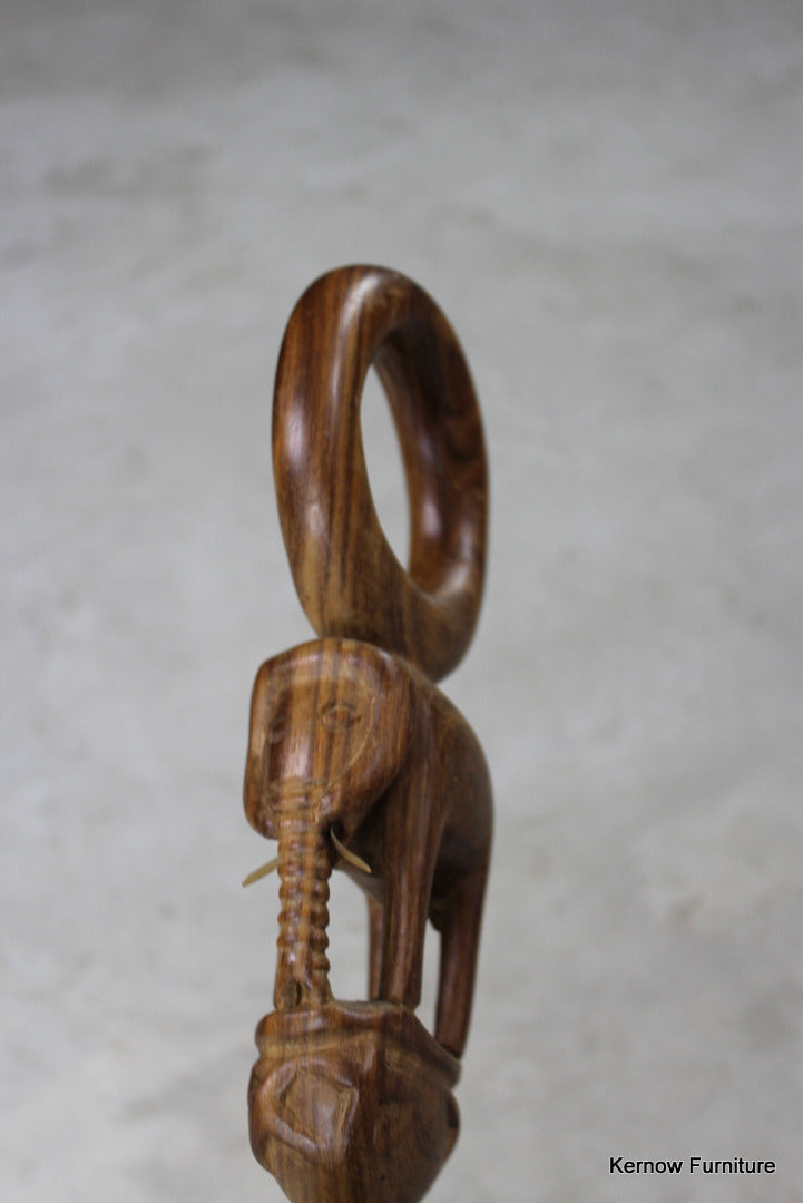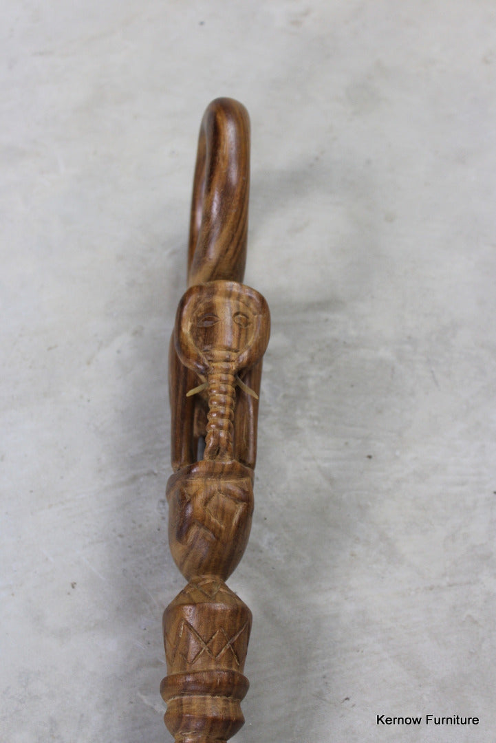 Carved African walking stick. Single piece of wood, hooped handle, elephant and ornate carving.
