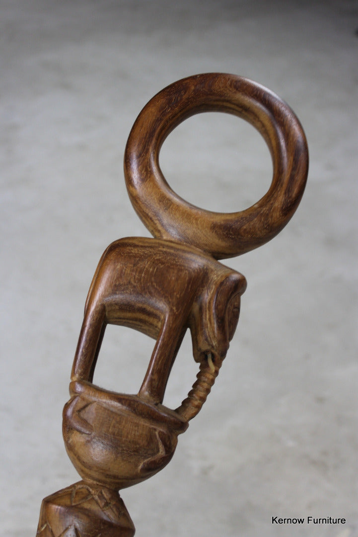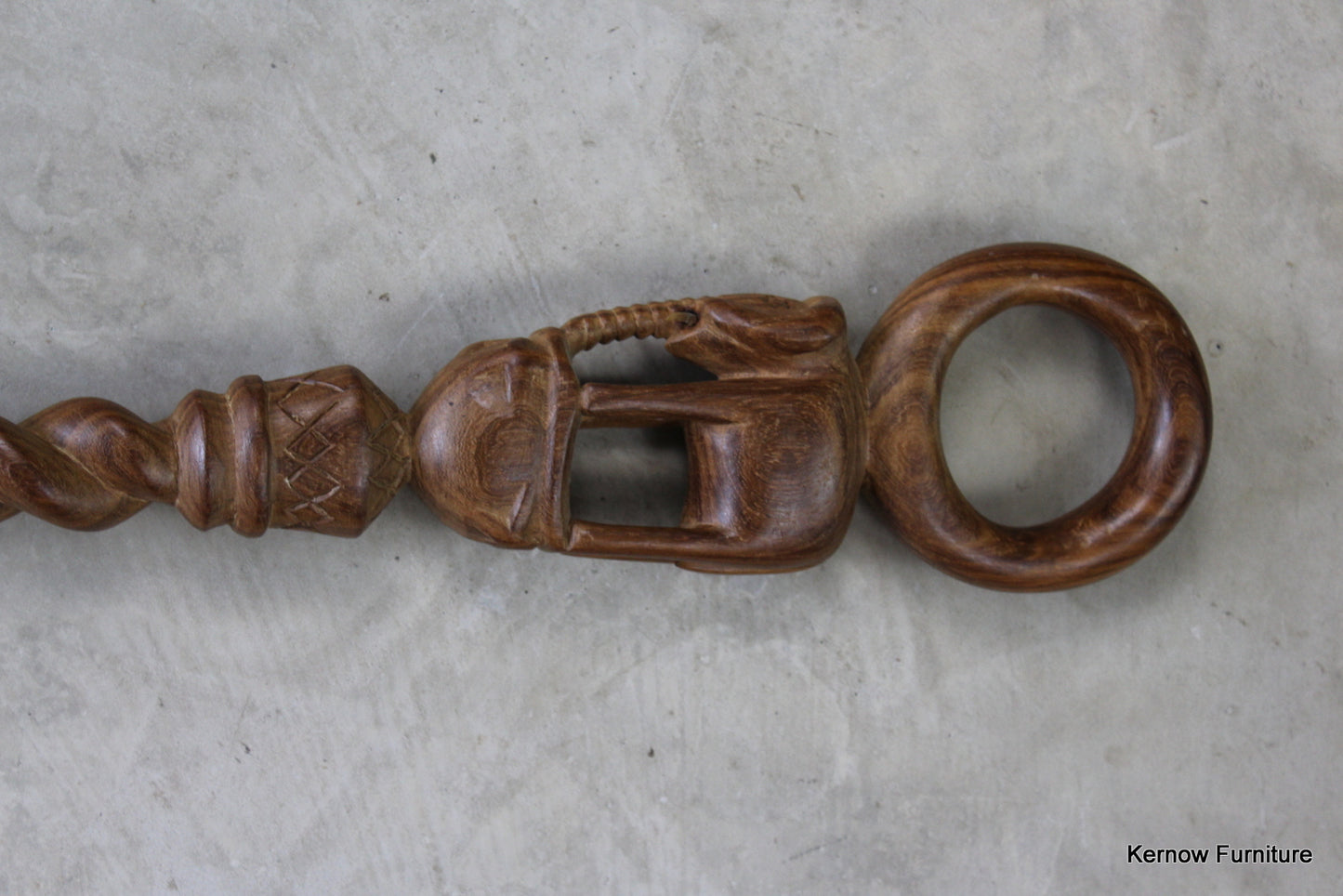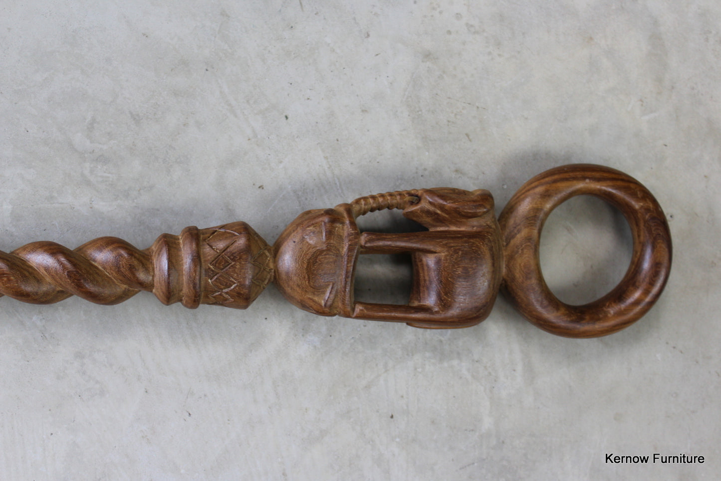 Carved African walking stick. Single piece of wood, hooped handle, elephant and ornate carving.