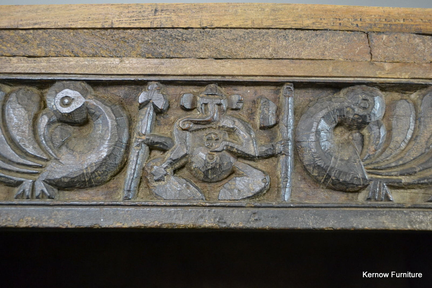 Condition: Lots of age and wear,brackets have been added to the legs which are a little weak, various repairs - some panels of wood have been replaced, the legs have evidence of filler.