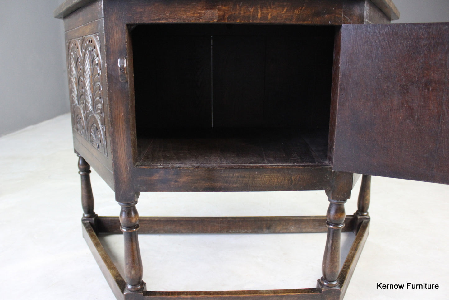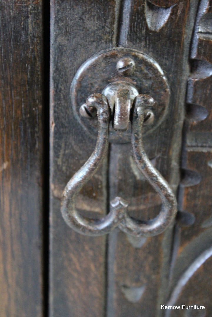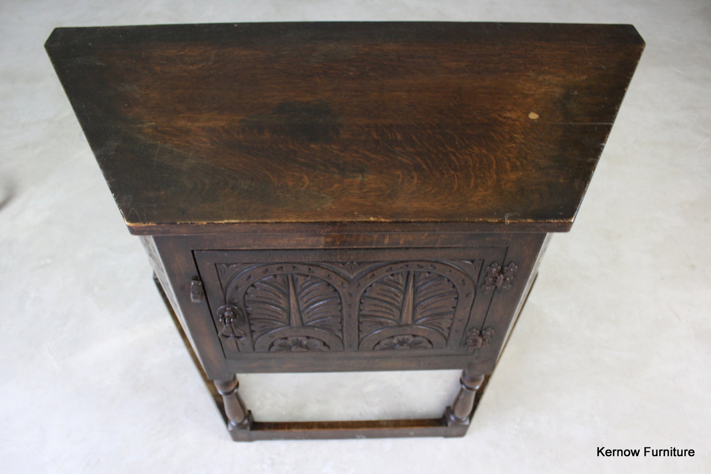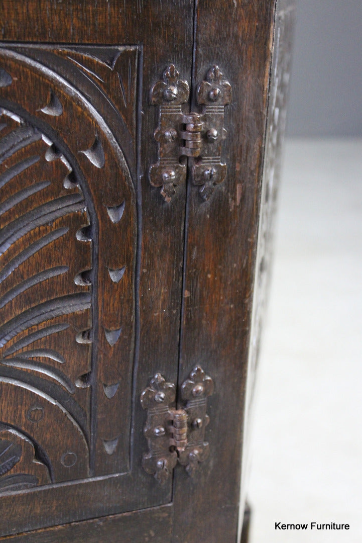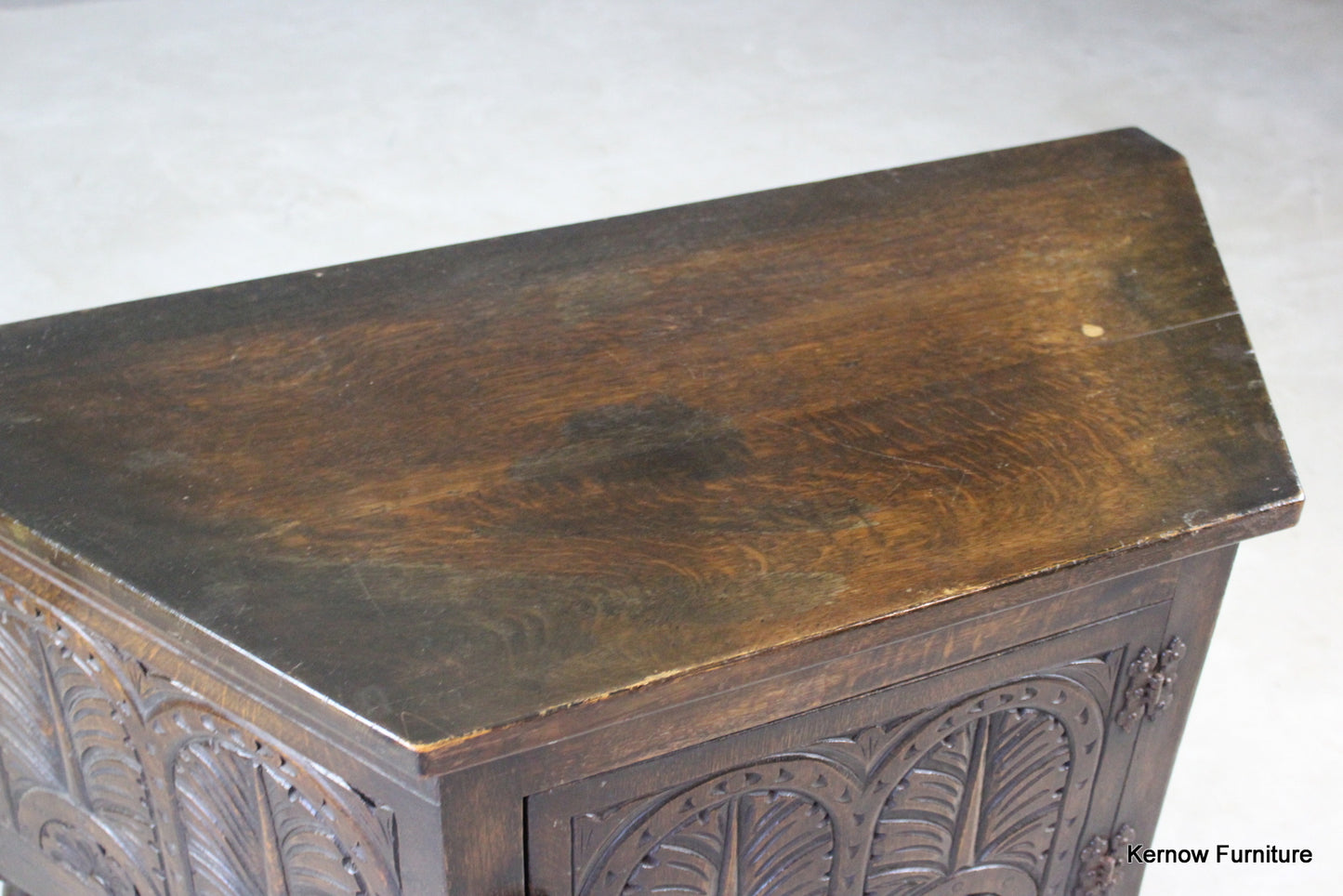 Carved oak cupboard. Solid oak side cupboard with carved decoration, small central door on turned and block legs.