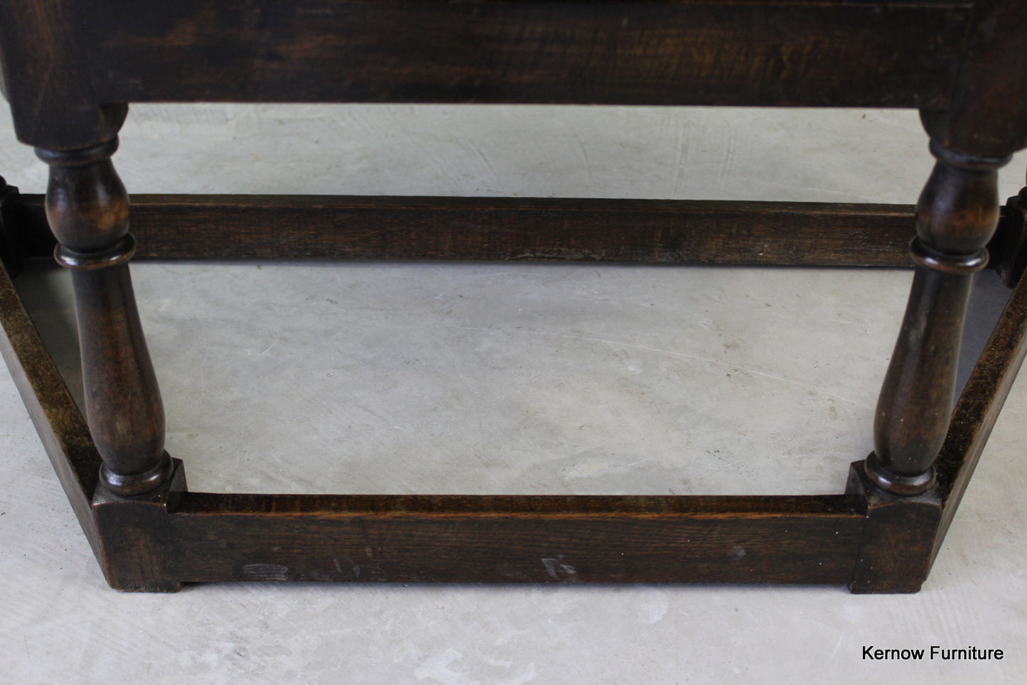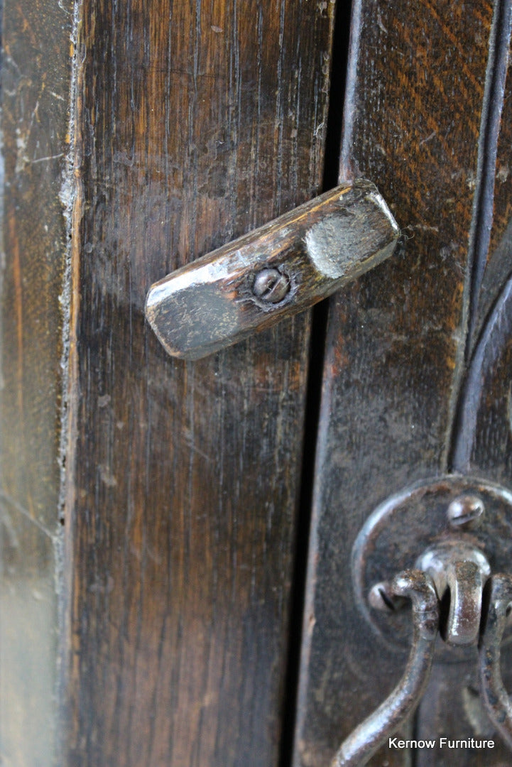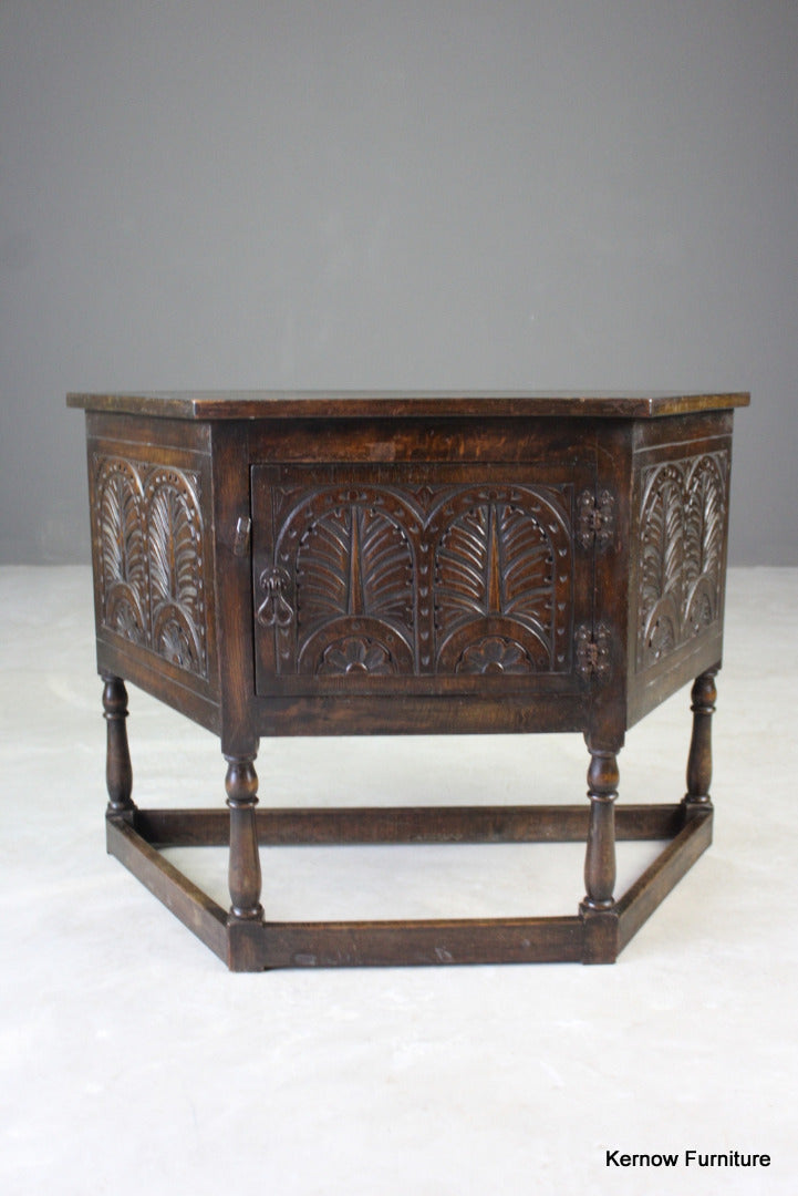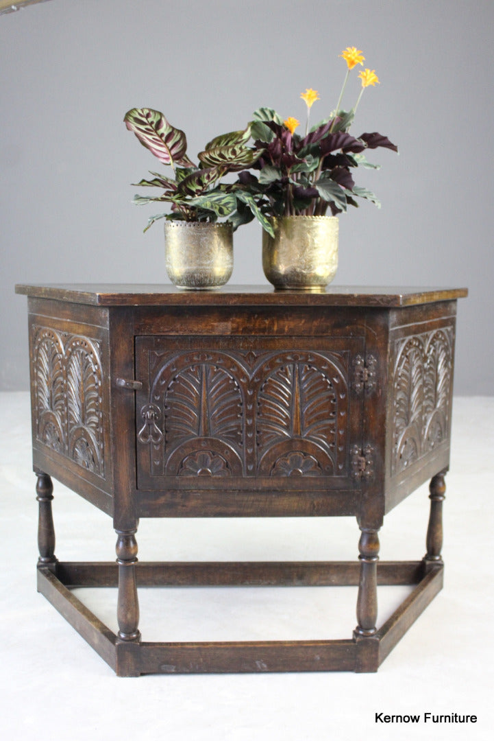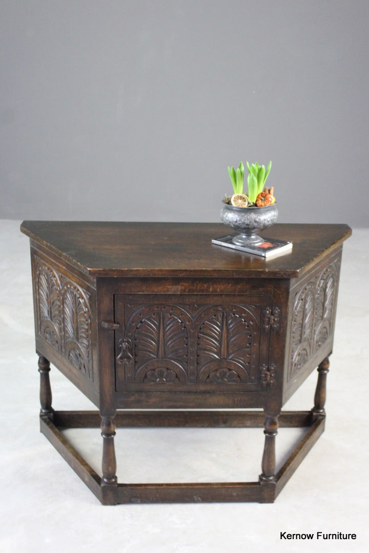 Carved oak cupboard. Solid oak side cupboard with carved decoration, small central door on turned and block legs.