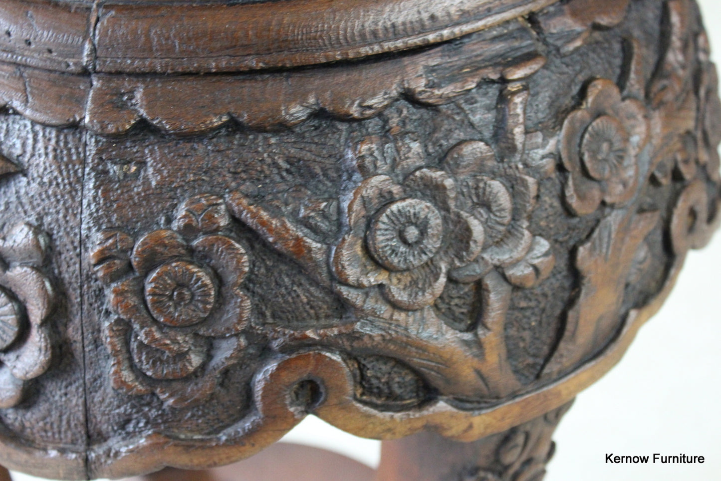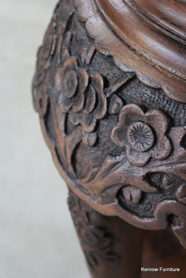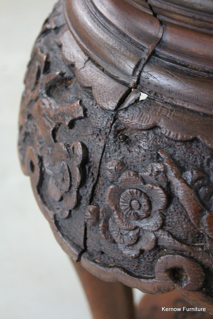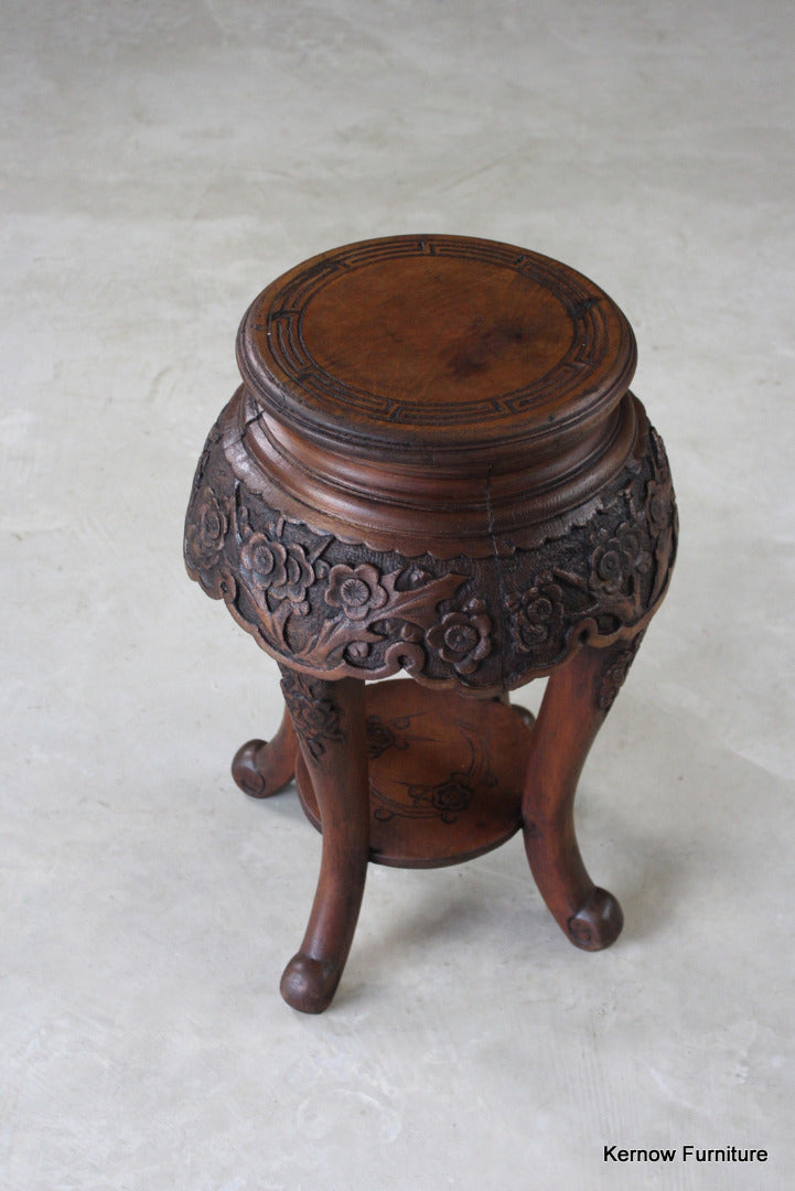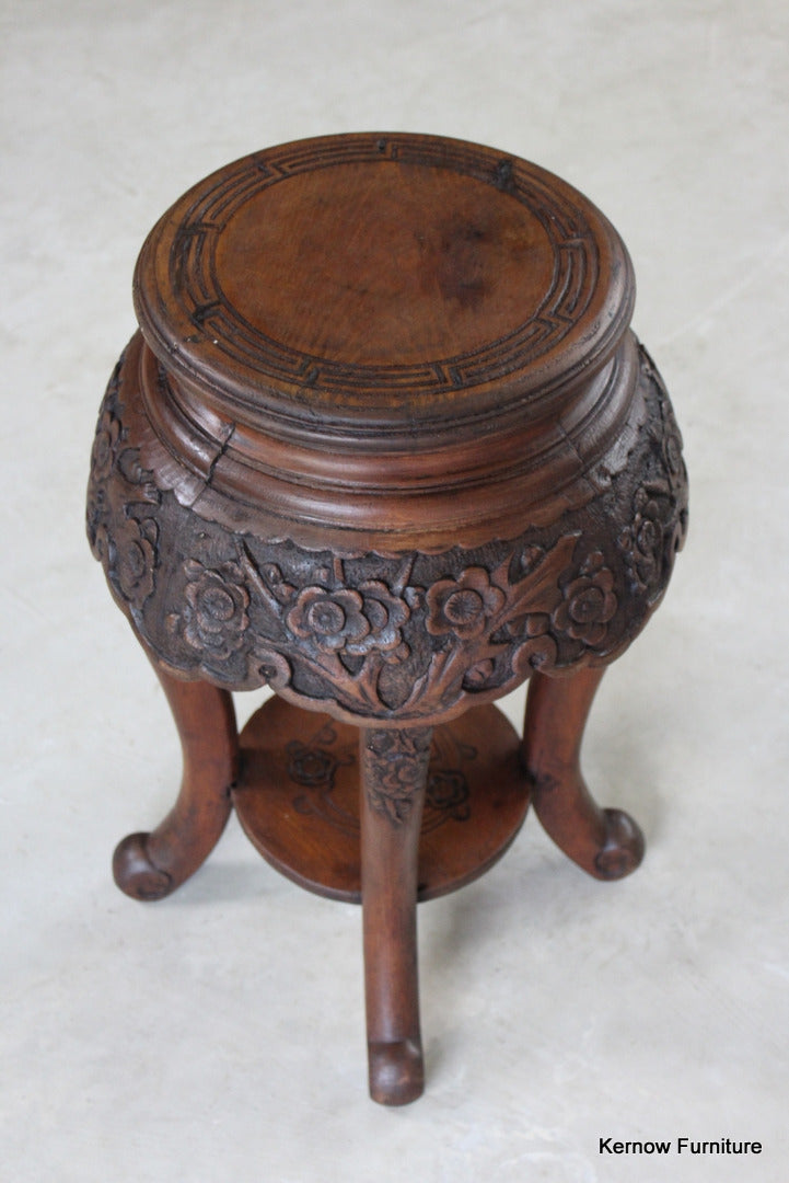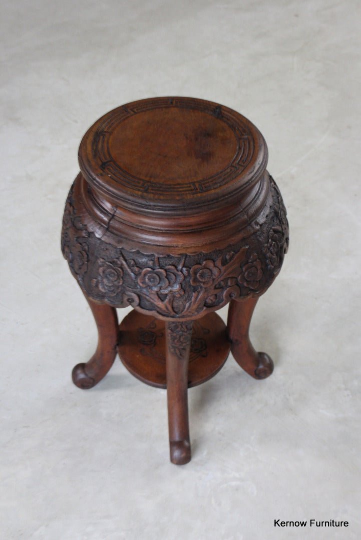 Chinese plant stand. Antique small round hard wood Chinese plant stand with floral carved decoration on short outswept legs.