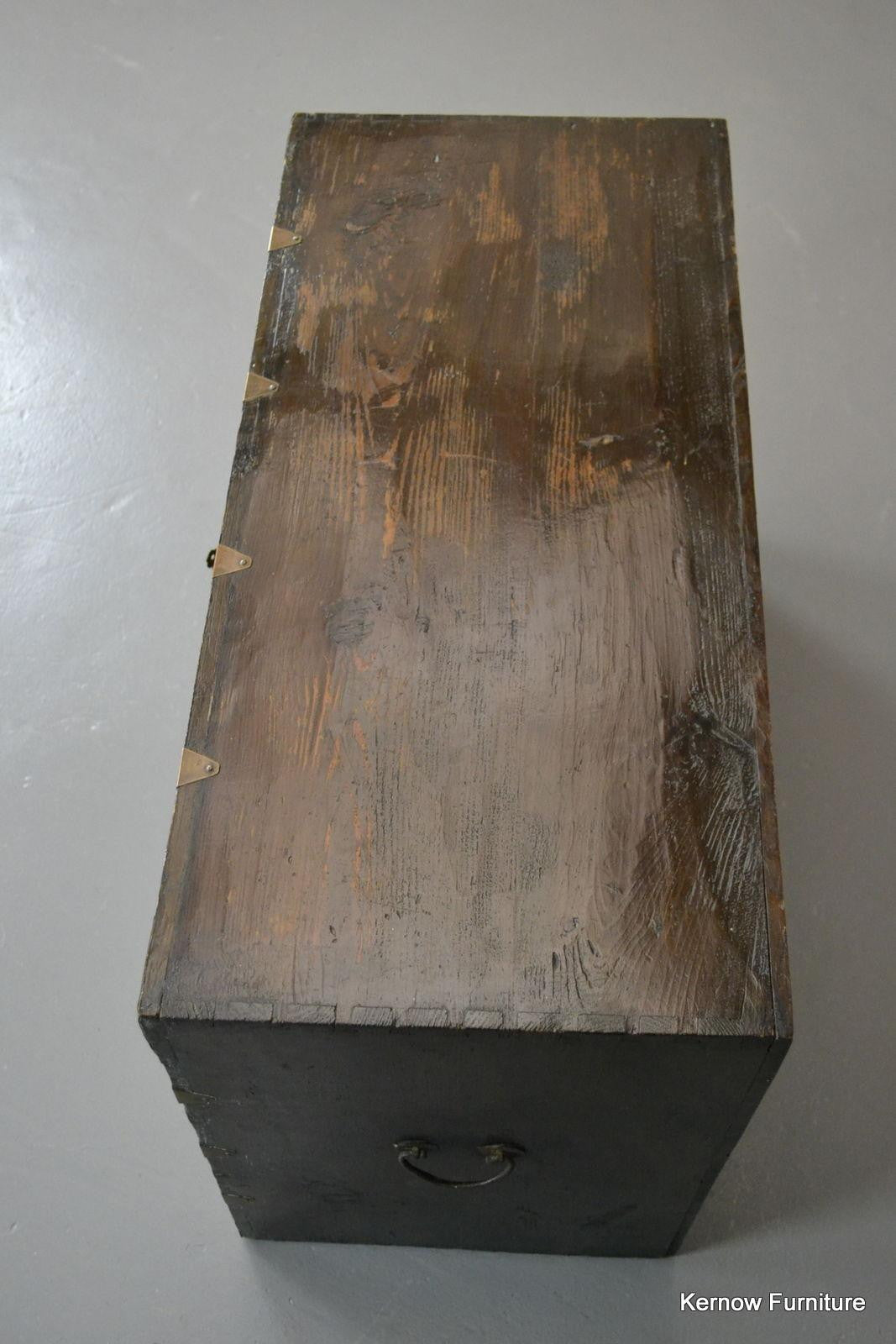 20th Century Chinese storage chest. Stained pine with brass mounts and pair of small doors to the front.