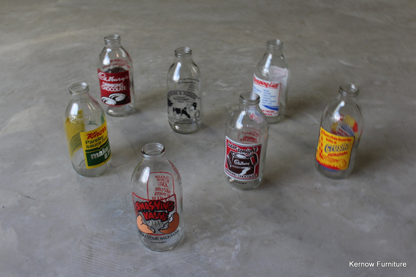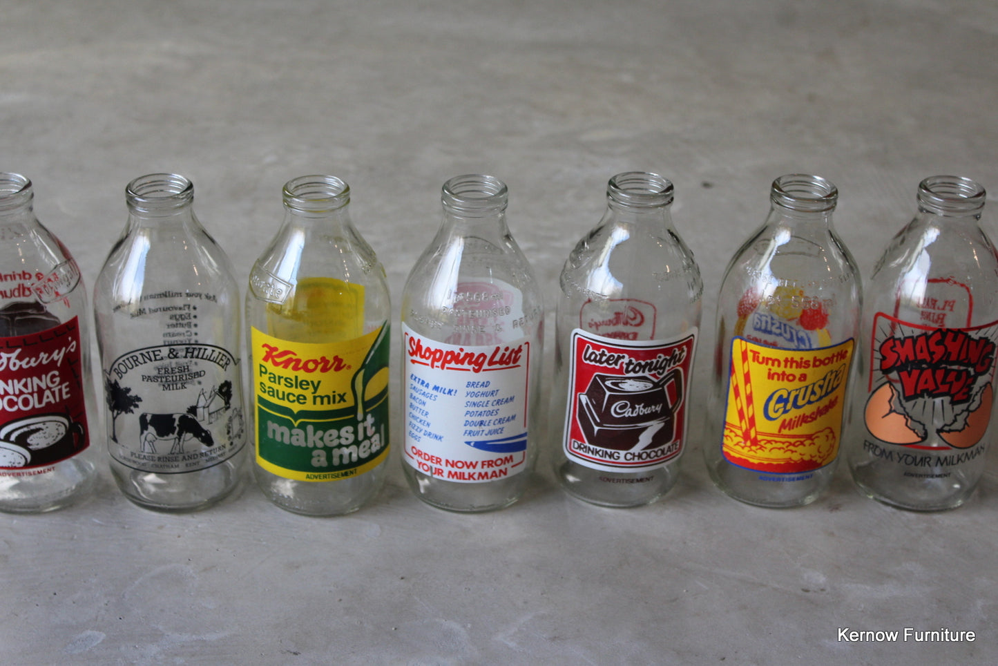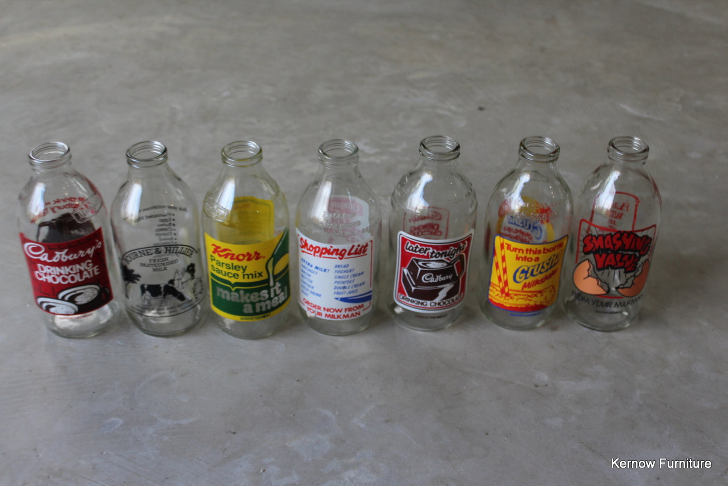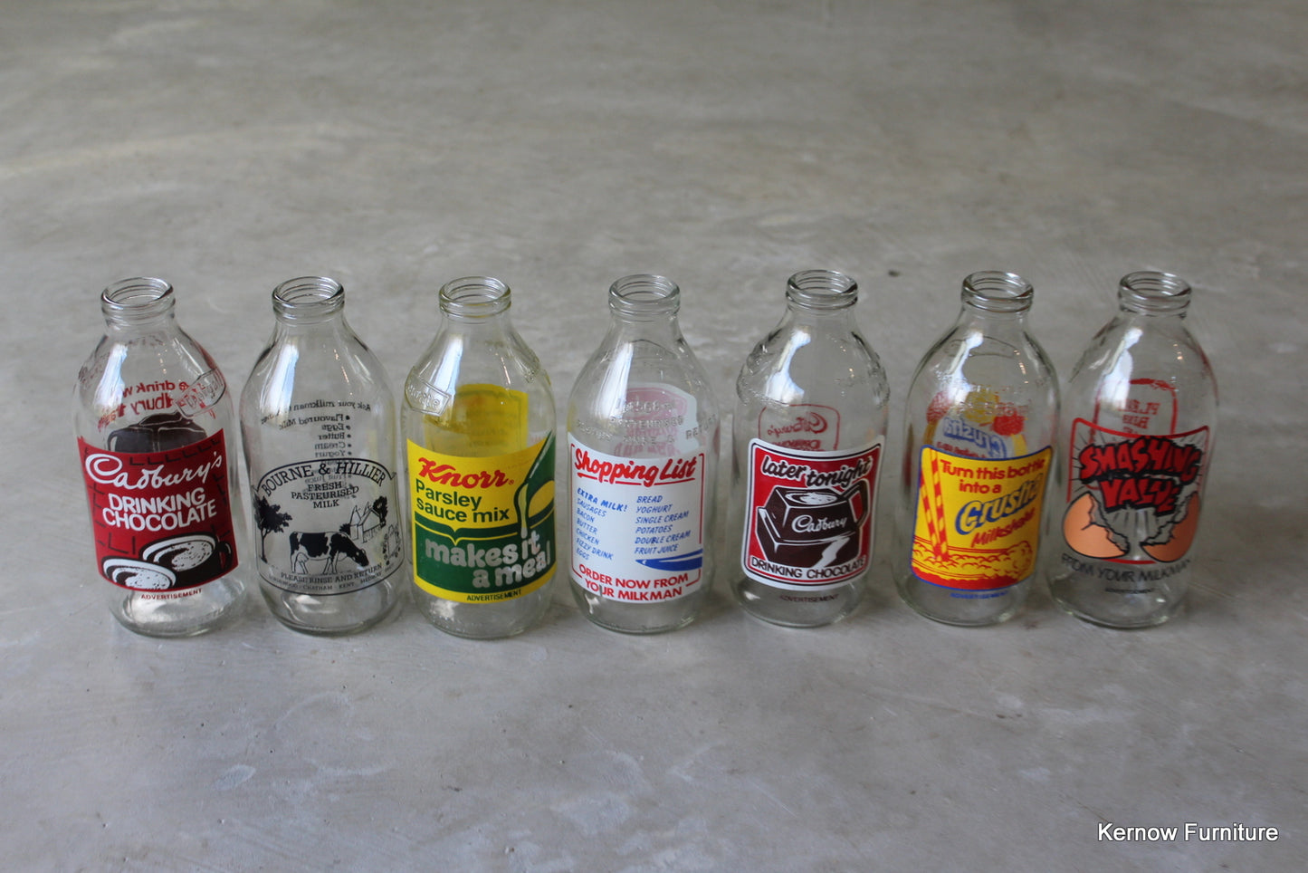 Collection 7 retro glass milk bottles. Branded glass 1 pint milk bottles.