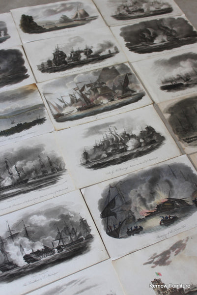 Collection naval battle engravings. 24 antique naval battle & ship engravings from the naval chronicle. 24 in total, black and white, some colour.