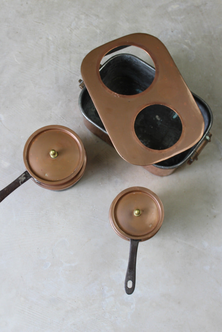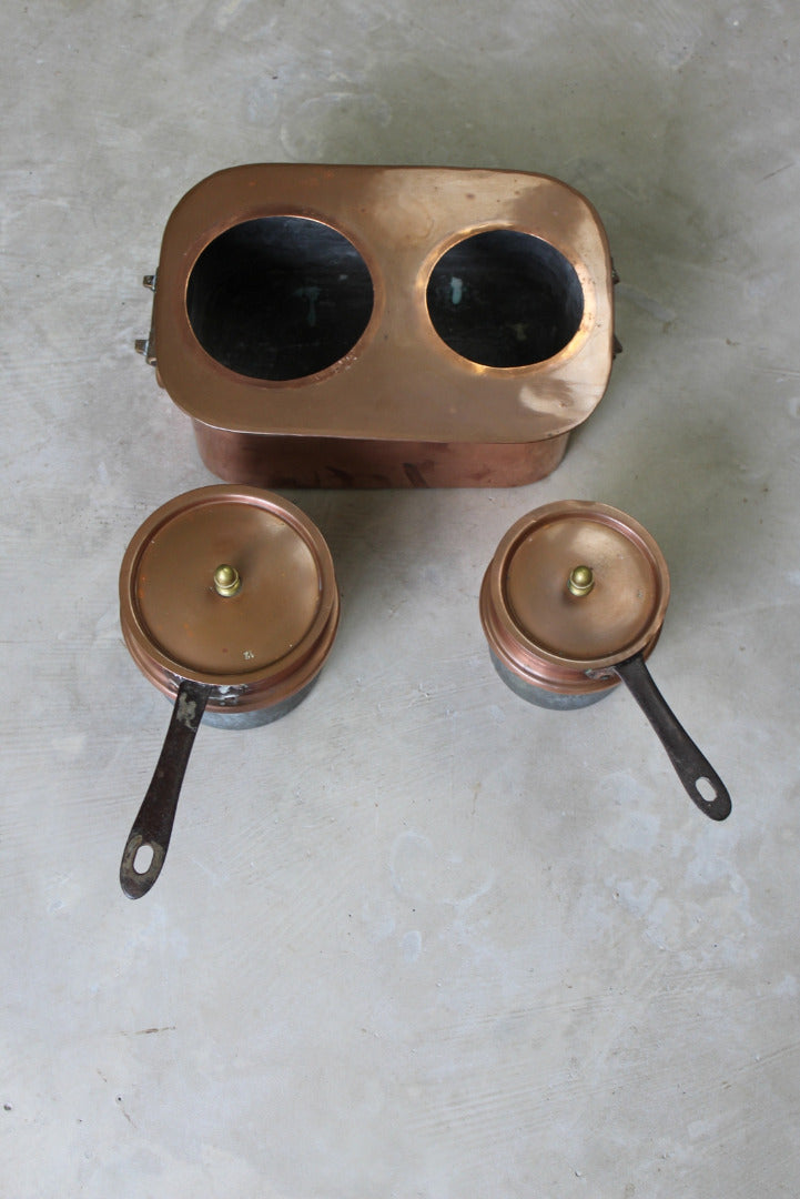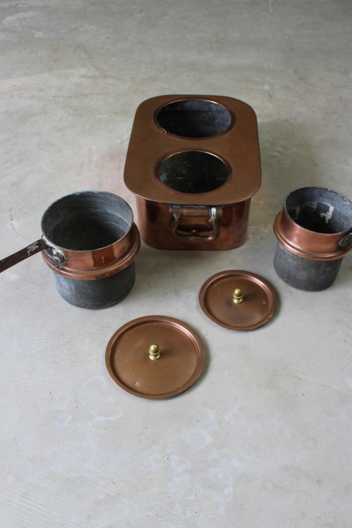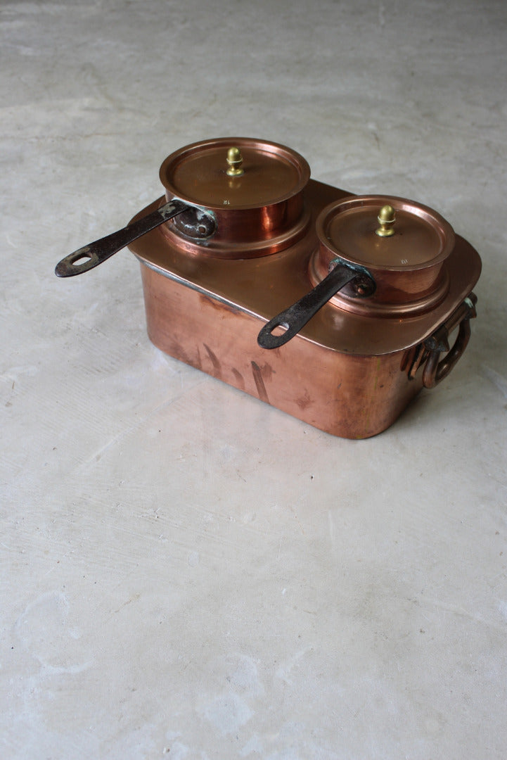 Copper bain marie. Antique copper bain marie with pair handles to the body, 2 small pans with lid and iron handle.