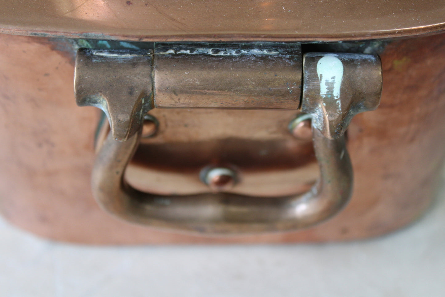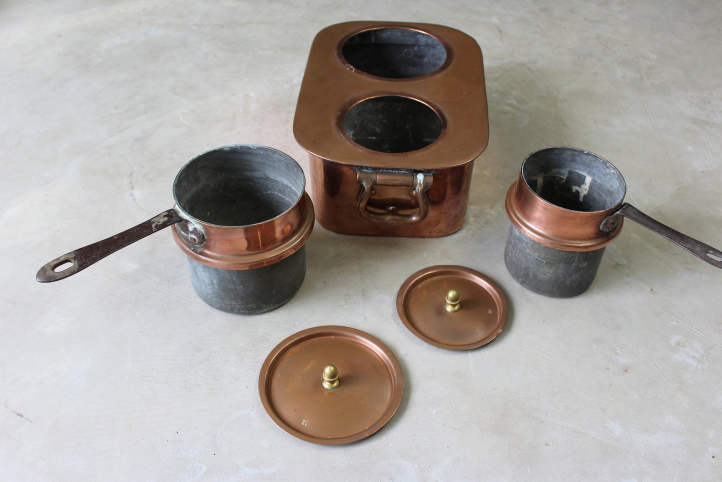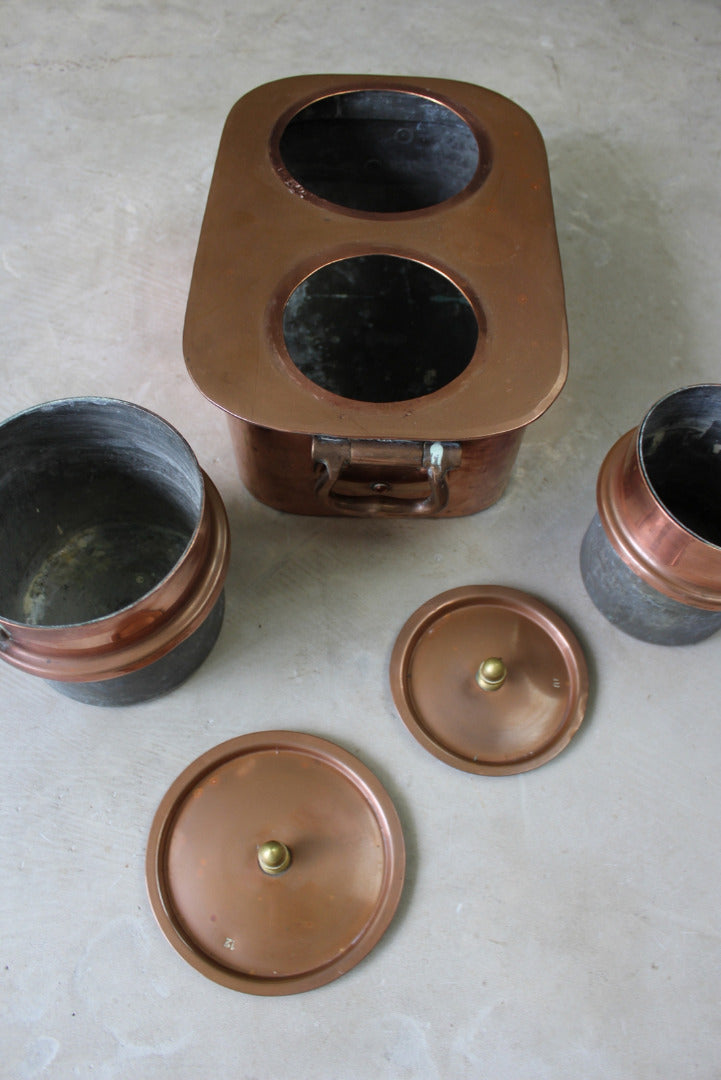 Copper bain marie. Antique copper bain marie with pair handles to the body, 2 small pans with lid and iron handle.