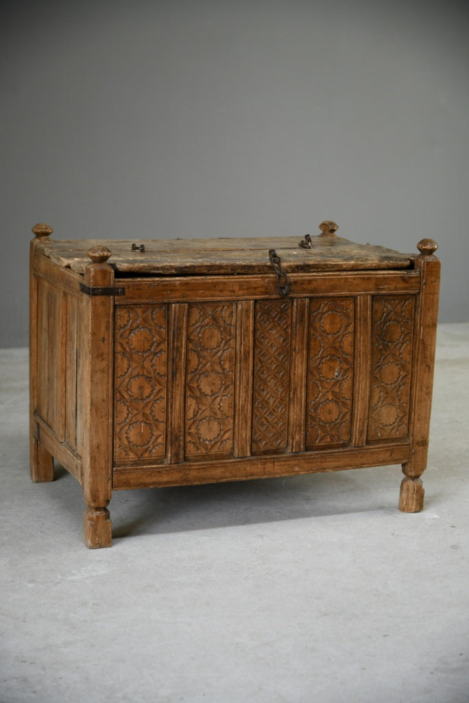 Eastern Dowry Chest. 19th Century Eastern dowry chest, probably from Pakistan, The rectangular top with carved finials to each corner with a hinged lid, carved panels to the front, on shaped feet.
